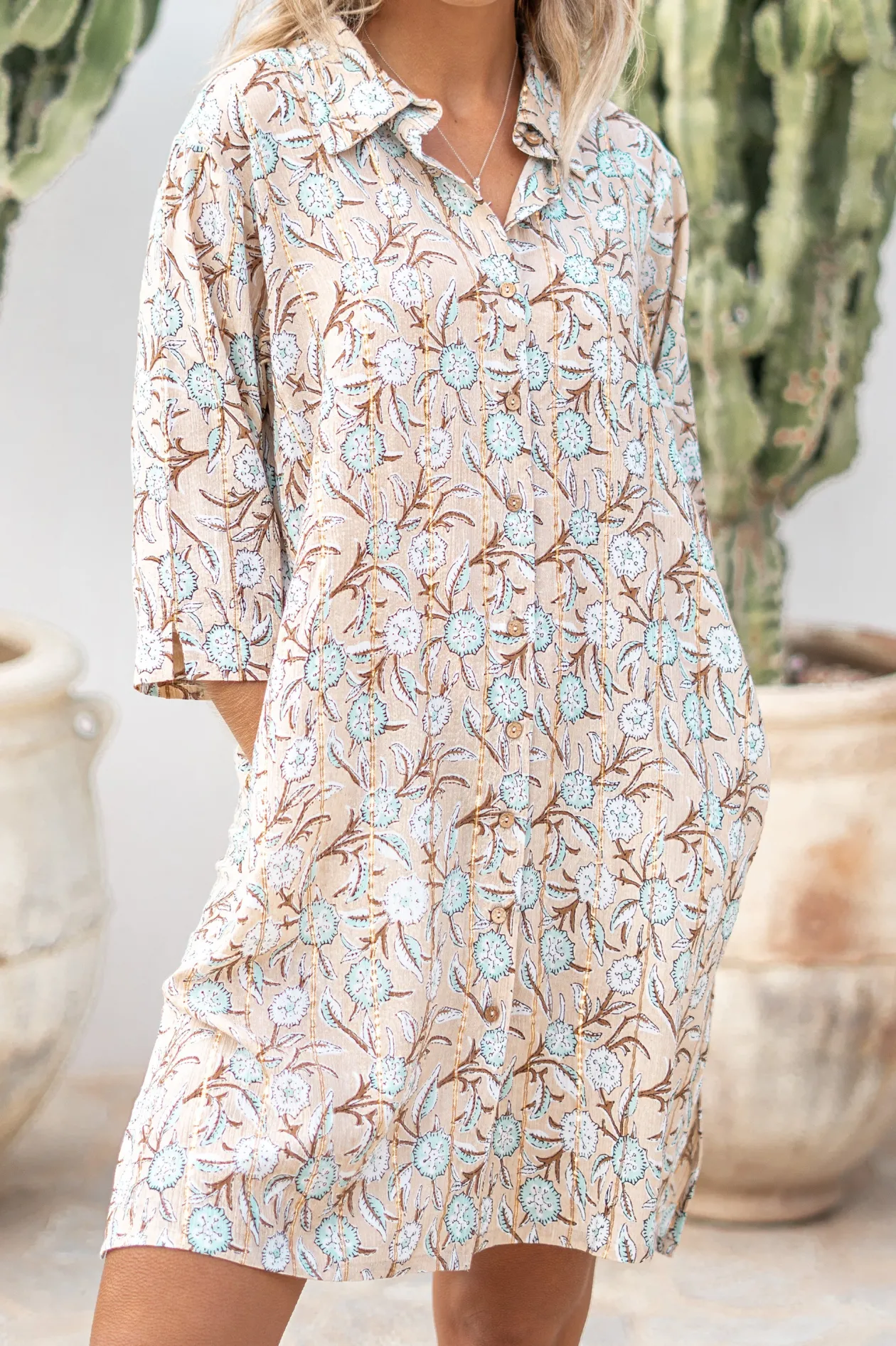 Tritt ein in die Welt der mühelosen Eleganz mit der Bluse Aletta Flower Sand. Diese Bluse aus 100% Viskose kombiniert einen zarten Blumenprint mit schimmernden Lurexfäden für einen funkelnden Touch. Trage sie zu deiner Lieblingsjeans oder einem schmissigen Rock und spüre die Ibiza-Vibes in jedem Faden.