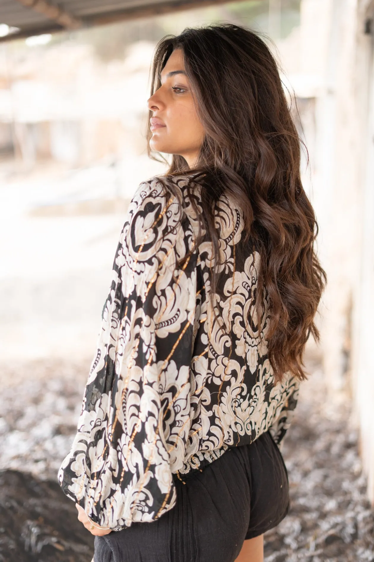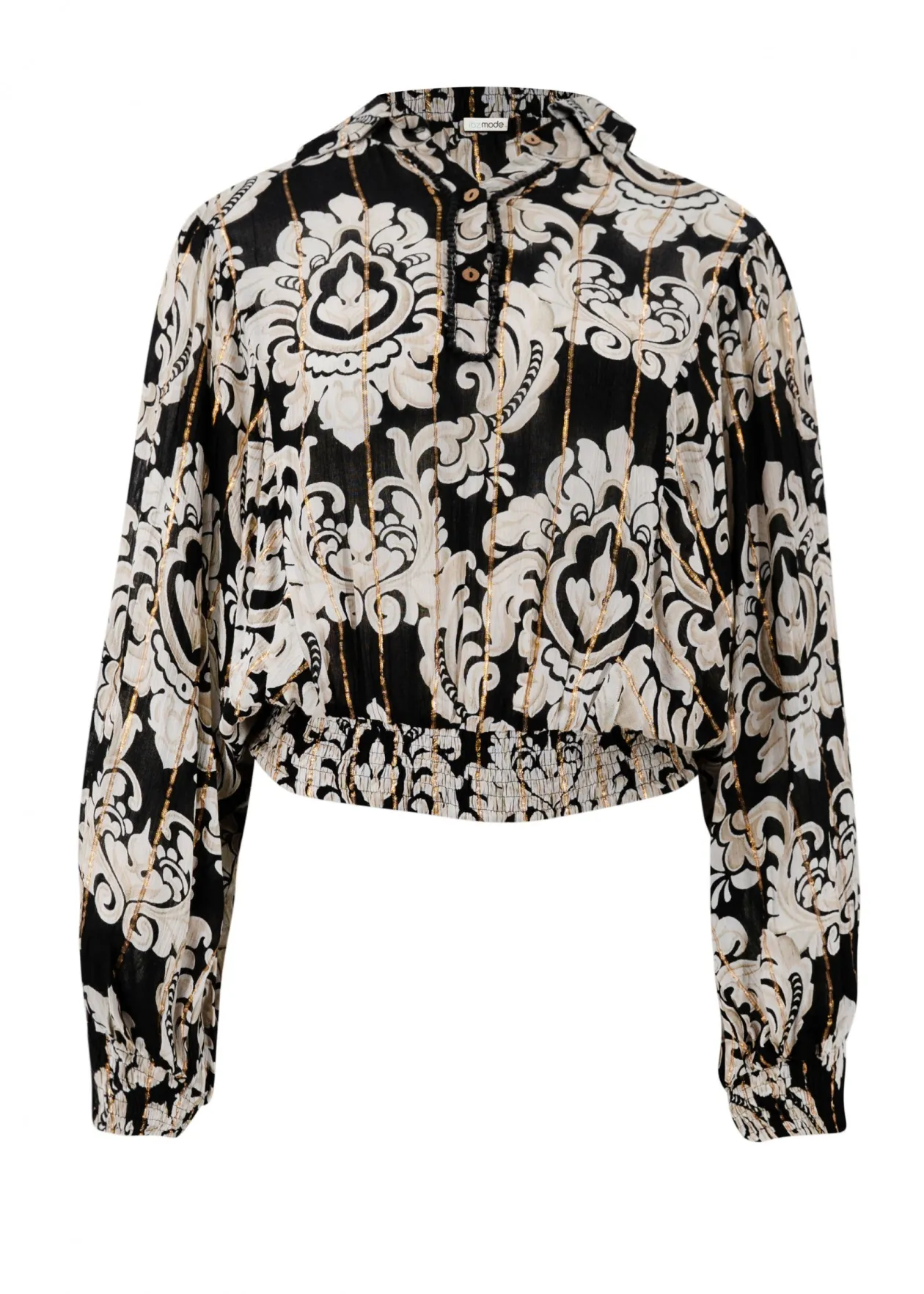Entdecke die Bluse Briso Baroque Black Print, ein Statement-Piece, das Luxus und Flair ausstrahlt. Mit ihrem goldenen Lurexgarn und dem Barock-Print ist diese Bluse perfekt für einen Abend im Freien. Kombiniere sie mit einer eleganten schwarzen Hose und hohen Schuhen für einen unvergesslichen Look. Zeig deinen Stil und glänze!