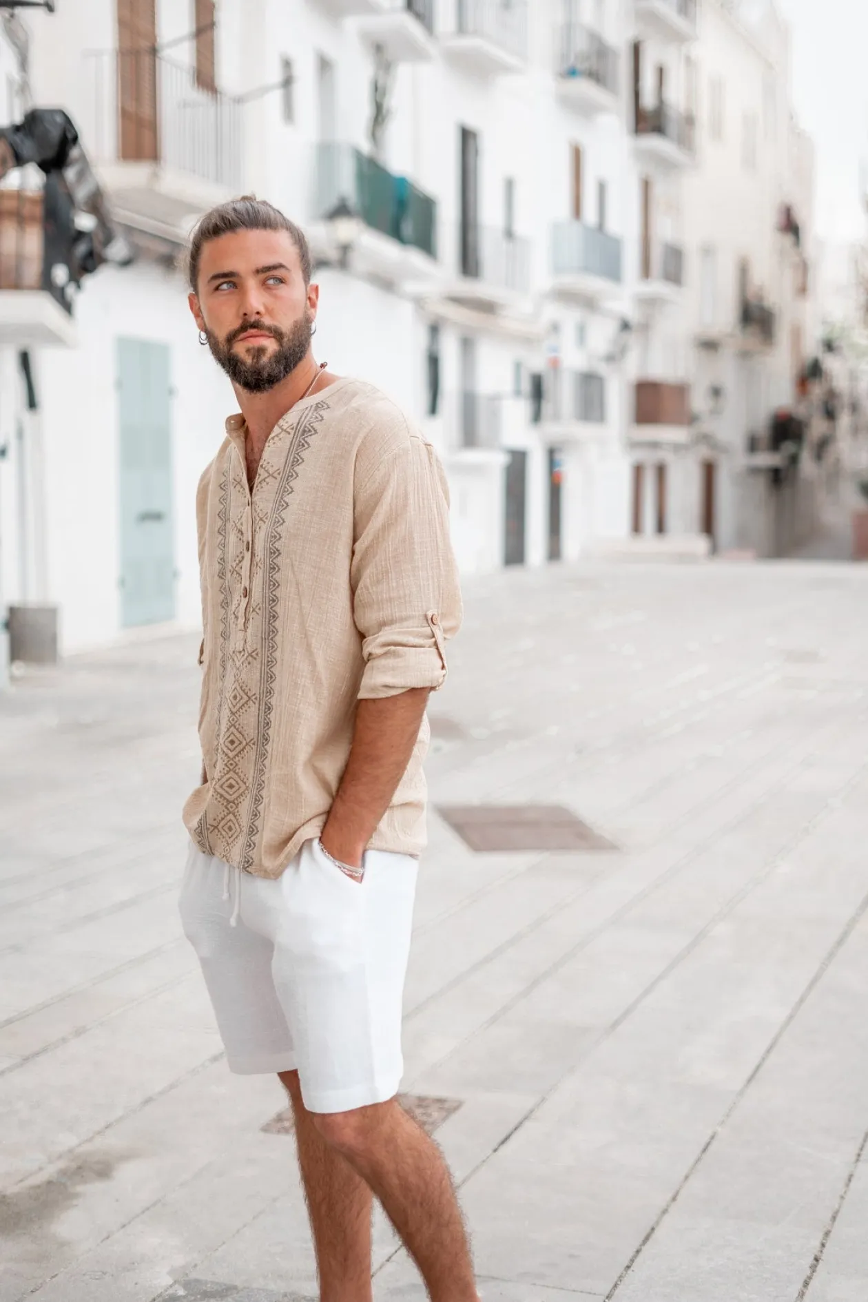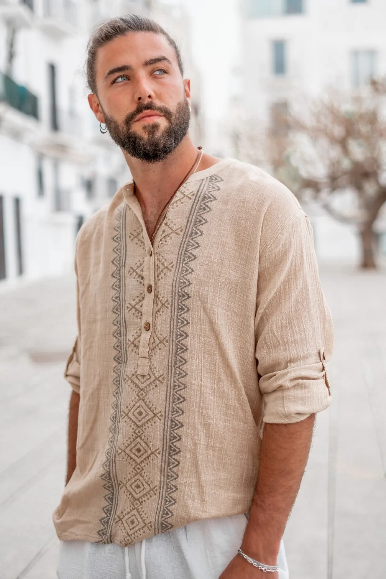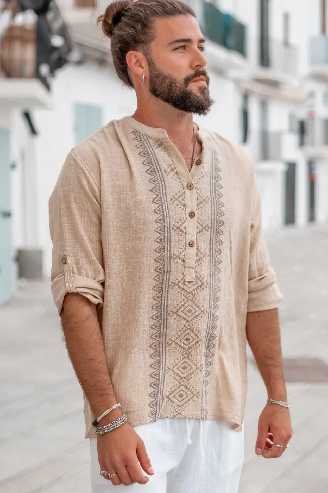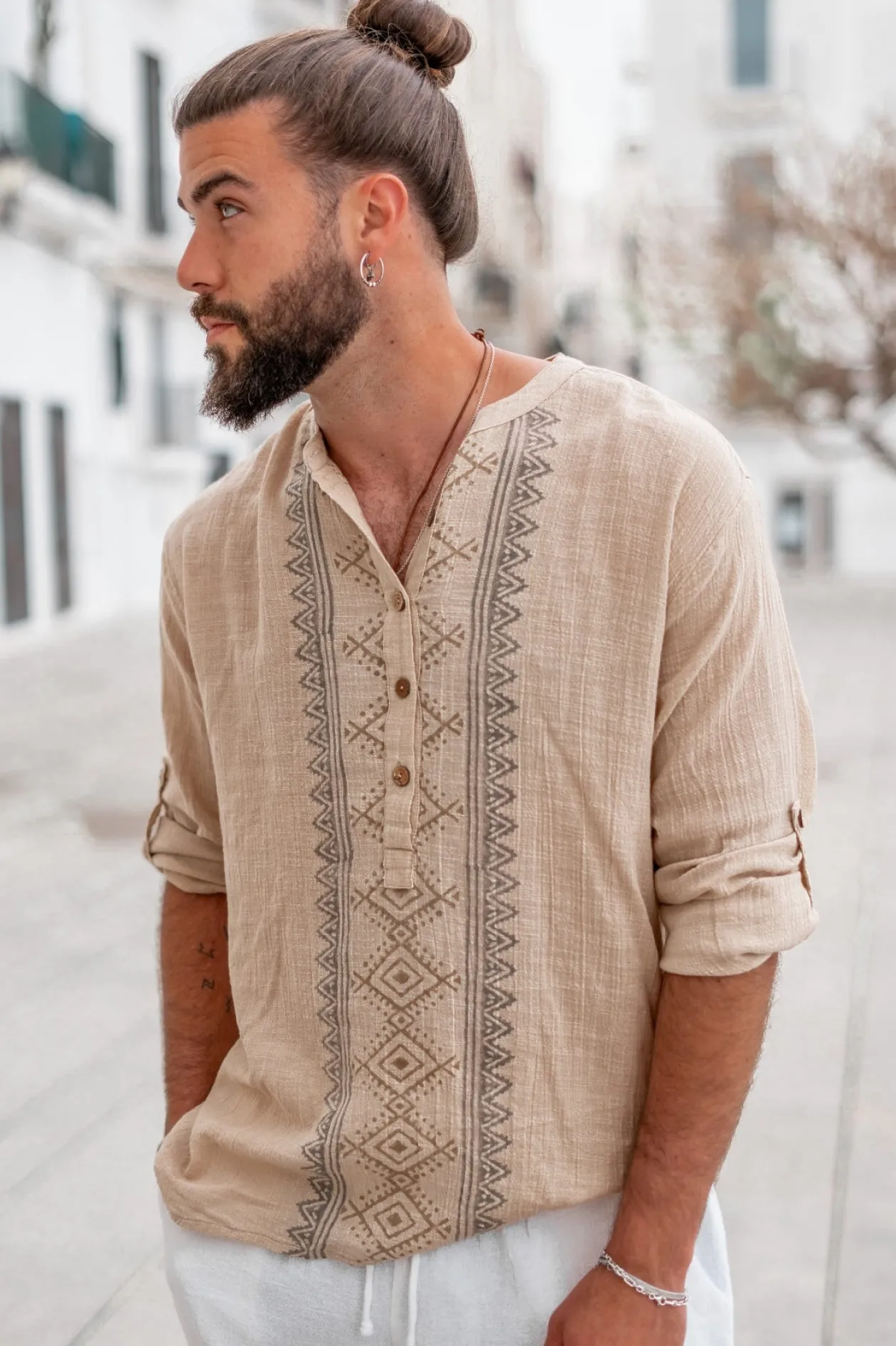 Entdecke die Bluse Javi Sand, ein ultimatives Must-have für jede Fashionista! Diese Bluse aus 100% Baumwolle bietet einen luftigen und bequemen Sitz. Der handgestempelte Druck und der Rundhalsausschnitt mit Knöpfen verleihen ihr einen einzigartigen Touch. Trage sie mit gekrempelten Ärmeln für einen lässigen und doch schicken Look. Mach dir deinen Ibiza-Stil zu eigen!
