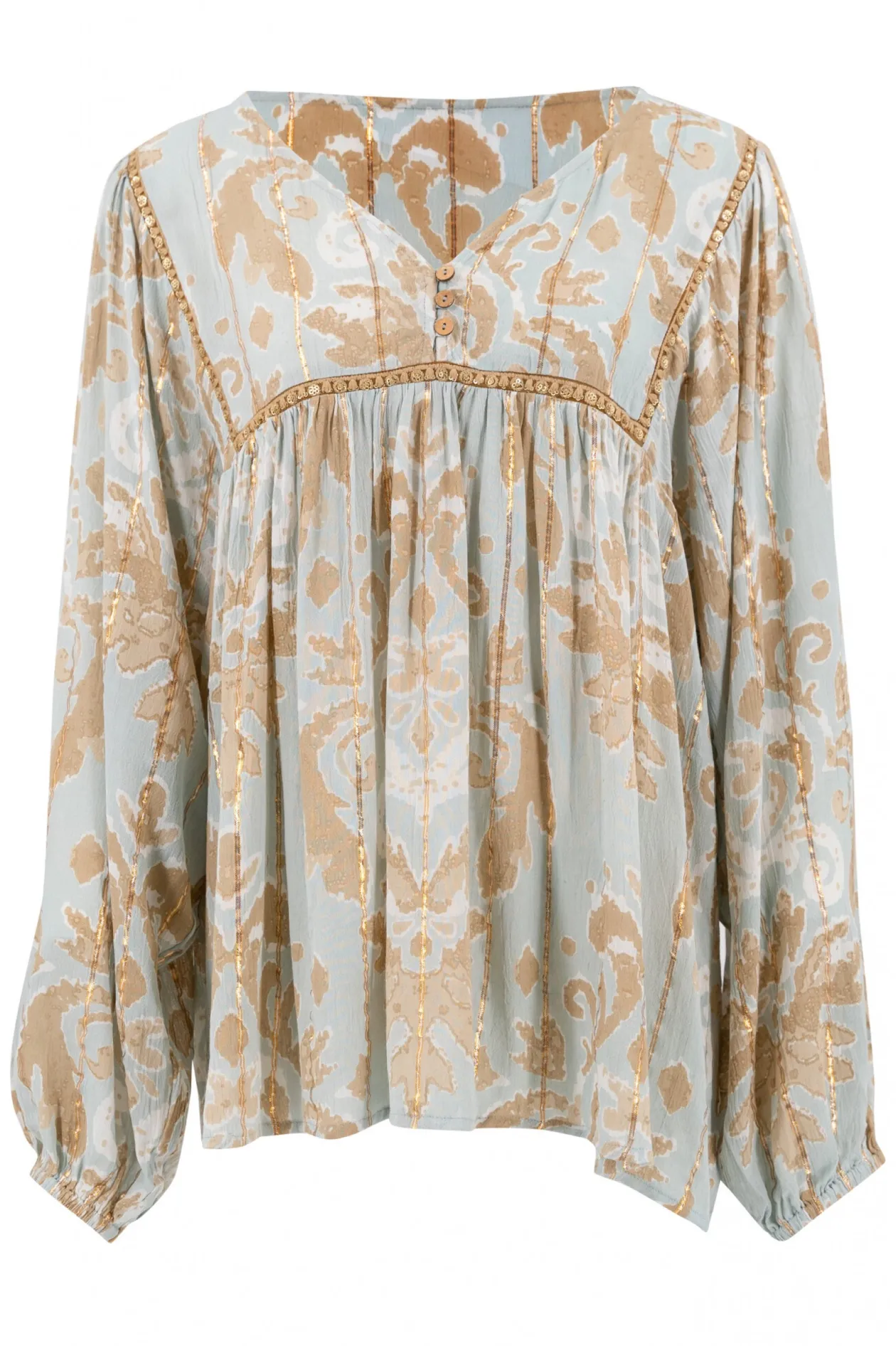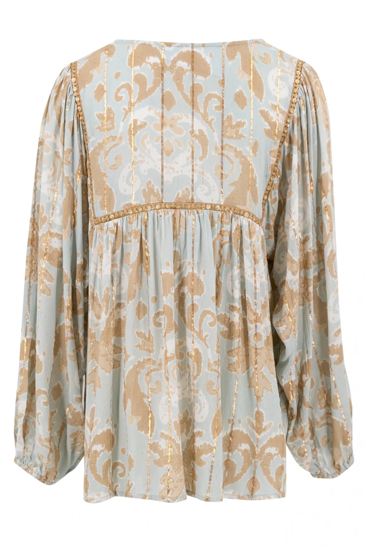 Lass dich von der Bluse Kiki Baroque Mint verzaubern, die eine perfekte Mischung aus Luxus und Komfort ist. Das barocke Muster, angereichert mit goldenen Lurexfäden und Pailletten, strahlt Eleganz aus. Kombiniere diese Bluse mit einer eleganten Jeans oder einem koketten Rock für einen unvergesslichen Look, der sowohl tagsüber als auch abends glänzt.