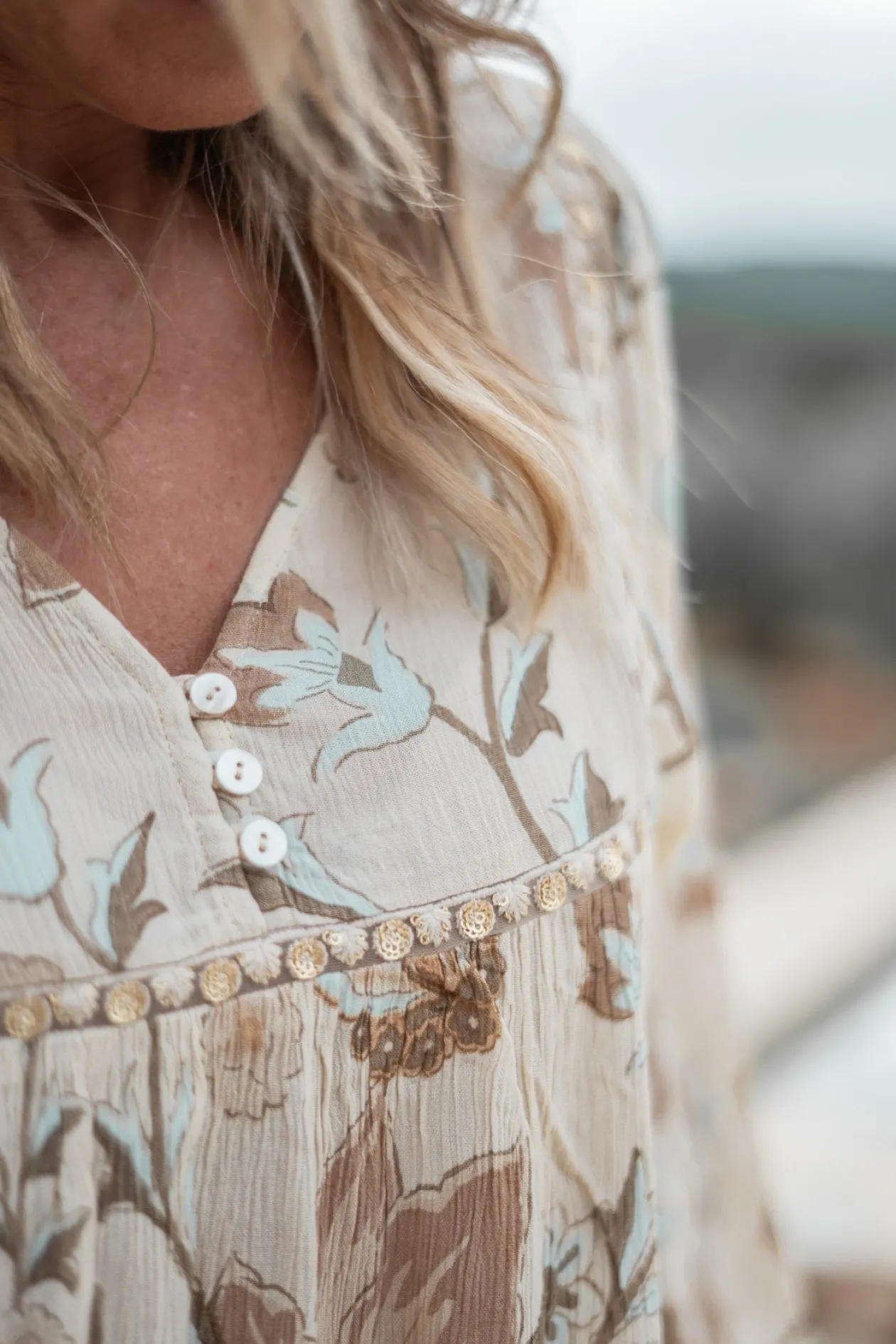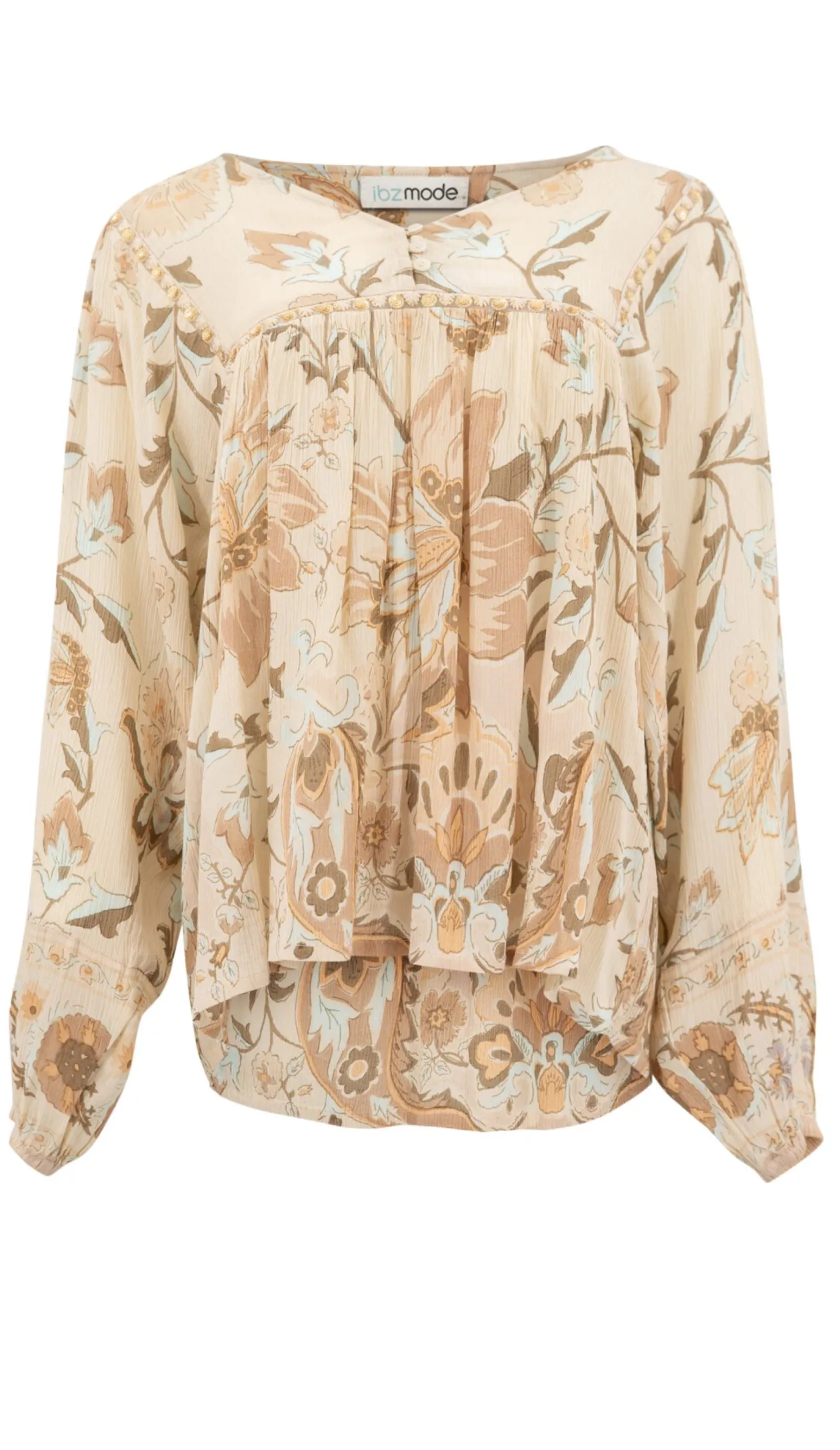 Entdecke den Zauber der Bluse Kiki Flower Natural, eine perfekte Mischung aus Stil und Komfort. Mit ihrem wunderschönen Blumendruck, den Pailletten und den Ballonärmeln verströmt diese Bluse den lässigen Vibe von Ibiza. Kombiniere sie mit leichten Jeans oder einem eleganten Rock für einen mühelosen, schicken Look. Fühle dich frei und stilvoll!