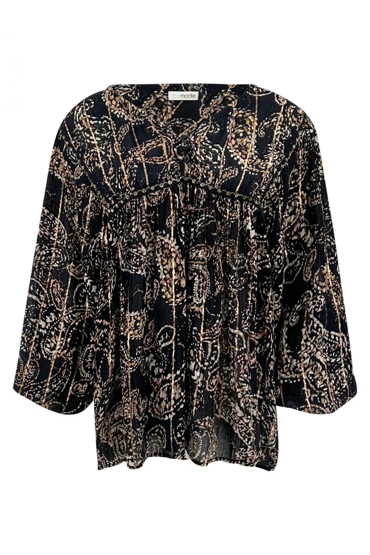 Die Bluse Kiki Paisley Black ist ein absolutes Must-have für deinen Kleiderschrank! Mit ihrem eleganten V-Ausschnitt, dem auffälligen Paisley-Print und den dezenten goldenen Lurexfäden wirst du mühelos Stil ausstrahlen. Kombiniere diese Bluse mit High-Waisted-Jeans für einen schicken Look oder mit einem Rock für einen Abend im Freien. Fühle dich selbstbewusst und trendy!