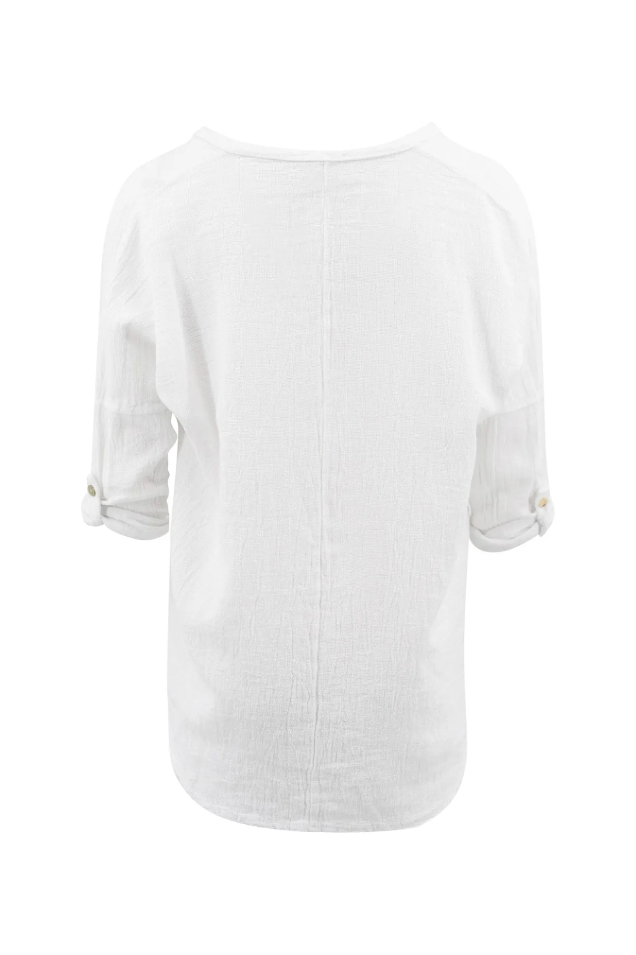 Entdecke das ultimative Sommer-Essential mit der Bluse Nina White! Diese luftige Bluse aus einem Leinen-Baumwoll-Gemisch sorgt für einen mühelosen Ibiza-Look. Mit einem verspielten Knopf an den Ellenbogen und einer perfekten Passform ist diese Bluse ideal für lässige und schicke Looks. Ergänze deine Garderobe mit diesem vielseitigen Teil und strahle Stil und Komfort aus.