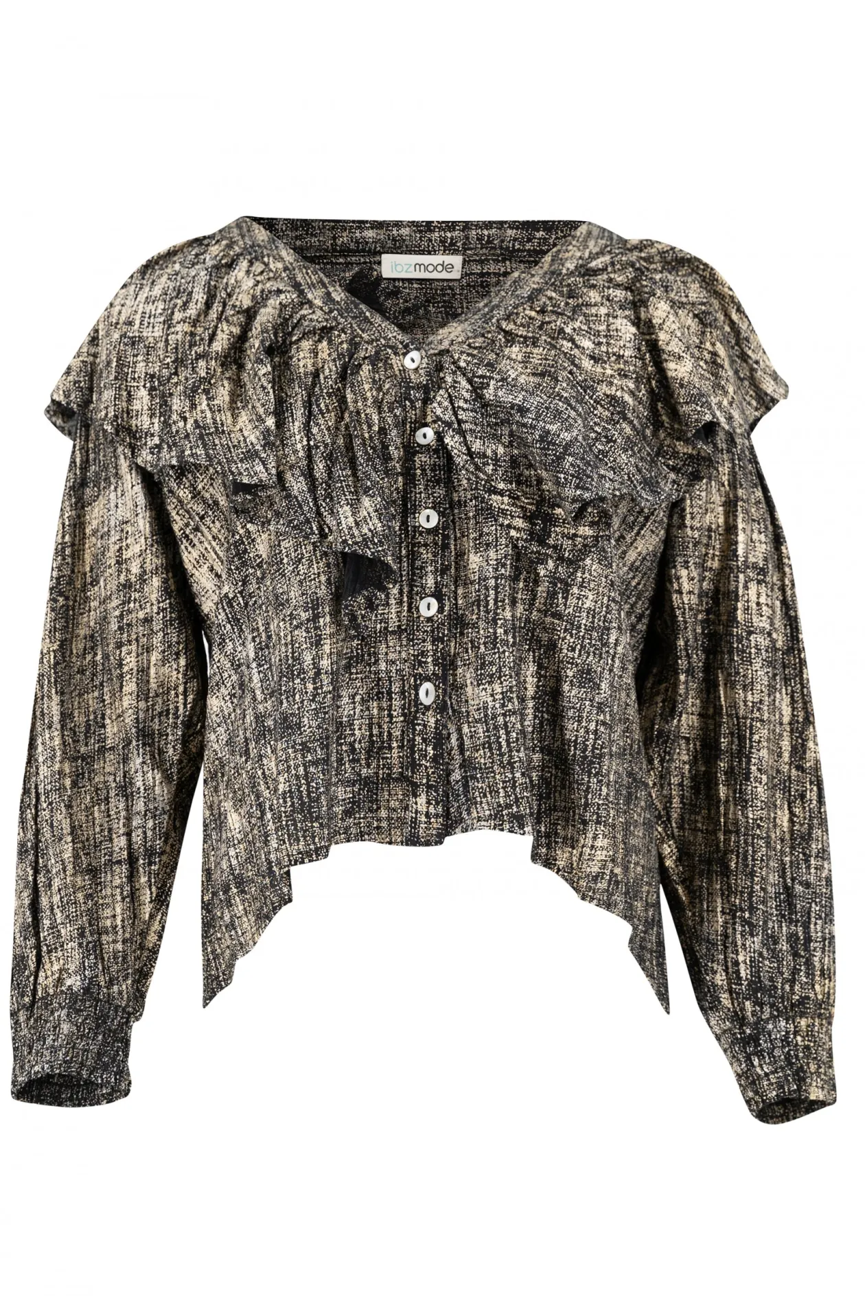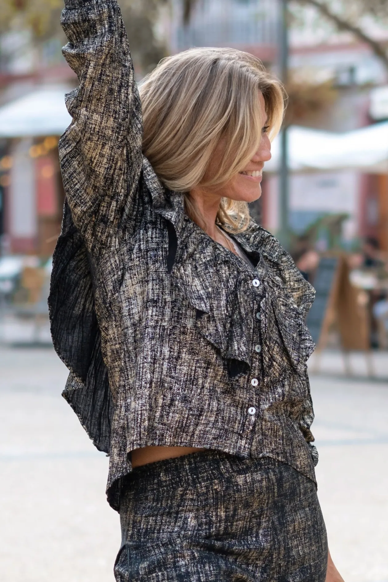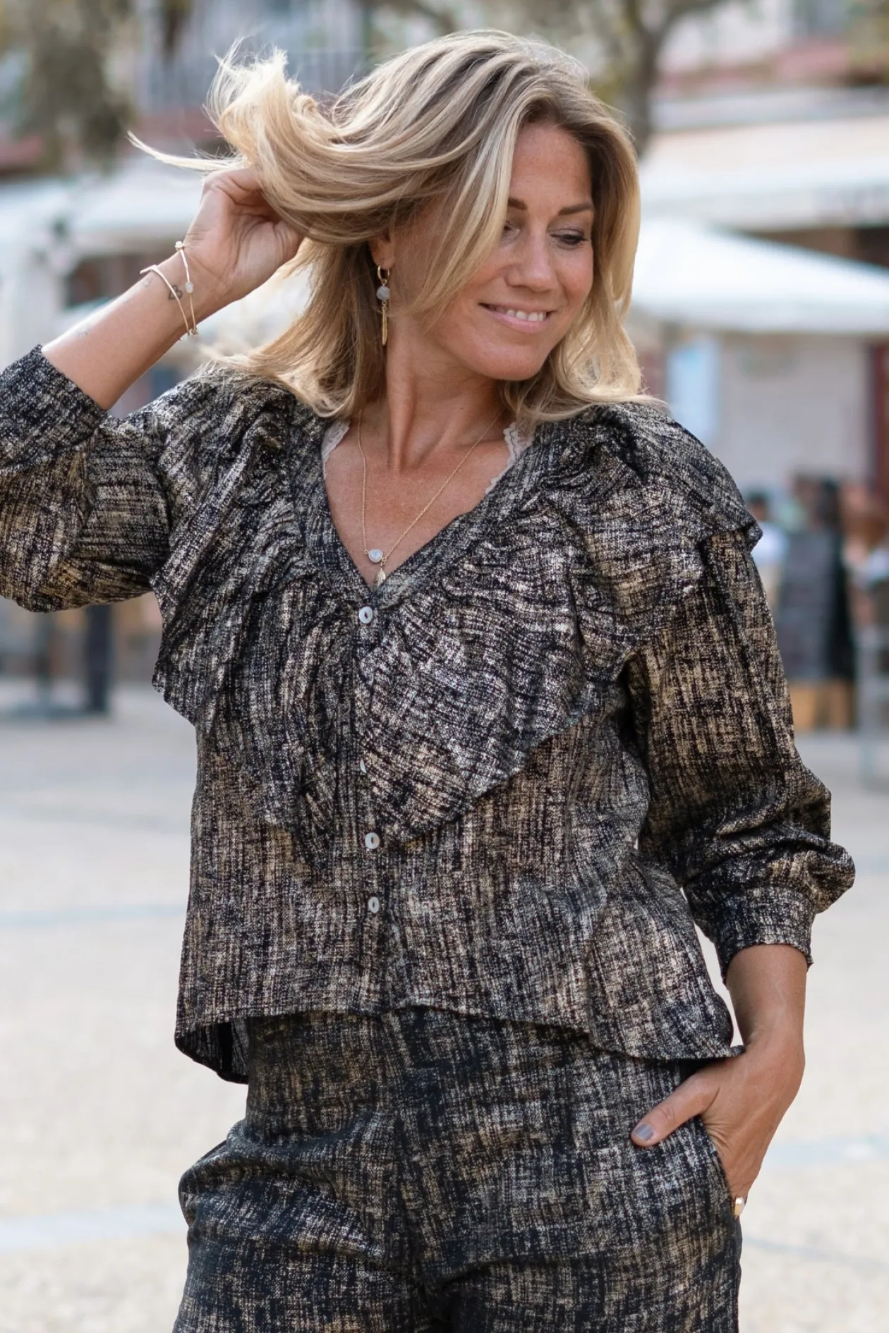 Tritt ins Rampenlicht mit der Bluse Ruffle Sparkle Black Gold, einem echten Blickfang für jeden Anlass. Die schimmernden Details und der elegante V-Ausschnitt verleihen deinem Look einen glamourösen Twist. Kombiniere sie mit einer High-Waisted-Jeans für einen eleganten Abend. Trau dich zu glänzen und zeige deinen einzigartigen Stil!