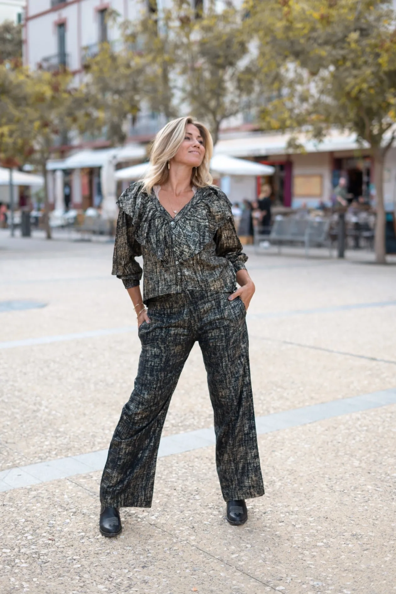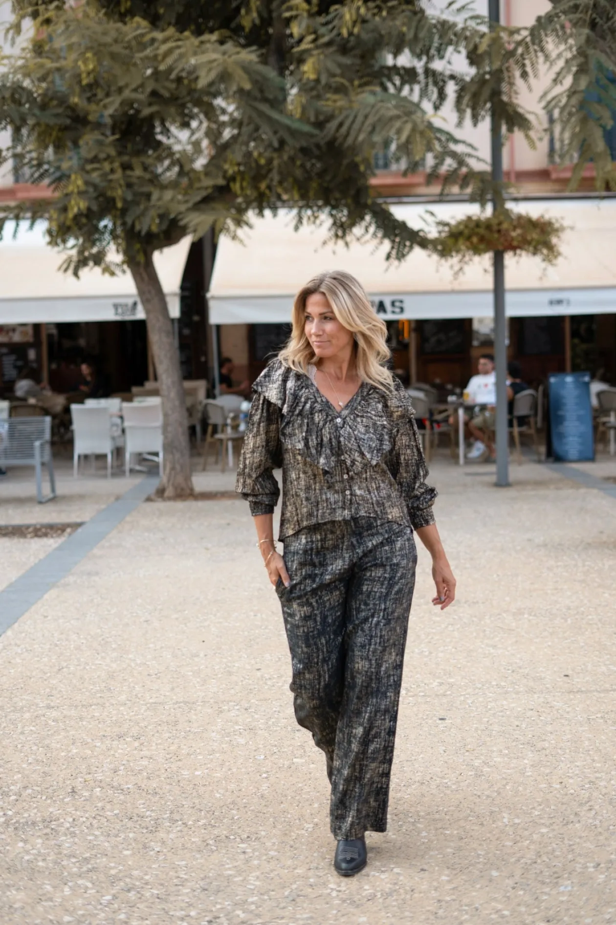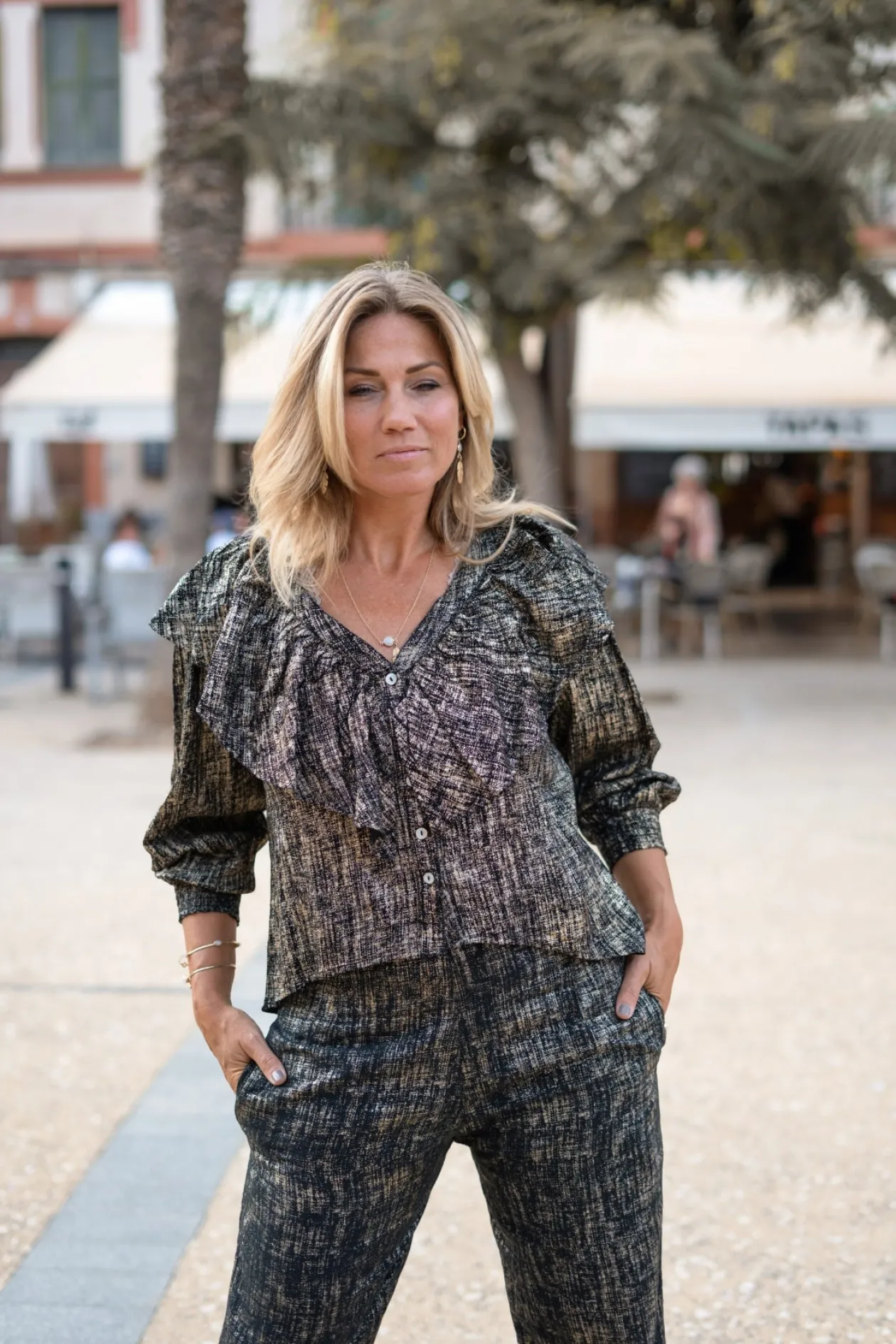 Tritt ins Rampenlicht mit der Bluse Ruffle Sparkle Black Gold, einem echten Blickfang für jeden Anlass. Die schimmernden Details und der elegante V-Ausschnitt verleihen deinem Look einen glamourösen Twist. Kombiniere sie mit einer High-Waisted-Jeans für einen eleganten Abend. Trau dich zu glänzen und zeige deinen einzigartigen Stil!