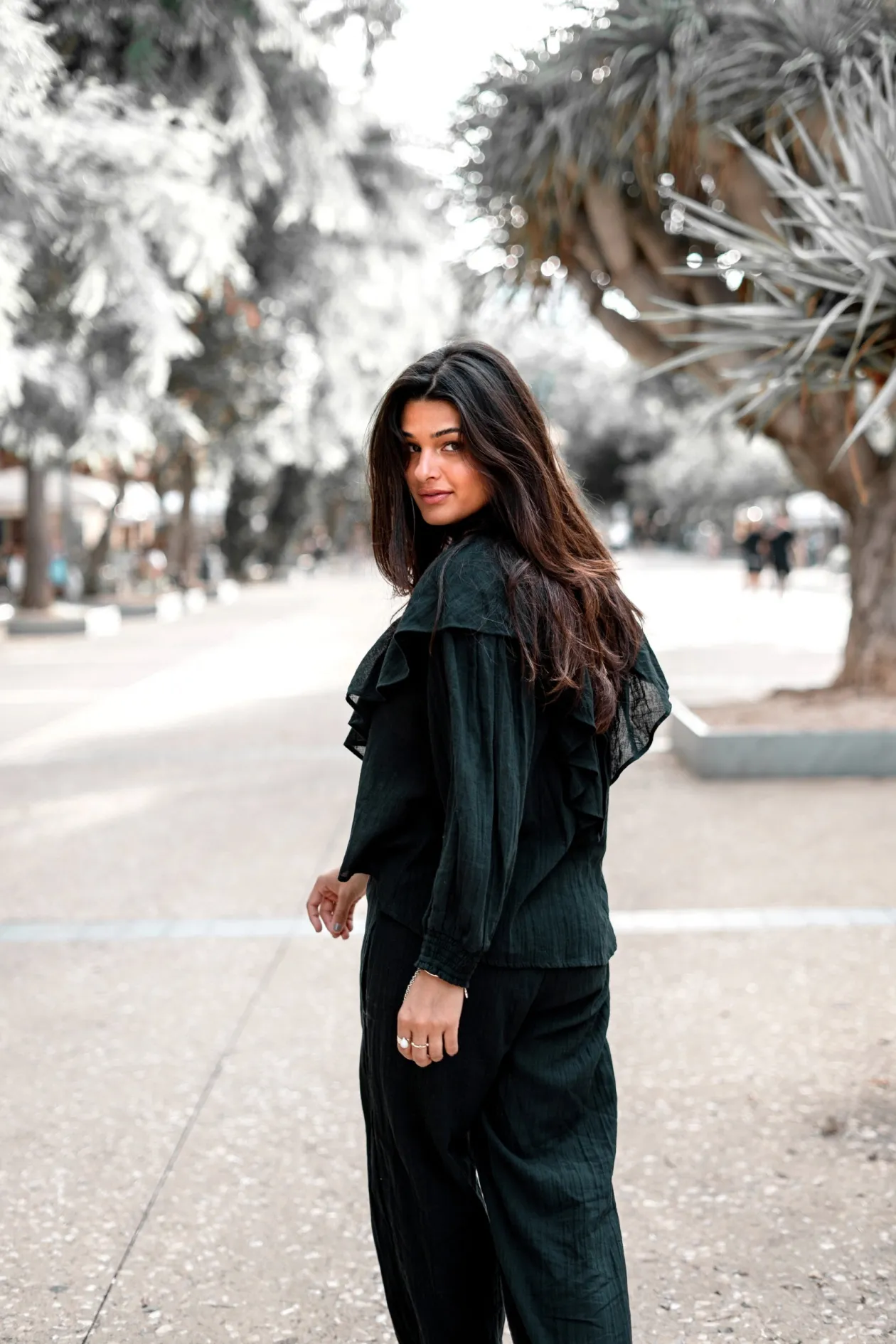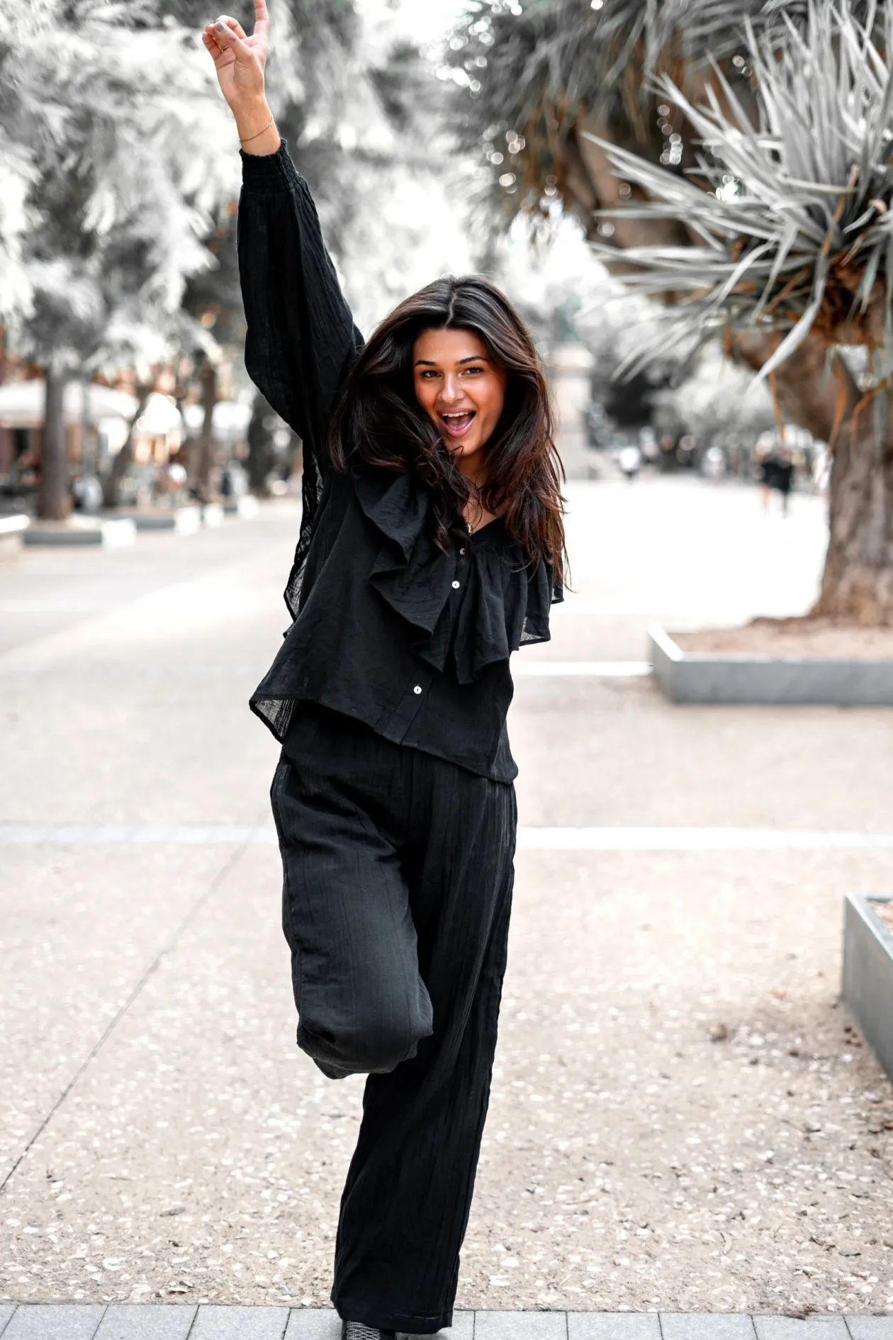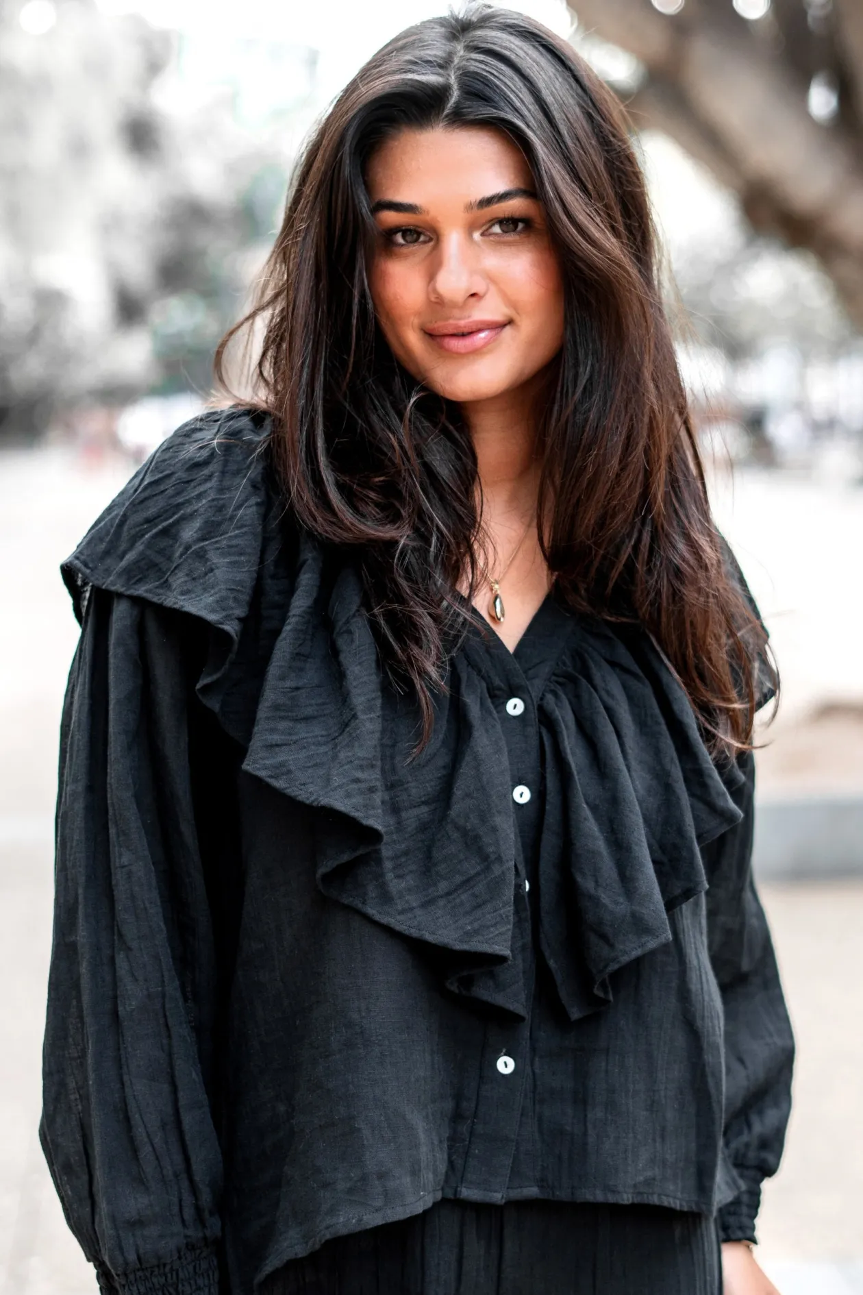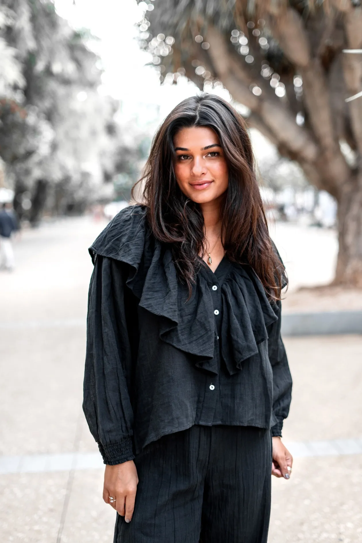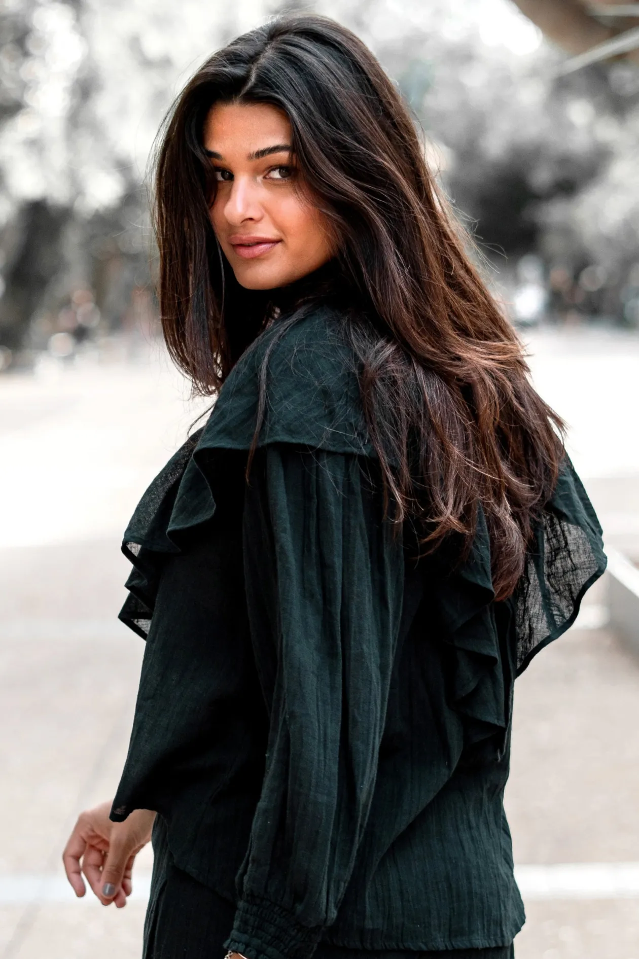 Entdecke die Magie der Bluse Ruffle Sparkle Black, ein echter Blickfang, der deinen Look auf die nächste Stufe hebt. Mit ihrem eleganten V-Ausschnitt und den verspielten Rüschen ist diese Bluse perfekt für einen Abend. Kombiniere sie mit deiner Lieblingsjeans für einen mühelos eleganten Look. Strahlen Sie Ihren einzigartigen Stil aus!