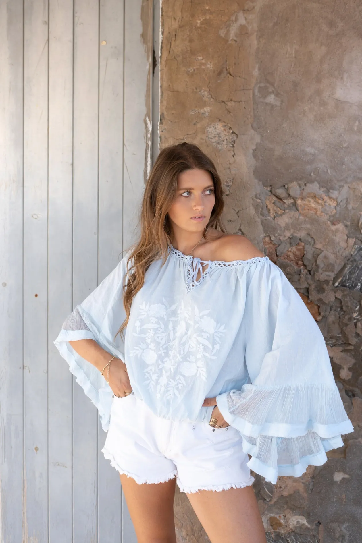 Entdecke die Bluse Yira Bordado Blue, eine perfekte Mischung aus Boho-Chic und Raffinesse. Die bestickten Details und die Trompetenärmel verleihen deinem Look einen verspielten Twist. Kombiniere sie mit Jeansshorts für einen Tag am Strand oder mit einem Maxirock für einen Abend im Freien. Trau dich, mit Stil zu glänzen!