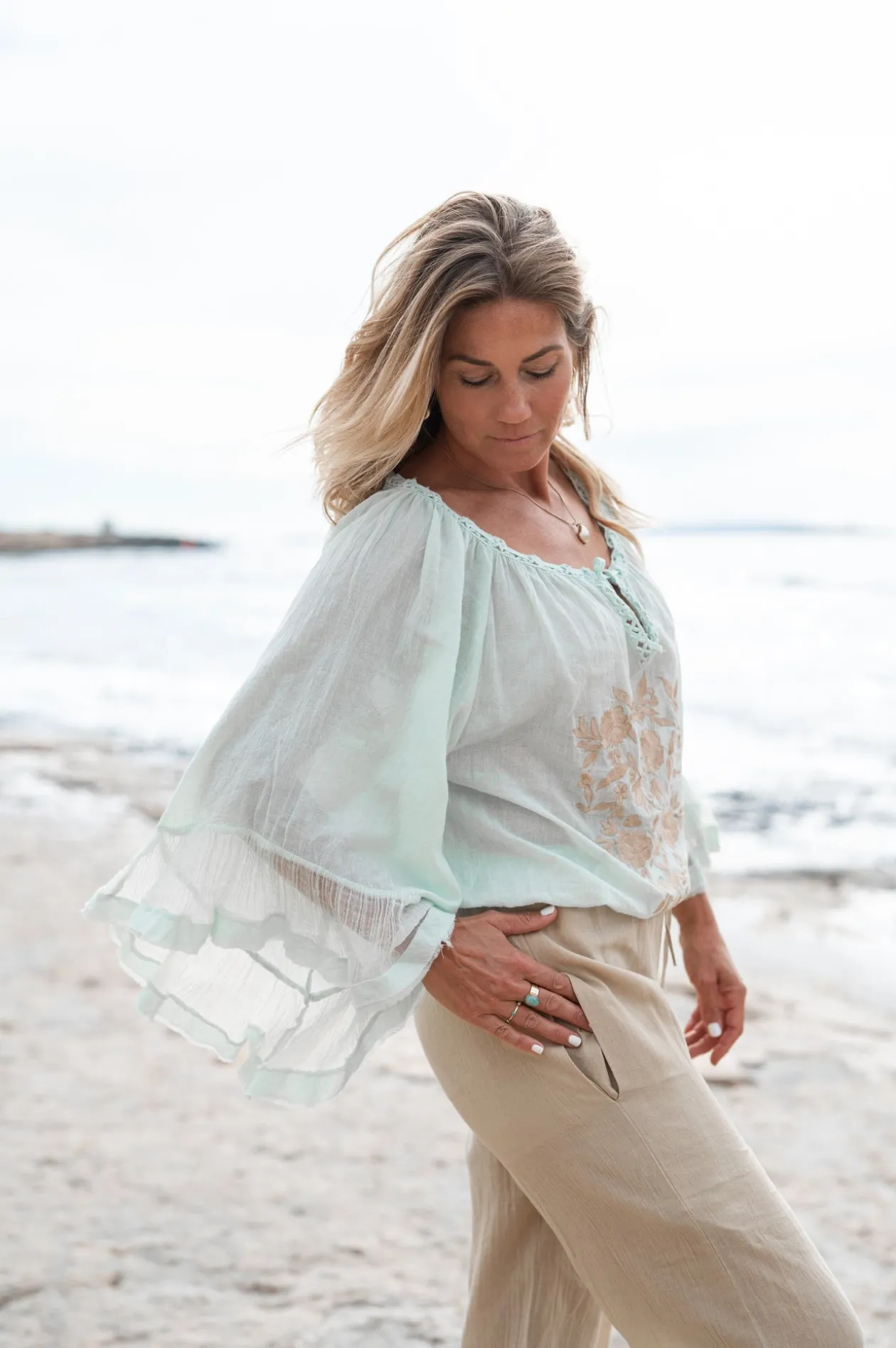 Entdecke die Bluse Yira Bordado Mint, ein Must-have für jeden Boho-Liebhaber! Diese luftige Bluse mit stilvollem Off-Shoulder-Schnitt betont deine Schultern und verleiht deinem Look ein verspieltes Flair. Die wunderschöne Stickerei macht diese Bluse zu einem einzigartigen Statement-Piece, das sich sowohl für legere als auch für festliche Anlässe eignet. Ergänze deine Garderobe mit diesem stylischen Teil und lass den Sommer kommen!
