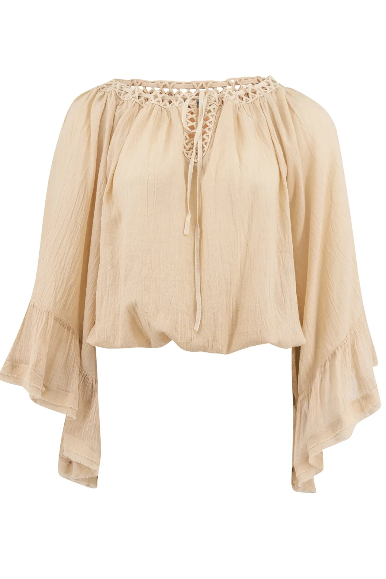 Entdecke die Bluse Yira Sand, eine perfekte Mischung aus Eleganz und Lässigkeit. Diese Bluse aus 100 % Baumwolle bietet ultimativen Komfort mit einem verspielten Twist dank der bestickten Details und der Flair-Ärmel. Trage sie schulterfrei für einen Boho-Chic-Look und versprühe jeden Tag Ibiza-Vibes.