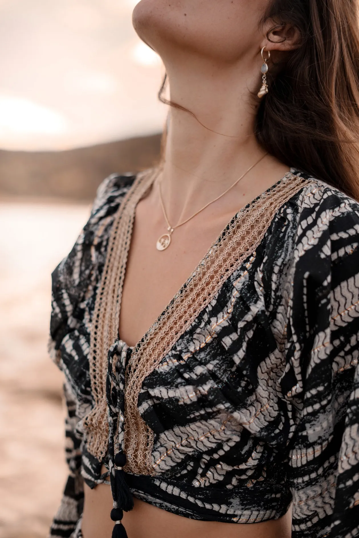Das Crop Top Emika Black Print ist das ultimative Must-have für einen gewagten und glamourösen Look. Die schimmernden Lurexfäden sorgen für einen glitzernden Touch, perfekt für eine Nacht im Ibiza-Stil. Kombiniere es mit einem hochtaillierten Rock oder einer Jeans und lass deine innere Fashionista strahlen!