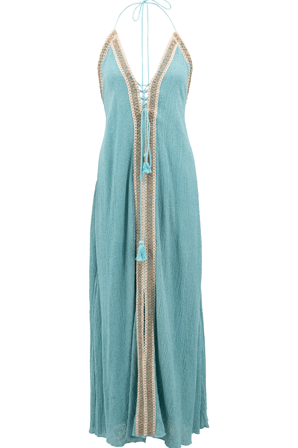 Unser Model Dionne, 1,77 m groß und Größe S, demonstriert, wie schön das Kleid Zamora Aqua fällt. Die Passform ist so konzipiert, dass es sich jeder Größe anpasst, erhältlich von XS bis XXL, einschließlich Zwischengrößen wie M/L und XS/S. Der tiefe V-Ausschnitt, der an der Brust gepolstert und mit Kordeln und Quasten verziert ist, verleiht dem Kleid ein verspieltes Element, während die Zierpaspel auf der Vorderseite dem Kleid eine einzigartige Note verleiht. Mit seinem tief ausgeschnittenen Rücken und dem luftigen Netzstoff ist dieses Kleid nicht nur atemberaubend schön, sondern auch an heißen Sommertagen herrlich zu tragen. Die Farbe Blau spiegelt das Meer und den Himmel wider und ist perfekt für jeden Strandtag oder Sommeranlass.