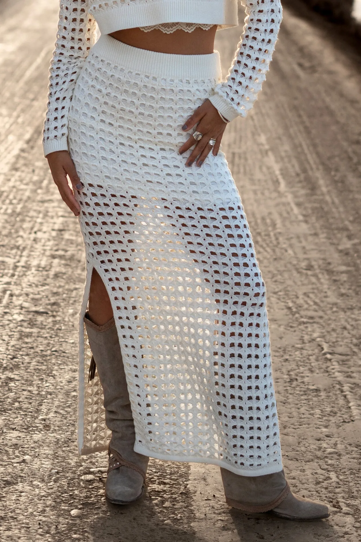 Entdecke mit dem Evi Strickrock Off White deine perfekte Wahl für einen Boho-Sommerlook. Dieser offen gestrickte Rock strahlt einen entspannten Stil aus, der sowohl elegant als auch bequem ist. Kombiniere ihn mit dem Evi Knitted Top und Stiefeln für einen ungebrochenen Sommer-Vibe. Verleihe deiner Garderobe einen Hauch von Flair mit diesem Must-Have-Rock!