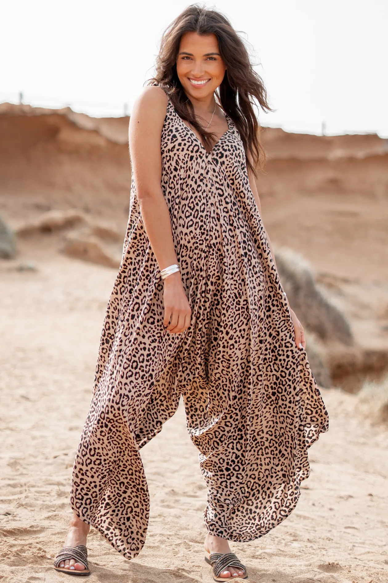 Entdecke die ultimative Mischung aus Komfort und Stil mit dem Jumpsuit Alma Leopard. Der Jumpsuit aus 100% Rayon Voile hat einen tiefen V-Ausschnitt und verstellbare Träger für eine perfekte Passform. Die weiten Beine verleihen ihm einen Boho-Chic. Kombiniere ihn mit Sandalen und einem Hut für einen sommerlichen Look!