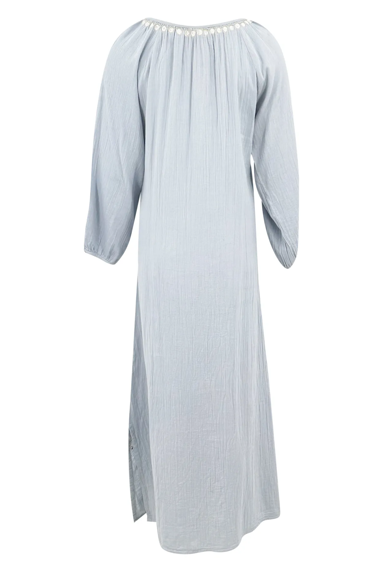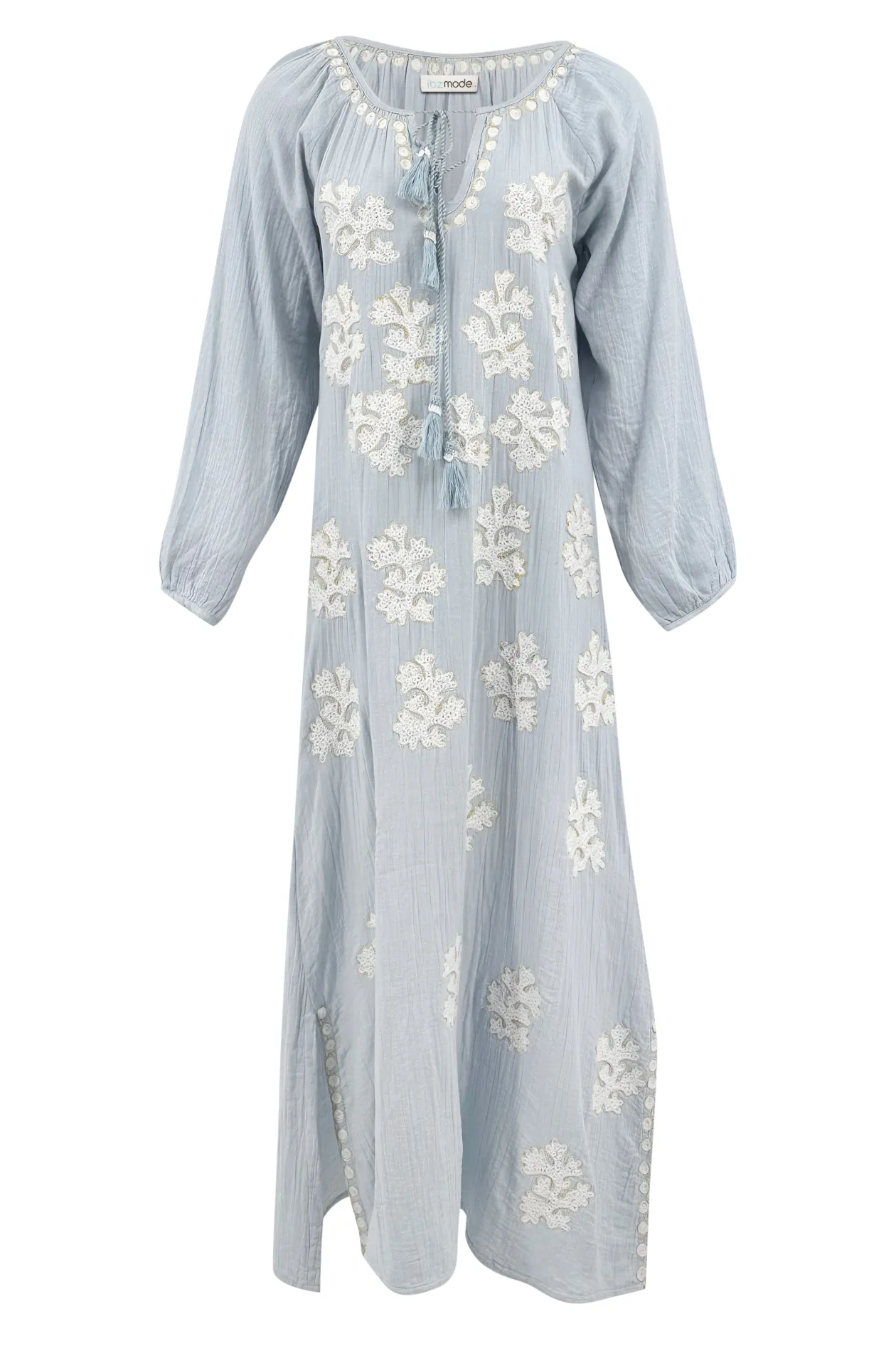 Der Kaftan Leaf Pale Blue ist dein ultimatives Sommer-Must-Have! Dieser Kaftan aus 100 % Baumwolle kombiniert Komfort mit einem Hauch von Luxus dank der bestickten Details und Lurexfäden. Trage ihn mit Sandalen für einen entspannten Strand-Look oder mit Absätzen für einen Abend im Freien. Fühle dich frei und stilvoll!