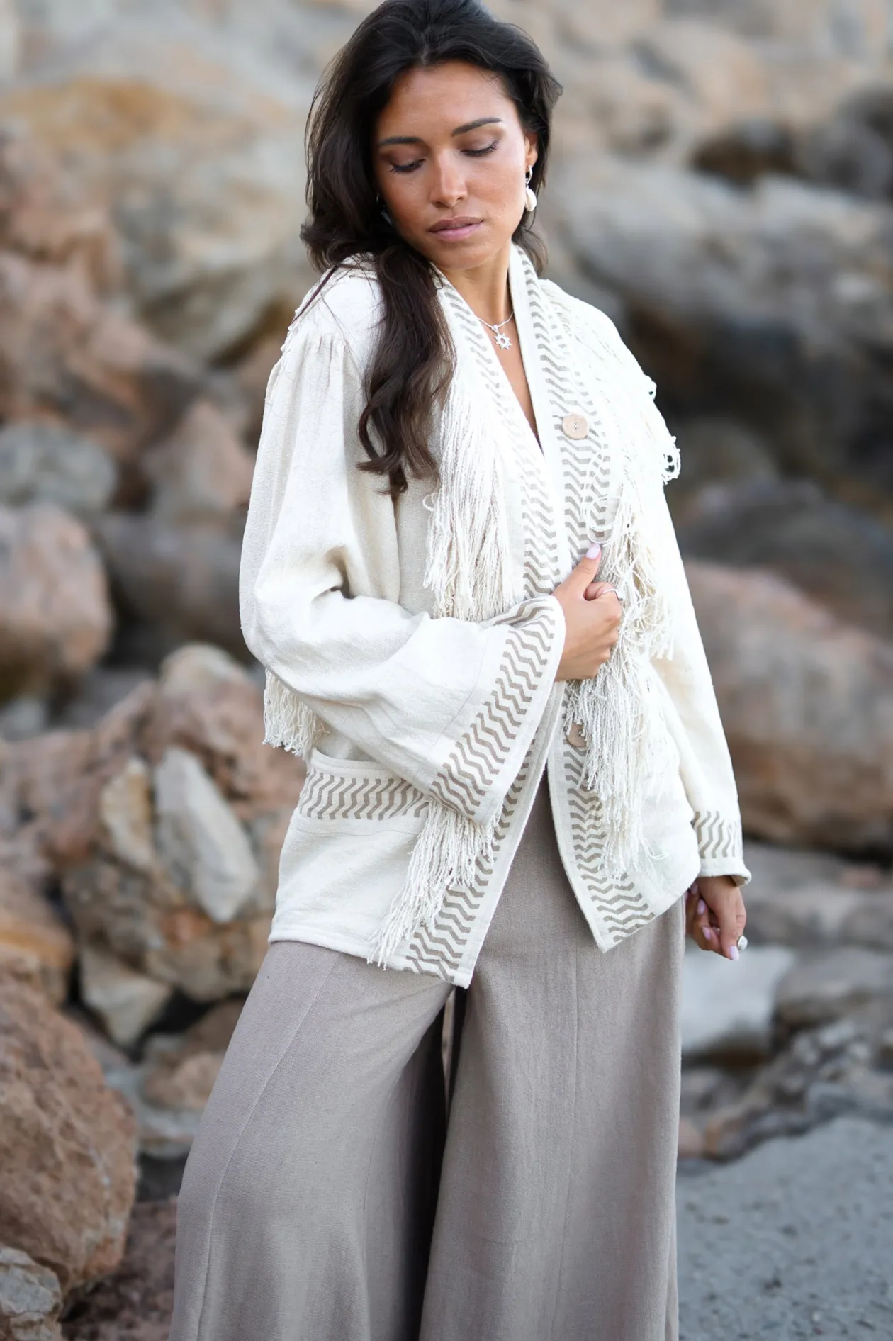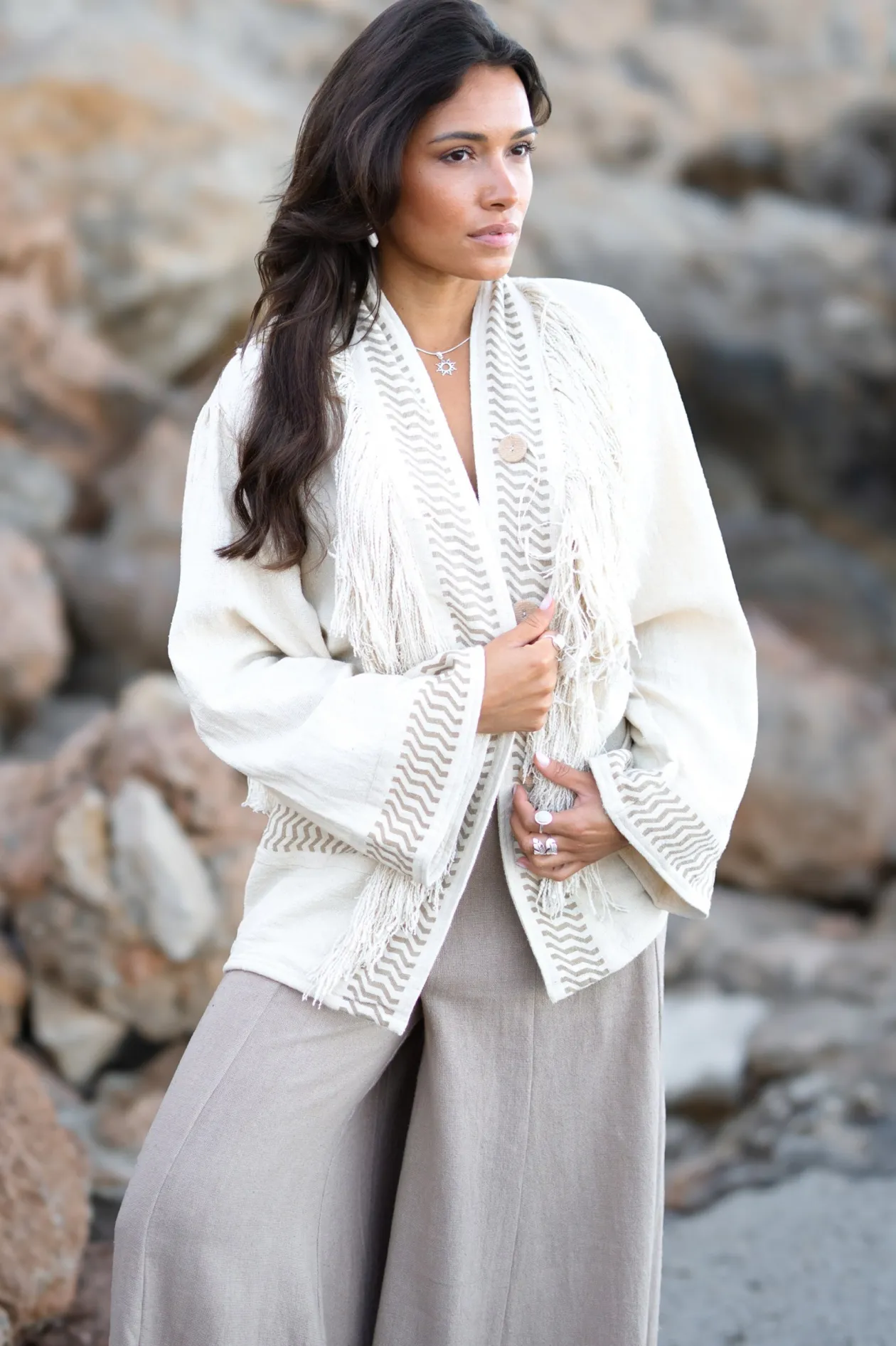 Entdecke den Zauber der Kimonojacke Esthetica Ecru, eine perfekte Mischung aus Bohème und zeitloser Eleganz. Dieser Kimono aus 100 % Baumwolle mit verspielten Fransen bietet sowohl Wärme als auch Stil. Trage ihn über deinem Lieblingsoutfit und du bekommst sofort einen Boho-Chic-Look. Spüre die Freiheit und Kreativität!
