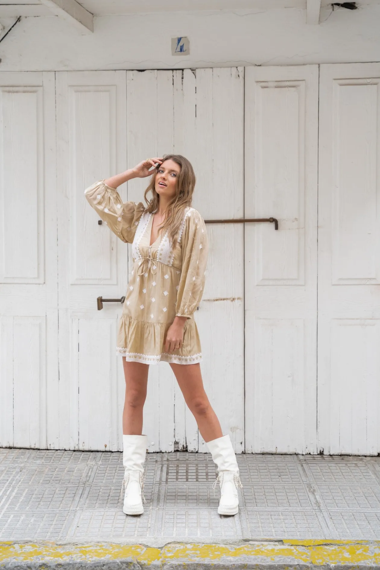 Das Kleid Eva Sand von IBZmode ist dein neuer Sommerfavorit! Dieses luftige Kleid aus 100 % Viskose hat einen V-Ausschnitt mit Knopf an der Brust und lange Ballonärmel – perfekt für einen Boho-Chic-Look. Kombiniere es mit Sandalen und einer Korbtasche für einen mühelosen Ibiza-Look. Fühle dich frei und stylish!