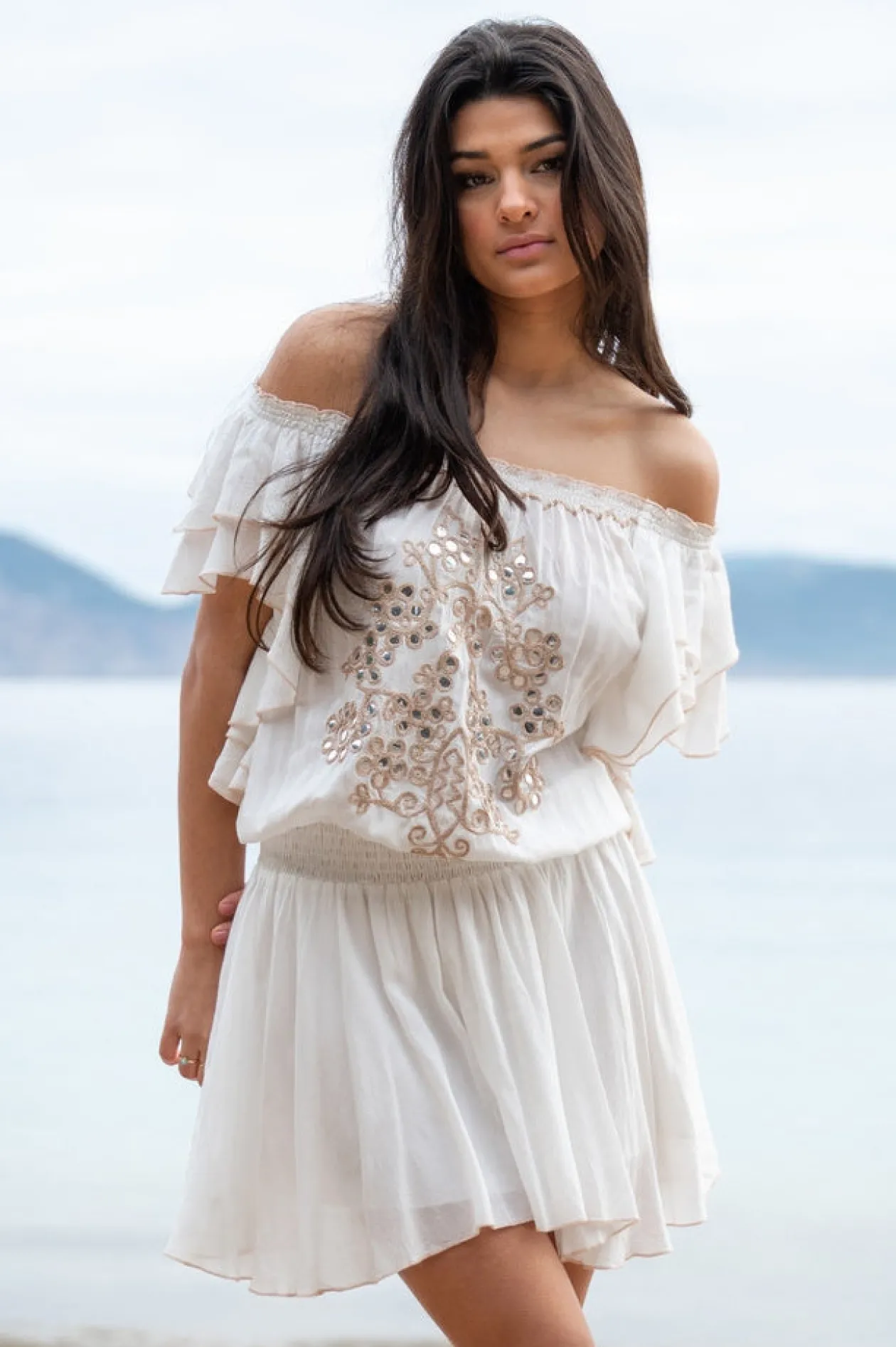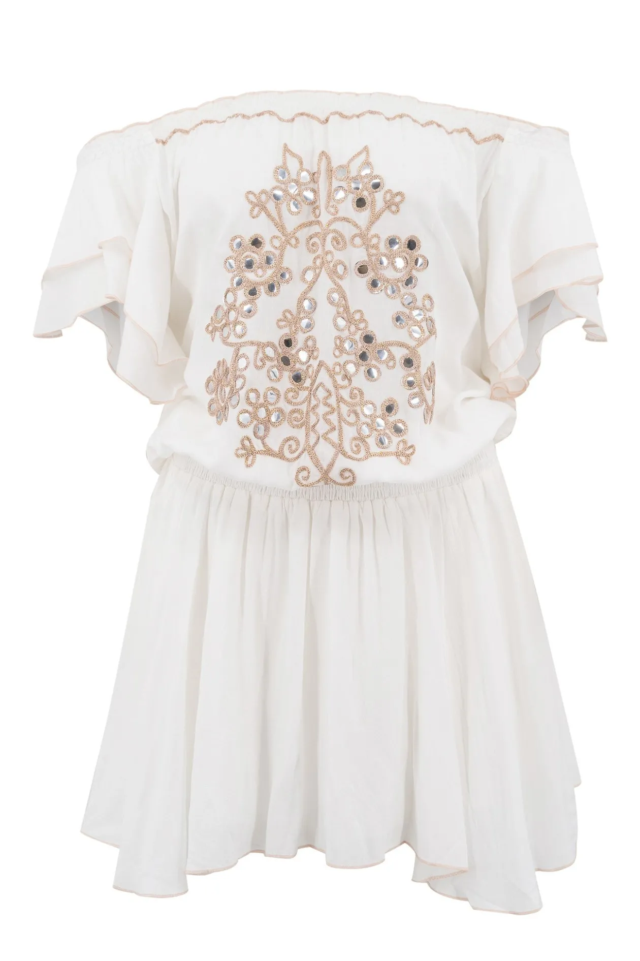 Entdecke den Zauber des Kleides Jairo Mirror White, ein echter Blickfang, der deinen Sommerlook auf die nächste Stufe hebt. Mit seinem schulterfreien Design, den dekorativen Spiegeln und Stickereien versprühst du mühelos Bohème-Chic. Dieses Kleid eignet sich perfekt für einen Tag am Strand oder eine Nacht im Freien und bringt dich zum Strahlen!