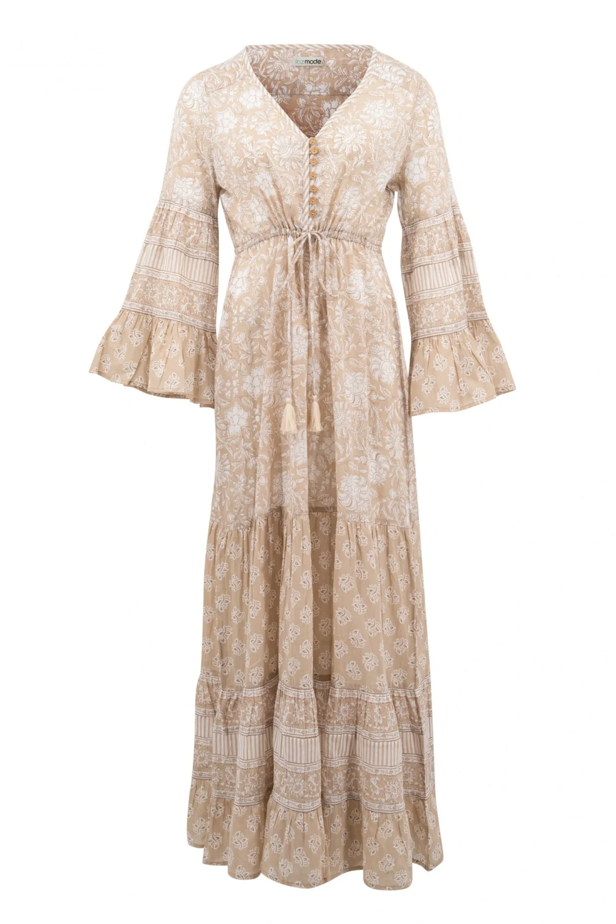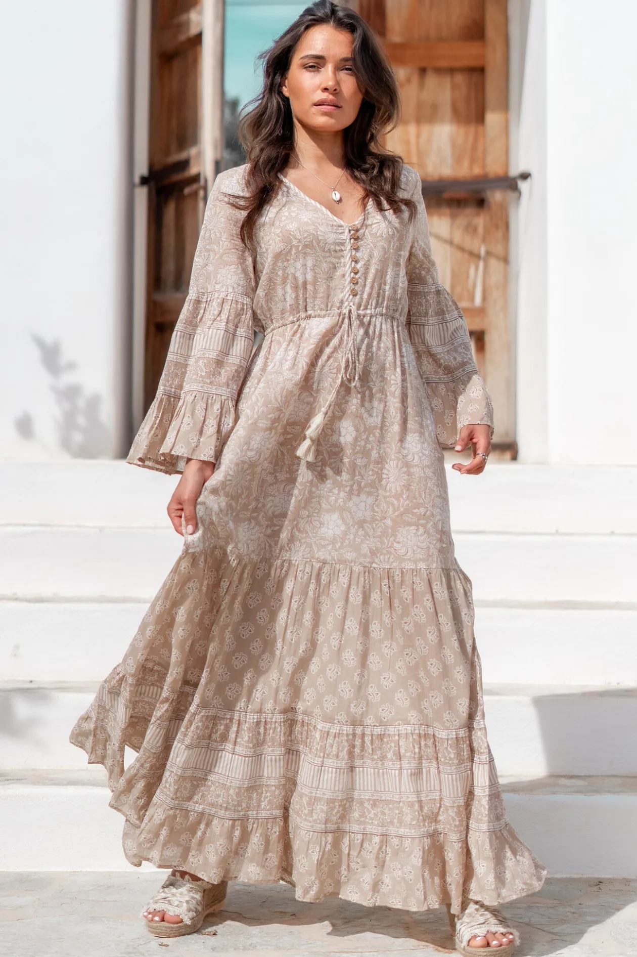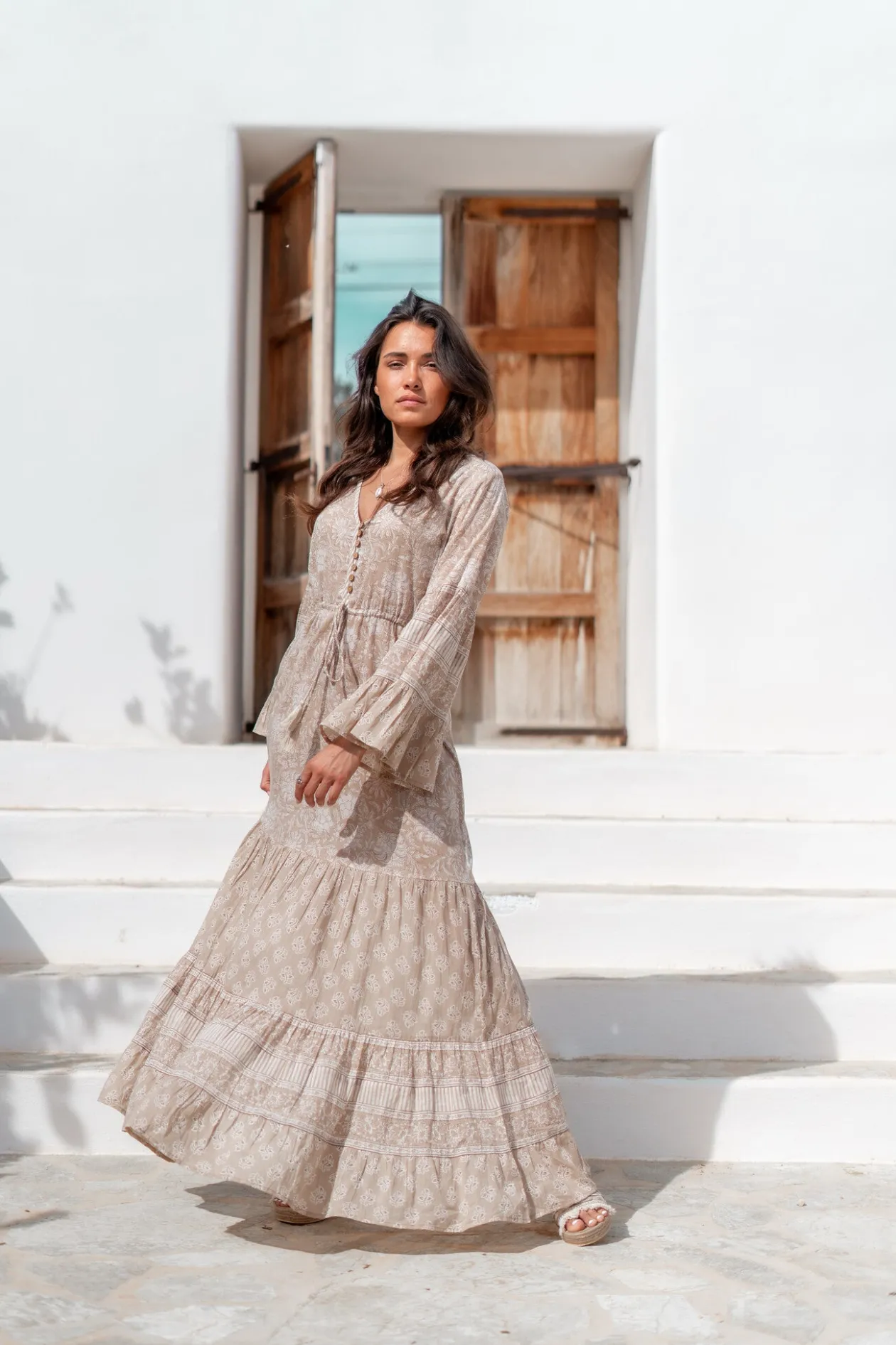 Das Kleid Jesenia Natural ist die ultimative Mischung aus Boho-Chic und Komfort. Mit seinem eleganten V-Ausschnitt, den raffinierten Knöpfen und der verstellbaren Taille bringt dieses Kleid deine Figur perfekt zur Geltung. Es besteht aus 100 % Baumwolle und ist ideal für einen Sommertag oder einen Abend im Freien. Kombiniere es mit Sandalen für einen mühelosen Look.