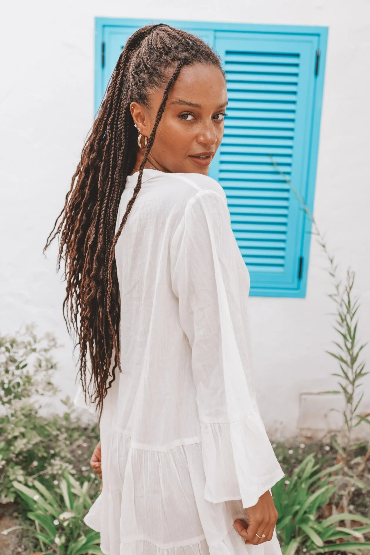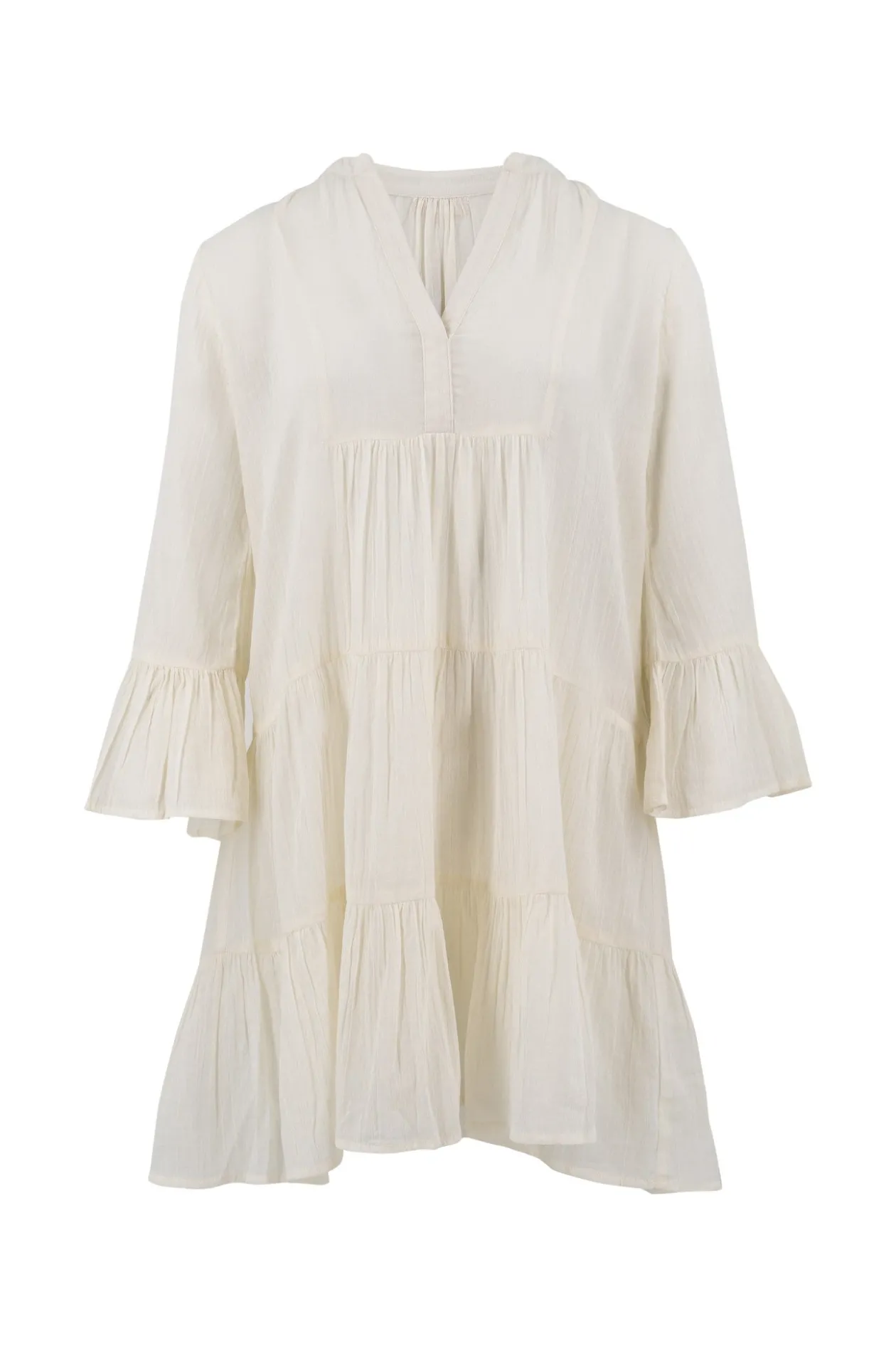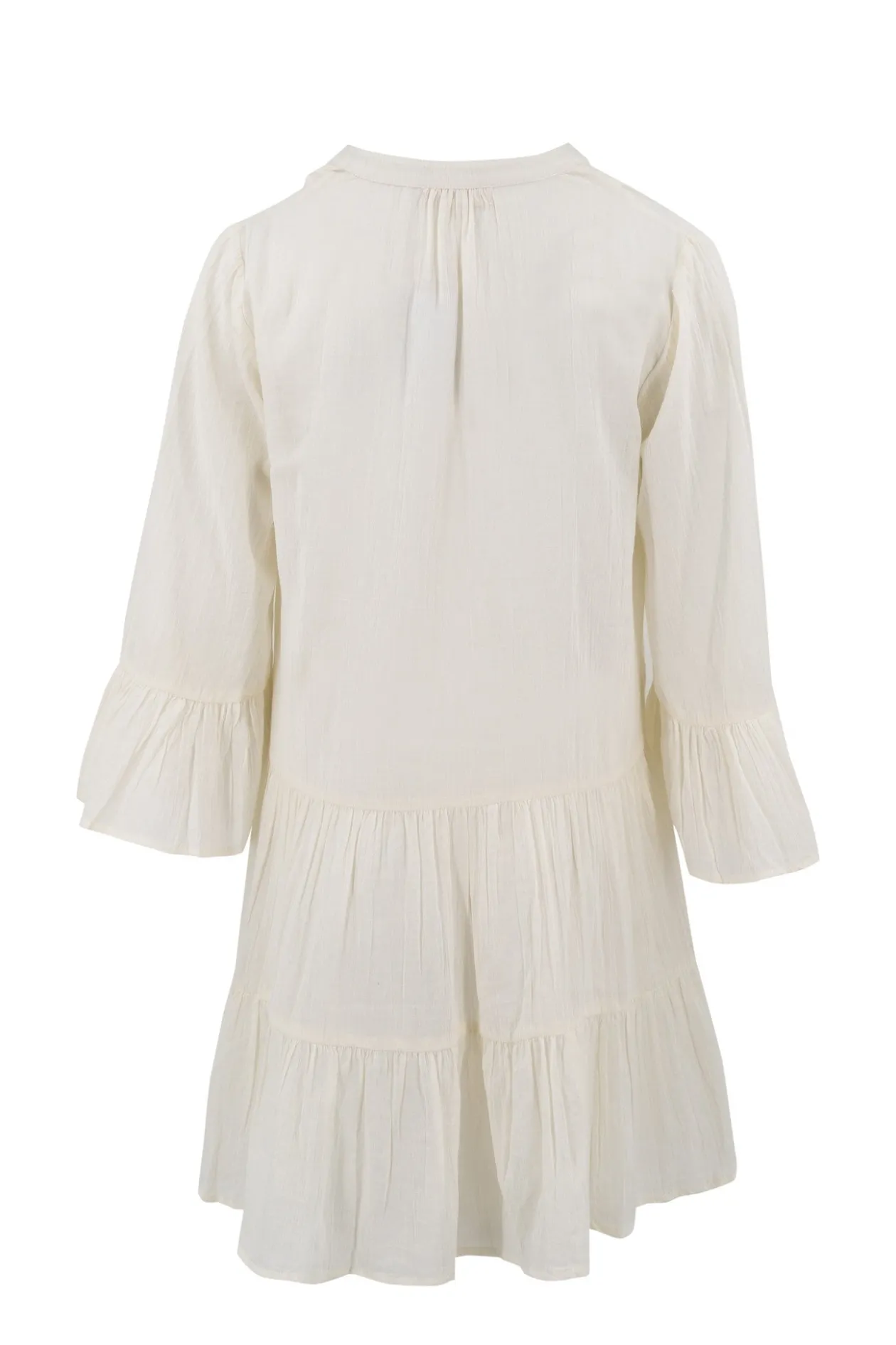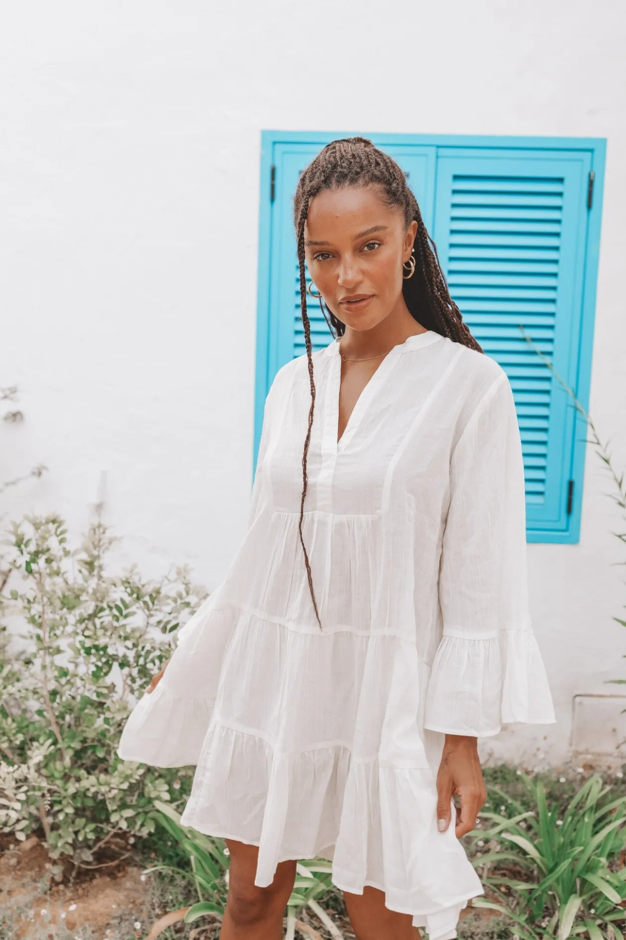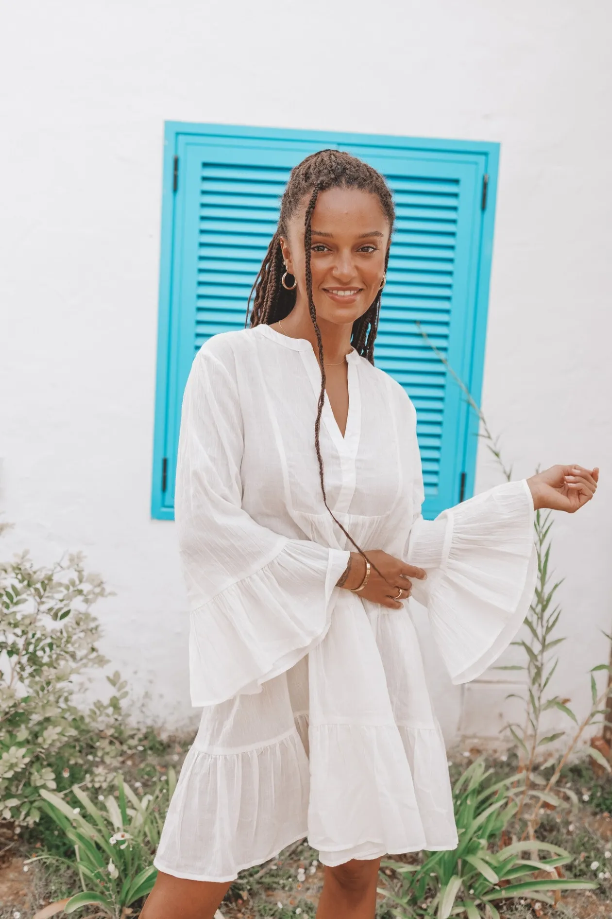 Starte in den Sommer mit dem Kleid Lilla Ivory, einer perfekten Mischung aus Eleganz und Komfort. Das Kleid aus 100 % Baumwolle mit verspielten Trompetenärmeln und einem Rundhalsausschnitt mit Kerbe strahlt mühelosen Stil aus. Kombiniere es mit Sandalen für einen lässigen Look oder mit Absätzen für einen Abend. Fühle dich hinreißend und frei!