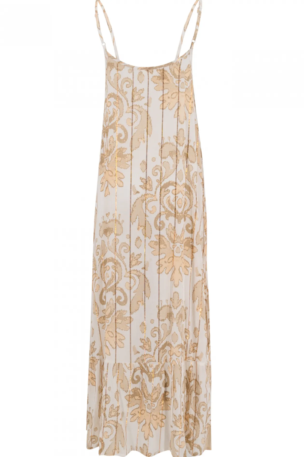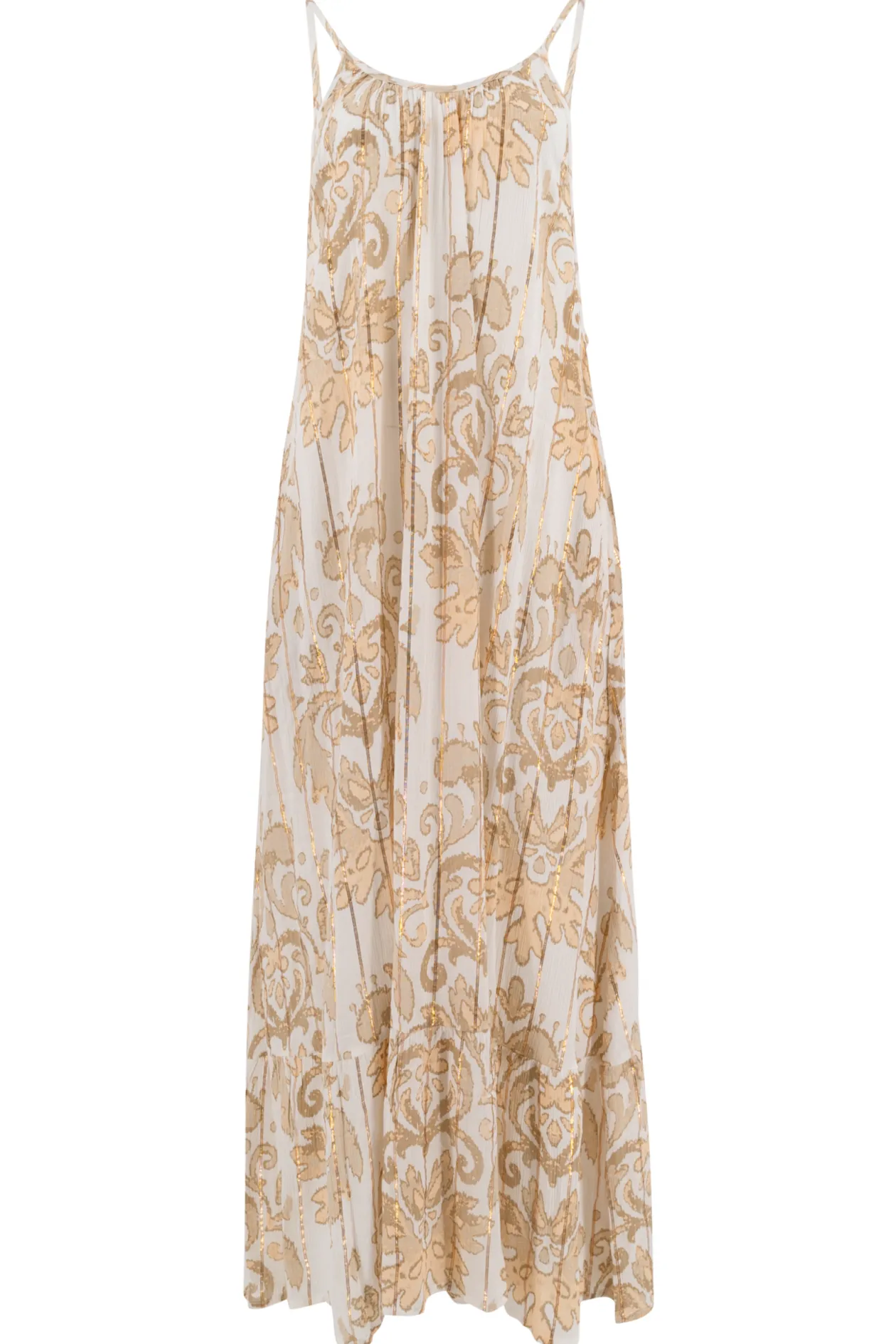 Entdecke den bezaubernden Charme des Kleides Madia Baroque Ivory, ein Meisterwerk, das Stil und Komfort nahtlos verbindet. Dieses Kleid aus luftiger 100%iger Rayon und mit goldenem Lurexgarn verziert, strahlt Luxus aus. Es eignet sich sowohl für sonnige Tage als auch für schwüle Abende. Trage es mit Sandalen oder Absätzen für einen mühelosen, eleganten Look.