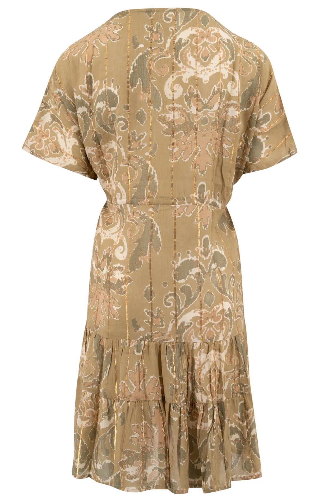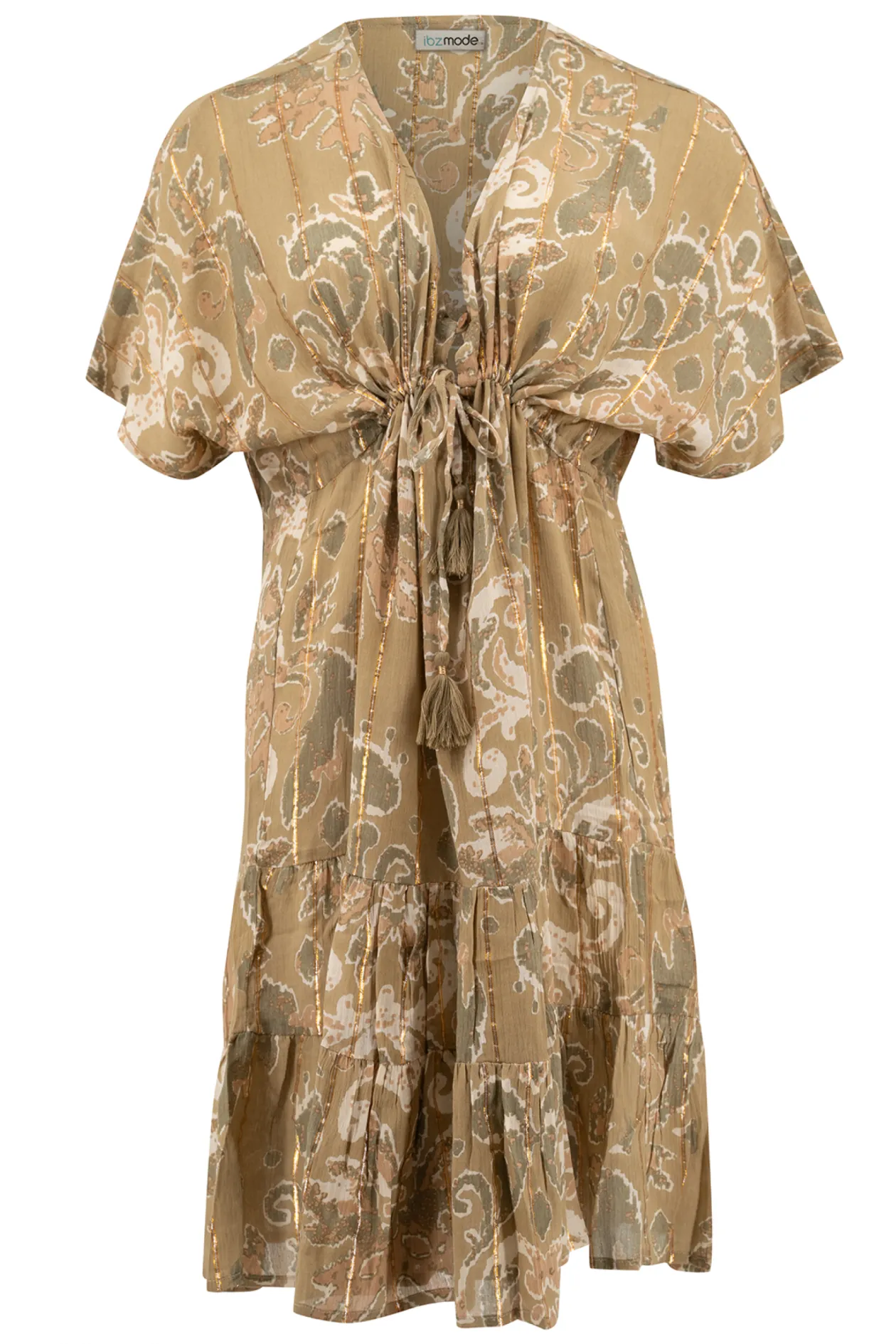Tritt ein in die Welt des mühelosen Schickes mit dem Kleid Mio Khaki von IBZmode. Dieses Kleid aus 100% Viskose umhüllt dich mit Luxus und Komfort. Mit seinem tiefen V-Ausschnitt, dem Barock-Print und den verspielten Quasten ist es die perfekte Wahl für einen Sommertag oder eine Nacht im Freien. Kombiniere es mit Sandalen für einen entspannten Look oder mit Absätzen für einen eleganten Touch. Fühle dich frei und stilvoll in jeder Situation!