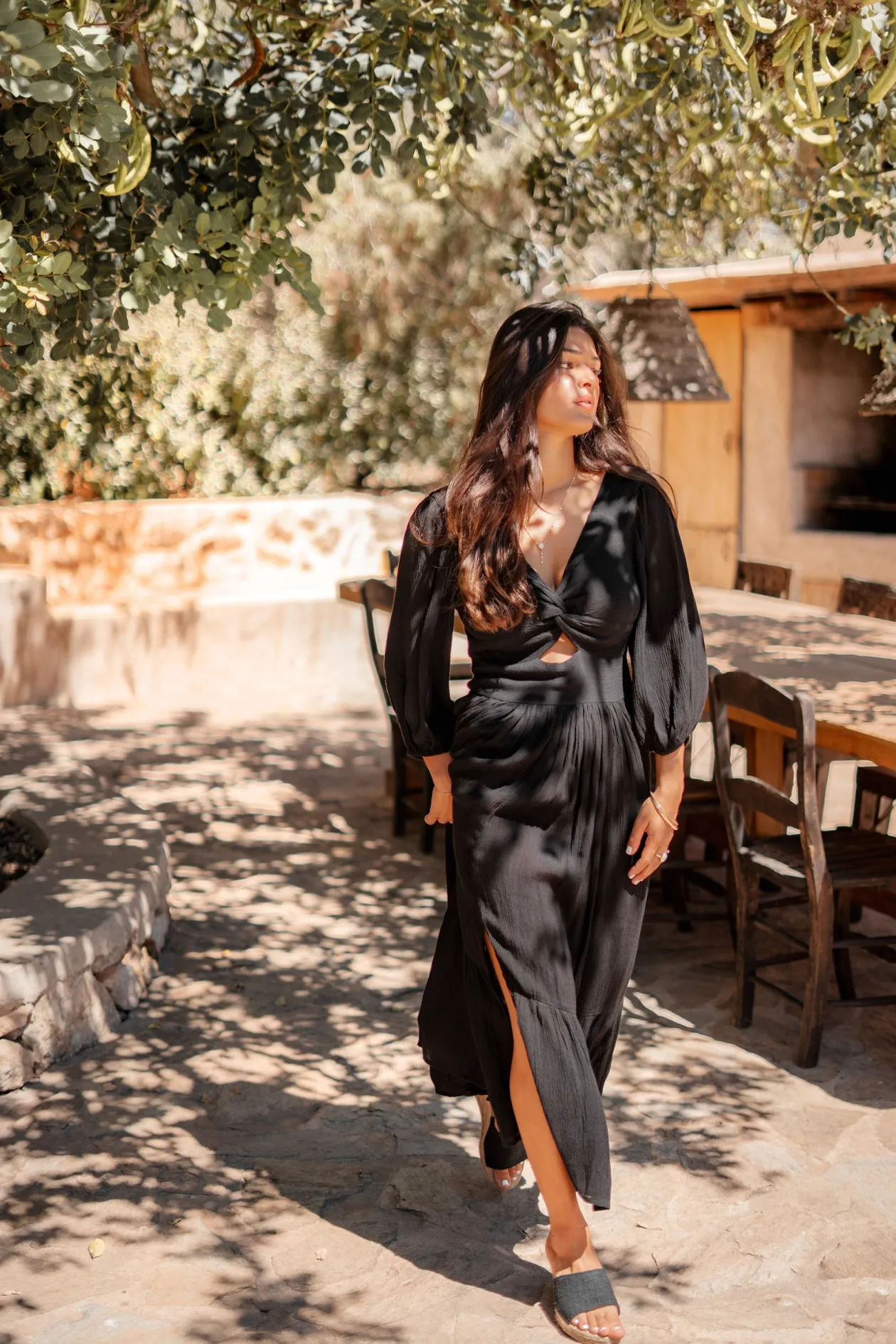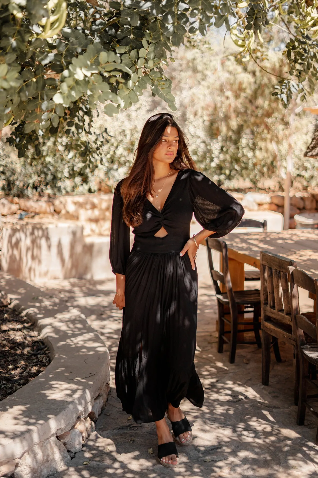 Entdecke das Kleid Santi Black, ein ultimatives Statement-Piece für jeden Anlass. Mit seinem gedrehten Detail auf der Vorderseite und den Puffärmeln mit elastischen Trägern strahlst du mühelose Eleganz aus. Das Stretchband auf der Rückseite sorgt für eine perfekte Passform. Kombiniere es mit deinen Lieblingsschuhen zum Ausgehen oder trage es mit Turnschuhen für einen lässig-schicken Look.