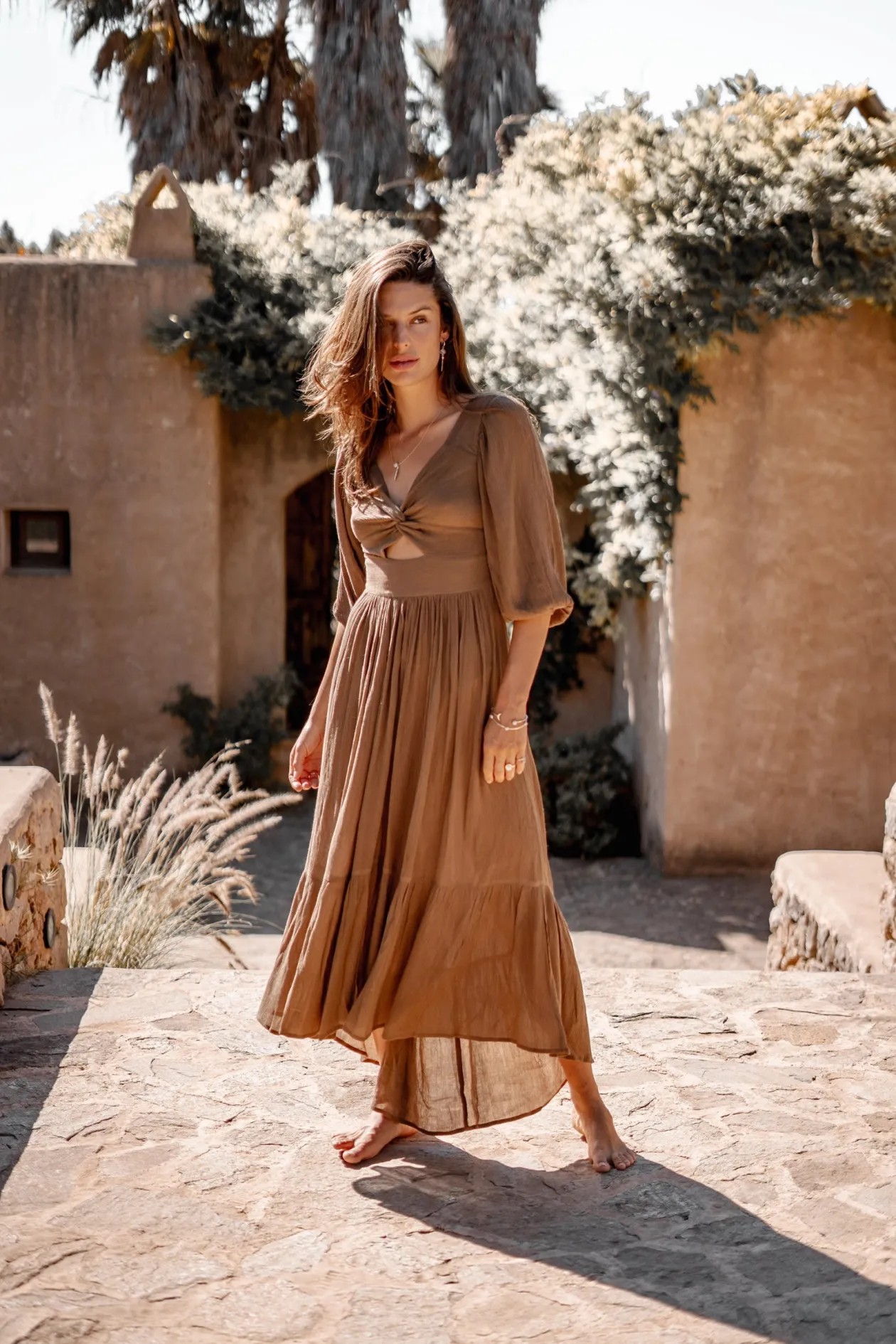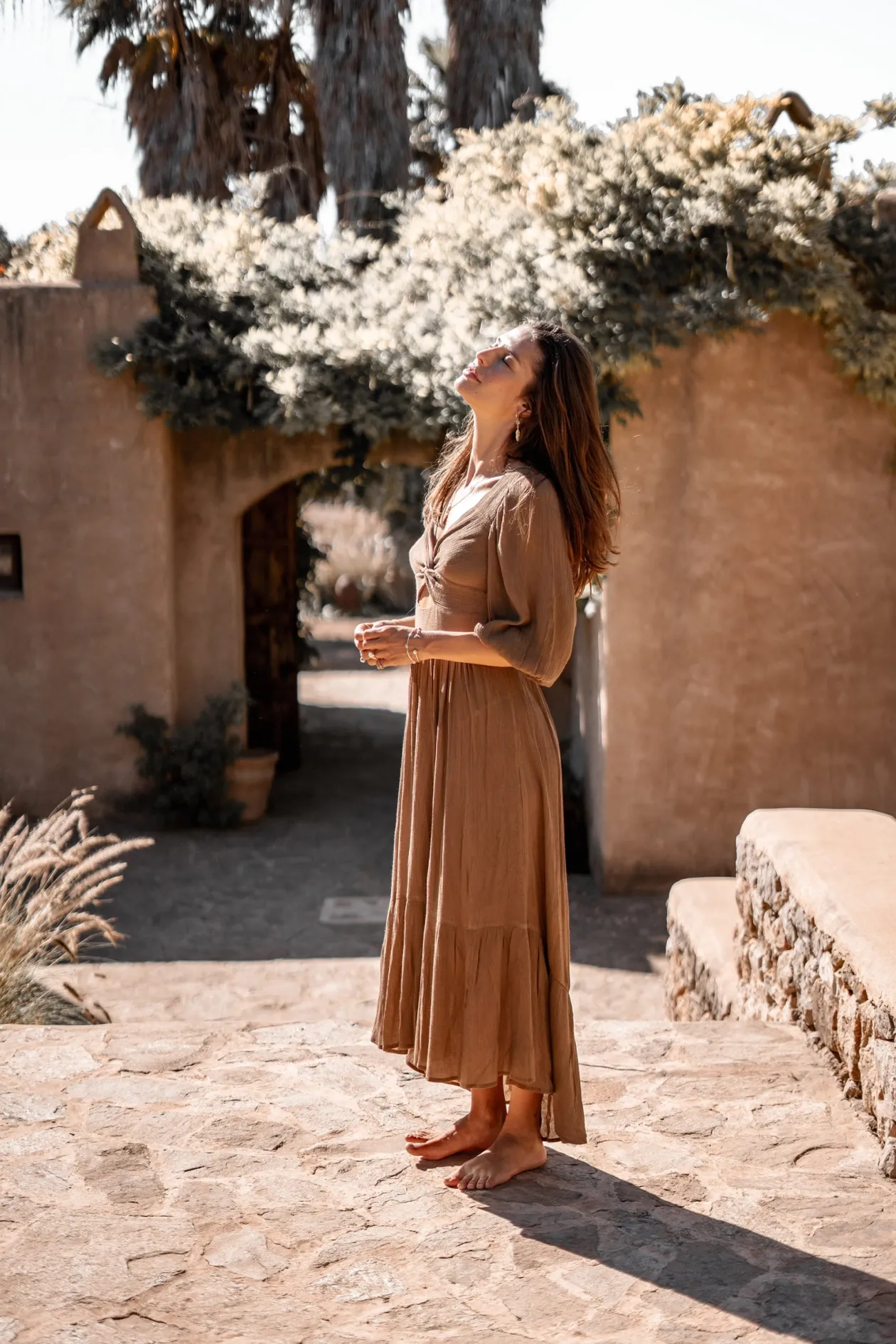 Entdecke das Kleid Santi Taupe, ein langes Kleid, das Eleganz und Komfort vereint. Das gedrehte Detail auf der Vorderseite und die Puffärmel mit elastischen Trägern sorgen für einen verspielten Twist. Dieses Kleid ist perfekt für einen Tagesausflug oder eine durchtanzte Nacht und lässt dich stilvoll erstrahlen. Kombiniere es mit Sandalen für einen Boho-Chic-Look!