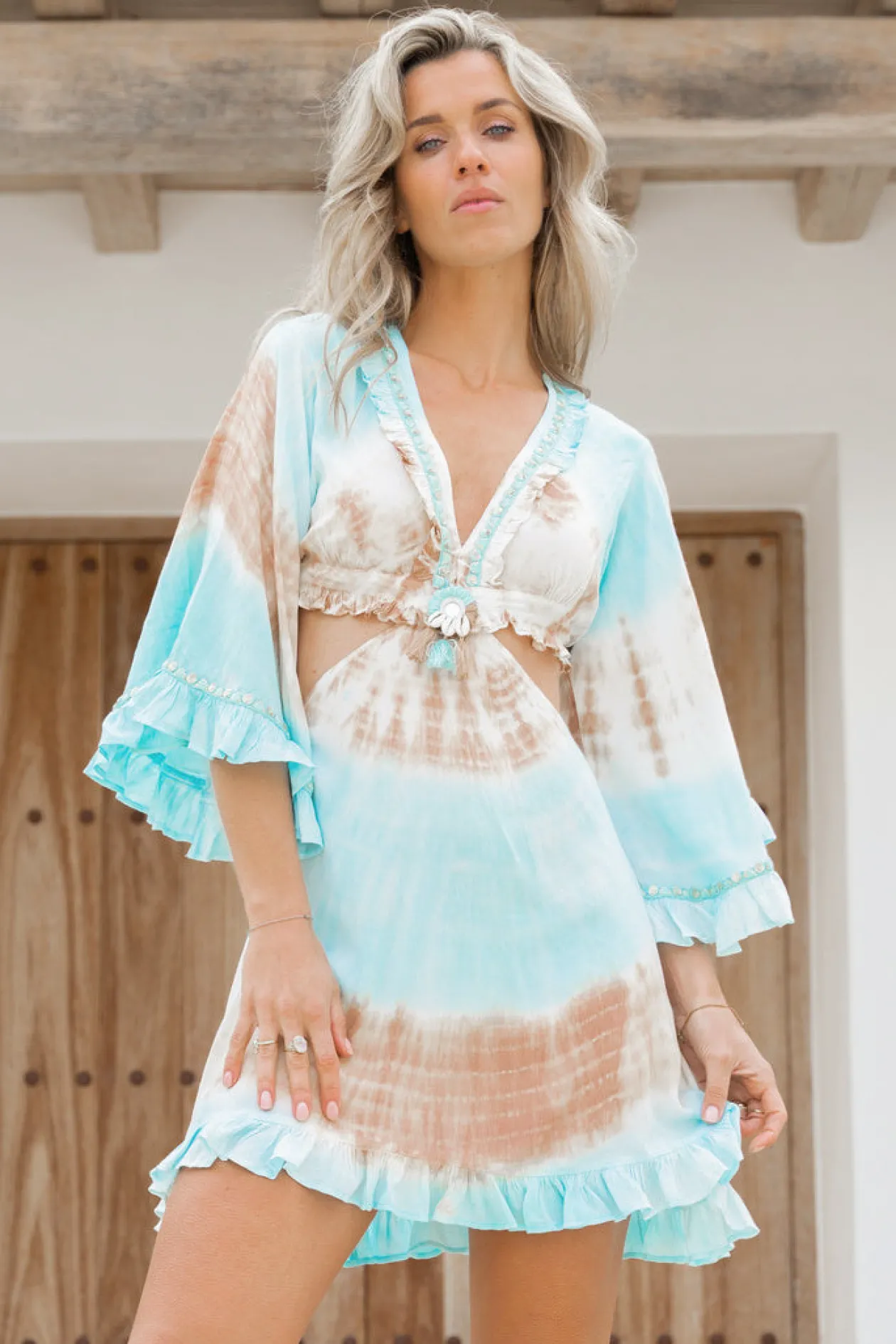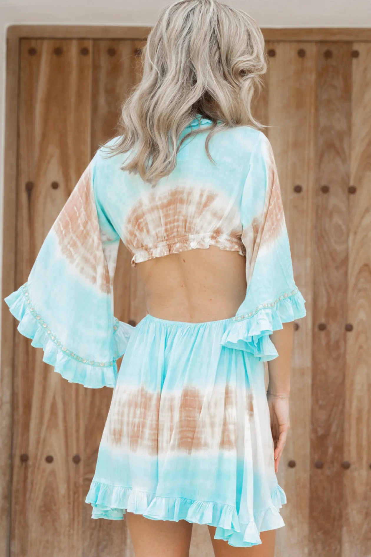 - Hat einen tiefen V-Ausschnitt mit Rüschen