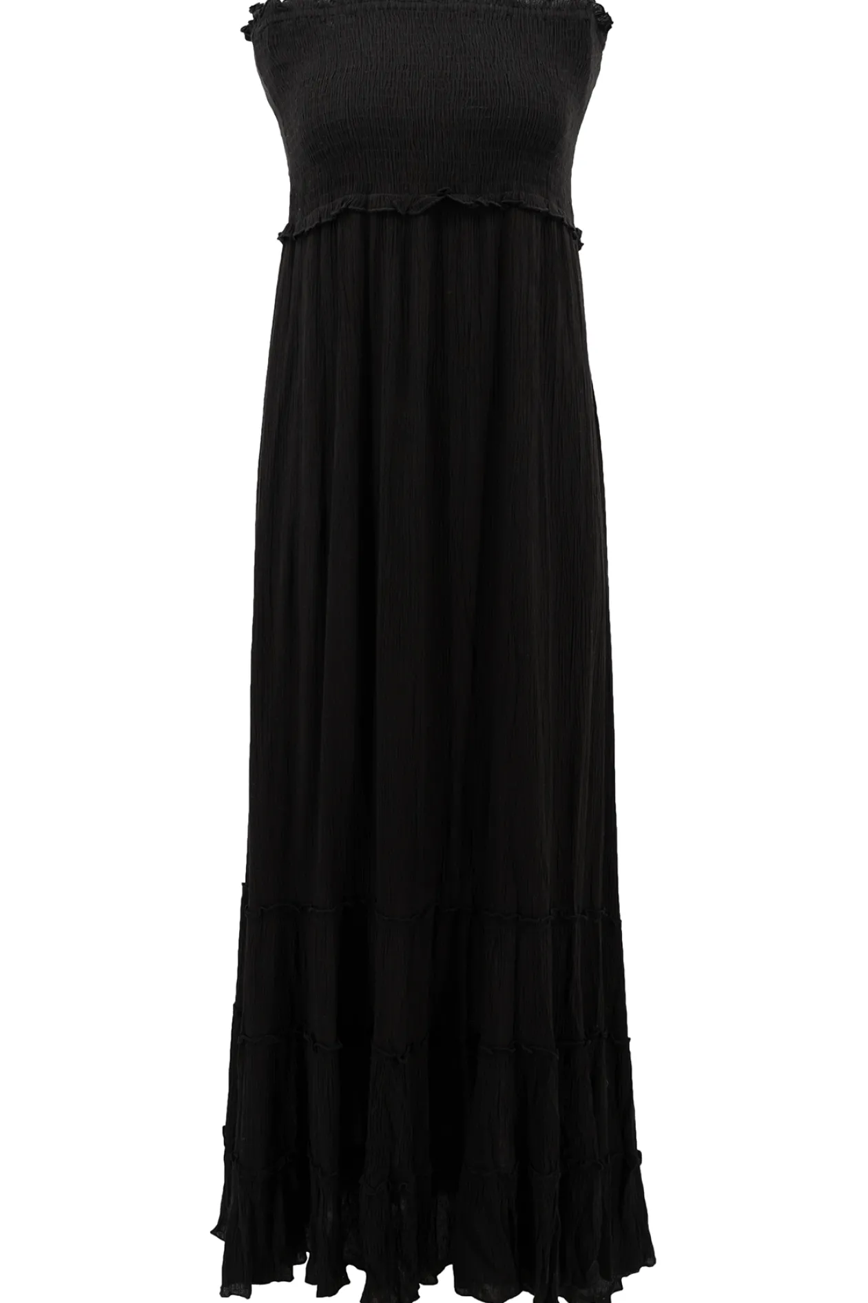 Entdecke das Kleid Serra Black, eine perfekte Mischung aus Eleganz und Komfort. Dieses schulterfreie Kleid mit Rüschendetails und gesmokter Büste ist ideal für einen Sommertag oder eine Nacht im Freien. Kombiniere es mit Sandalen für einen lässigen Look oder mit Absätzen für einen schicken Look. Fühle dich frei und stilvoll!