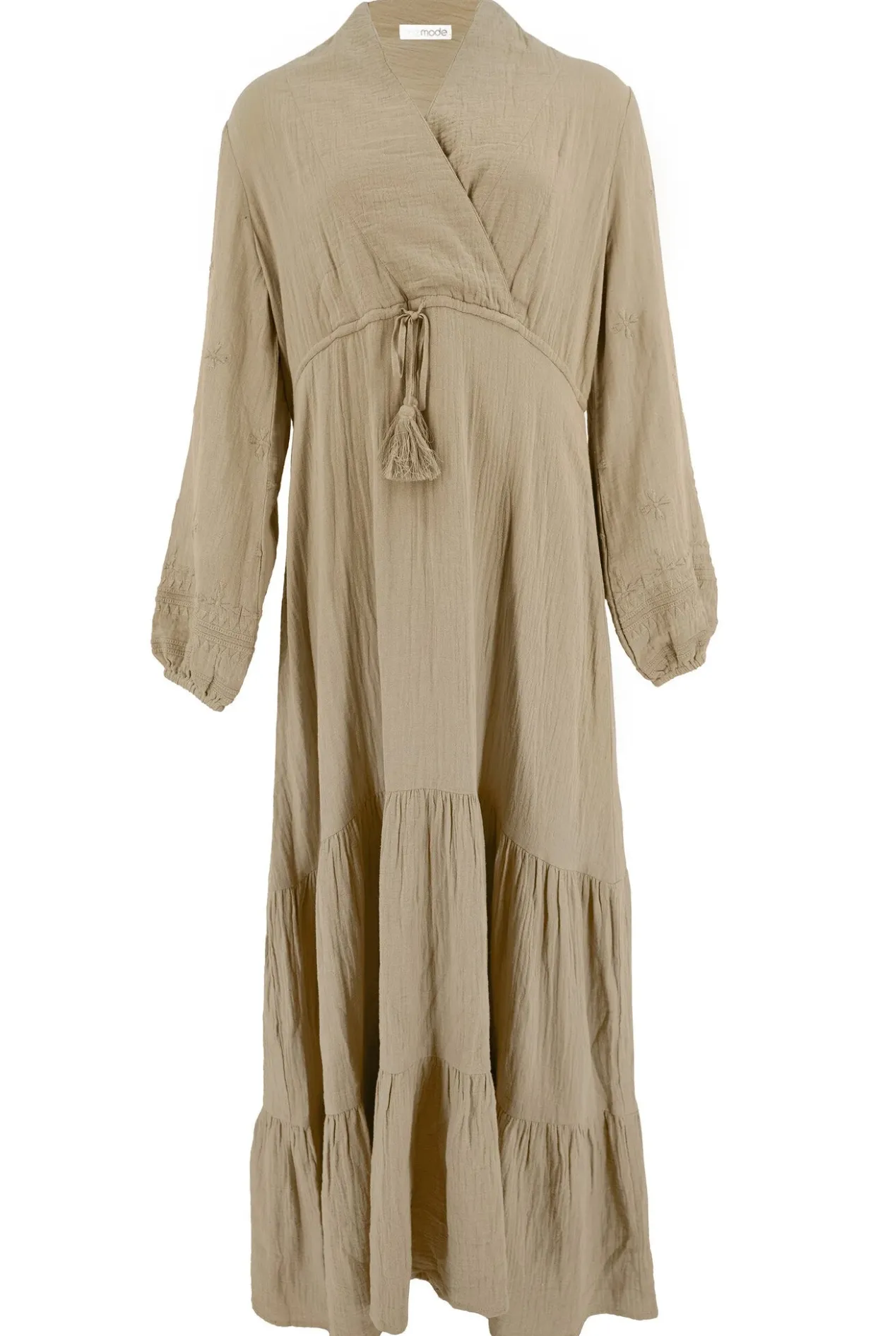 Das Kleid Sonrisa Taupe ist das ultimative Must-have für jede Fashionista! Mit seinem langen, bestickten Stoff, den Puffärmeln und dem V-Ausschnitt mit Überlappung wirst du mühelos Eleganz ausstrahlen. Die verstellbare Taille und das warme Futter machen es perfekt für jede Gelegenheit. Kombiniere es mit deinen Lieblingsstiefeln und Accessoires für einen kompletten Look!