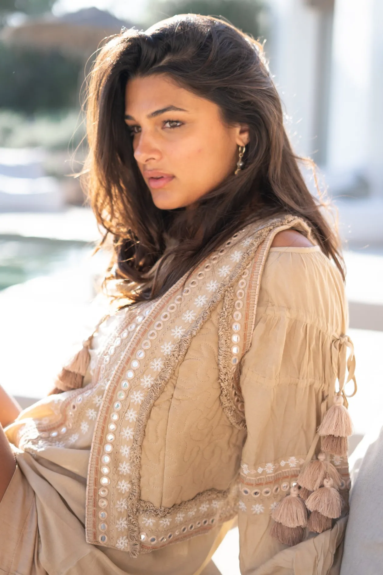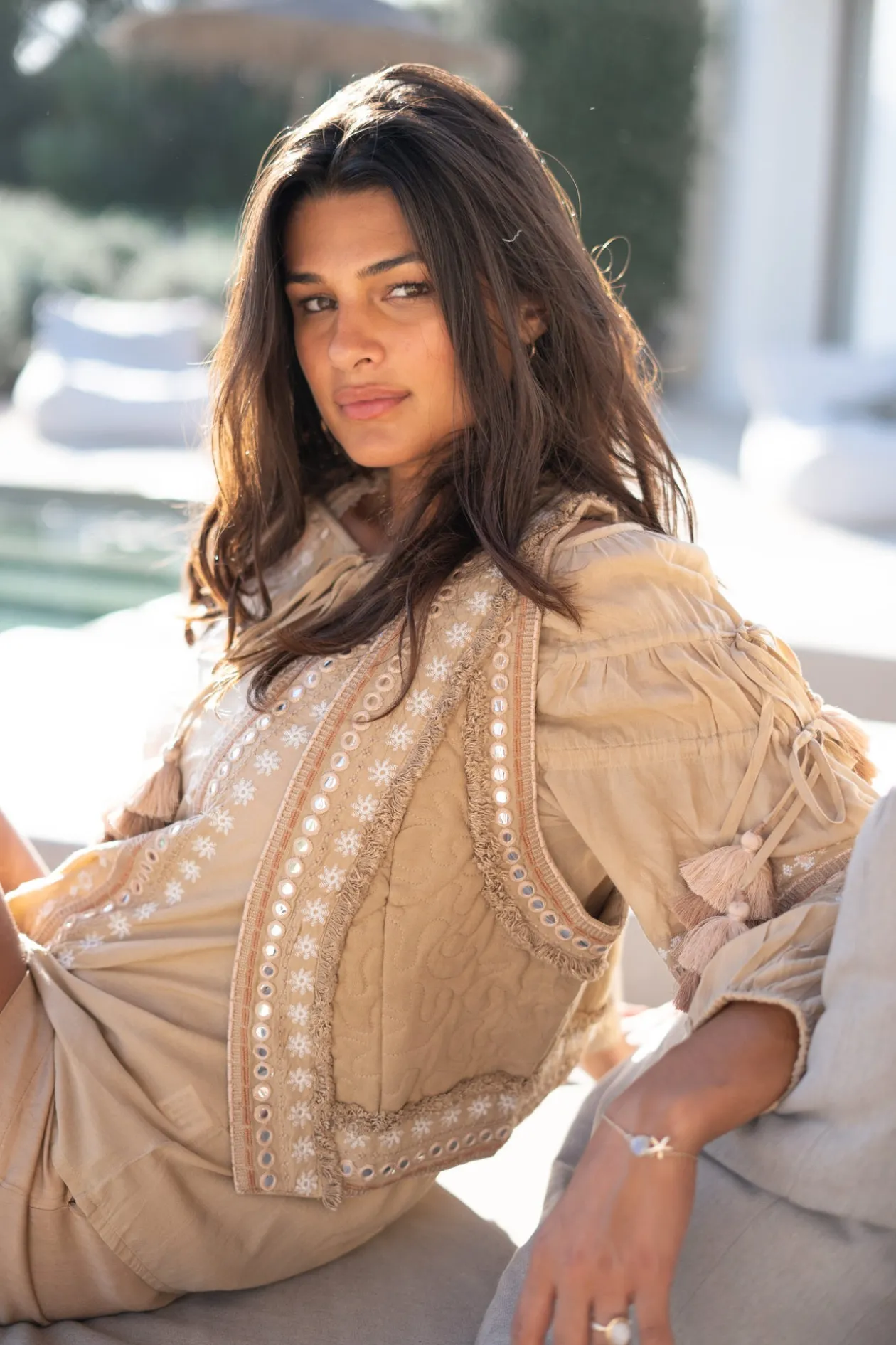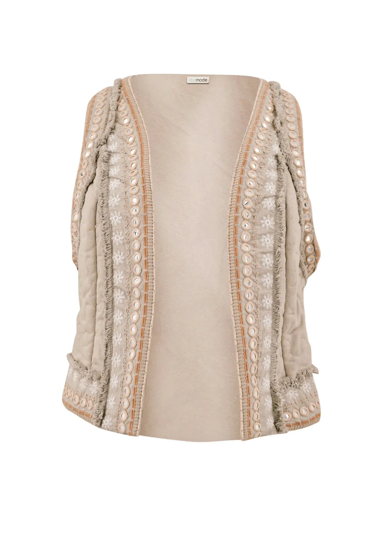 Entdecke das kurze Gilet Sierra Riqueza Light Taupe, ein Must-have für jede Fashionista, die subtilen Luxus liebt. Die spiegelnden Stickereien verleihen deinem Outfit einen verspielten Twist. Kombiniere es mit einer hellen Bluse und Jeans für einen mühelosen Ibiza-Look. Lass deinen Stil strahlen!