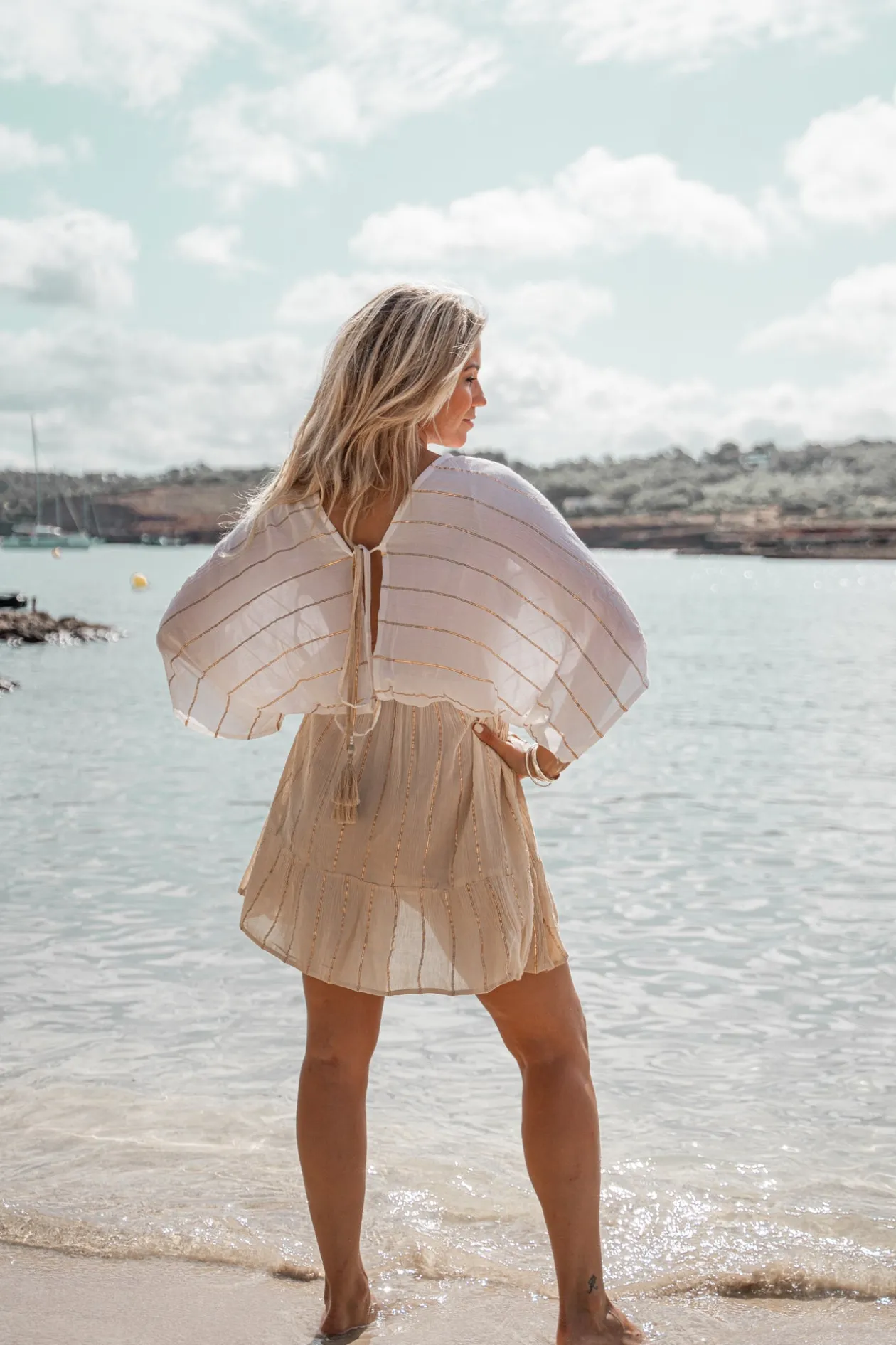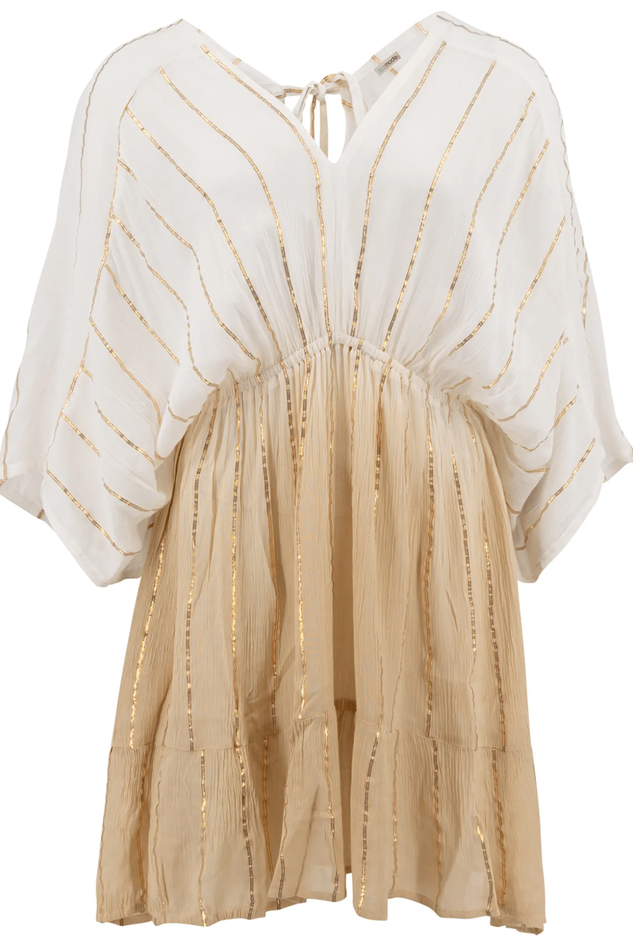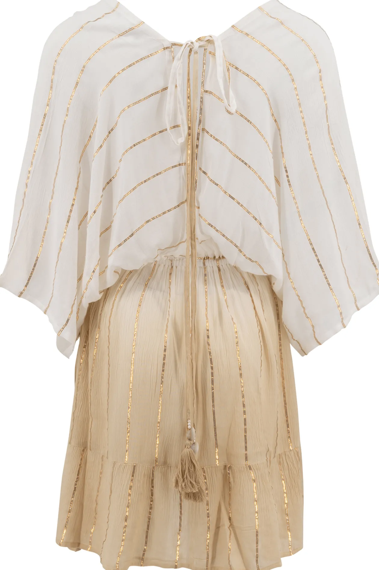 Entdecke den Zauber von Ibiza mit dem kurzen Kleid Emilia Weiß/Sand. Das Kleid aus 100% Viskose hat einen eleganten V-Ausschnitt, einen elastischen Bund und 3/4-Ärmel. Perfekt für Sommertage, kombiniere es mit Sandalen für einen mühelosen Look. Fühle dich jederzeit und überall frei und stilvoll!