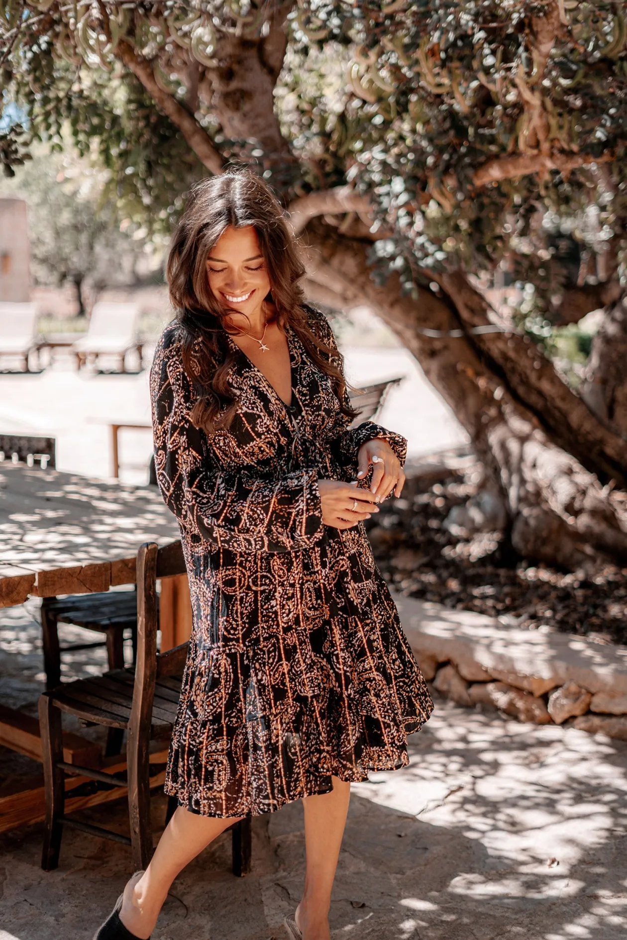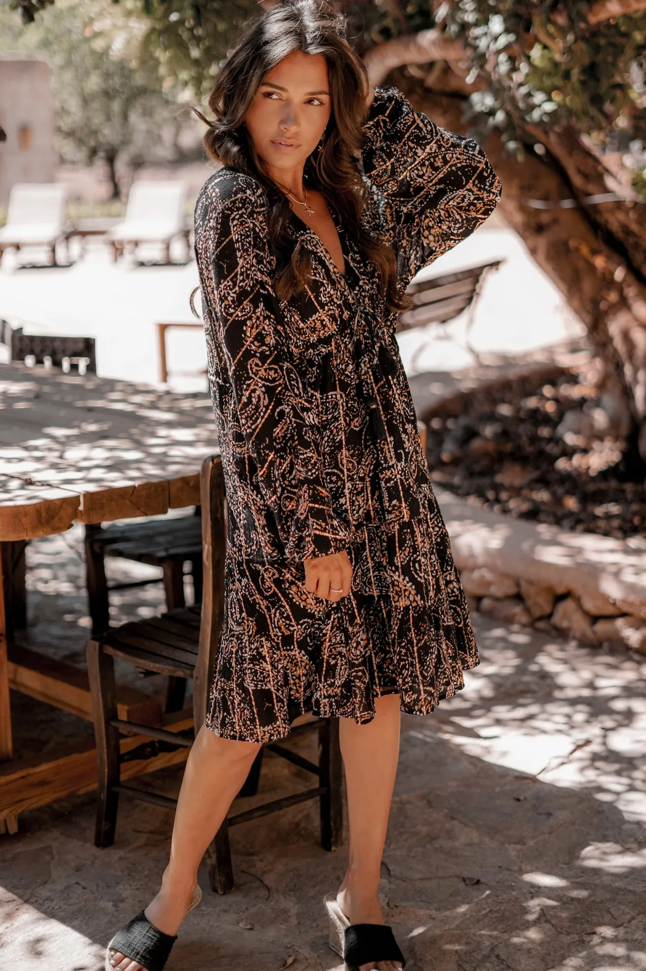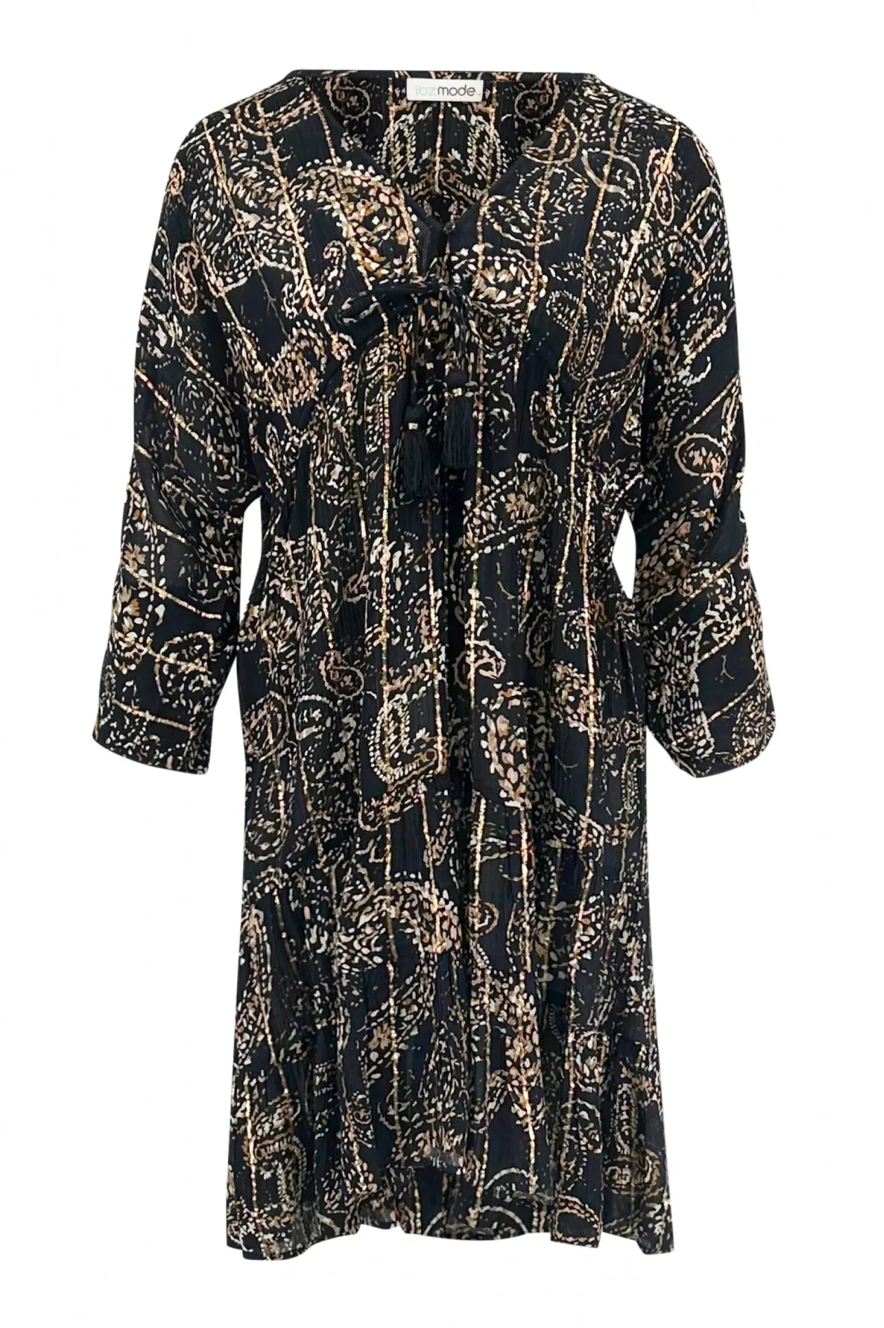 Das kurze Kleid Mio Paisley Black ist dein ultimatives Sommer-Must-Have! Mit seinem tiefen V-Ausschnitt und dem verspielten Paisley-Print strahlst du mühelos Eleganz aus. Der Knopfverschluss im Brustbereich und der verstellbare Bund sorgen für eine perfekte Passform. Kombiniere es mit Sandalen für einen Tag am Strand oder mit Absätzen für einen Abend im Freien. Fühle dich frei und stilvoll!