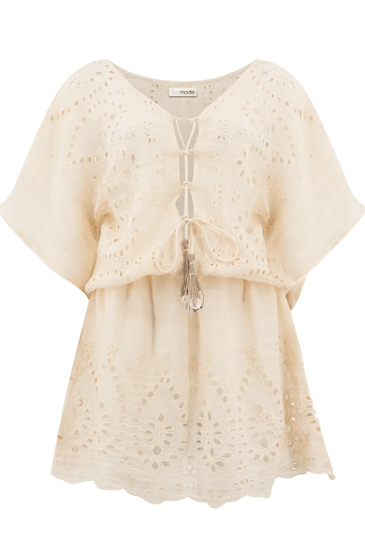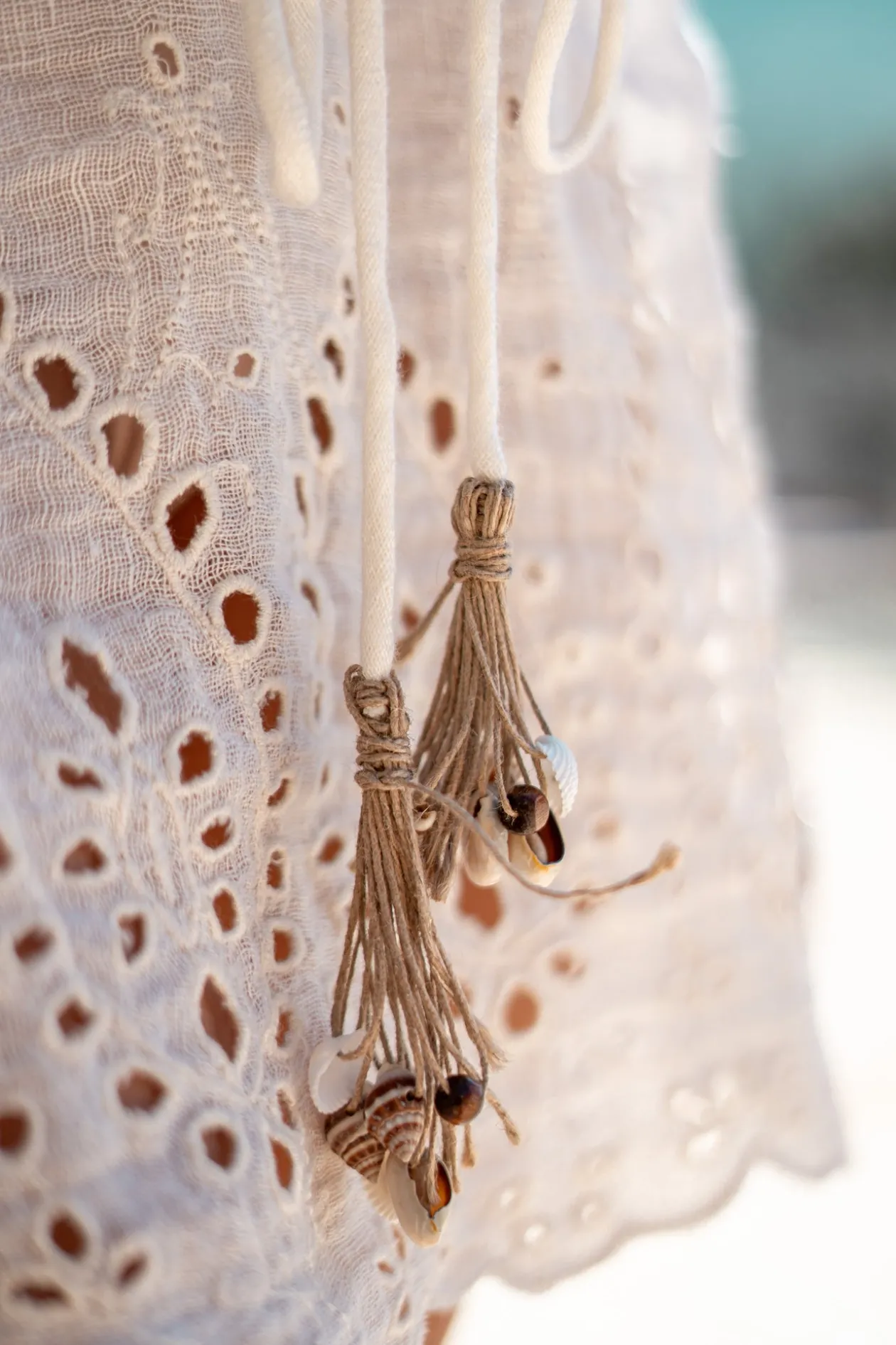 Entdecke den Zauber des kurzen Kleides Mirabel Powder, ein luftiges Kleid aus Leinenbroderie, das mühelos Eleganz und Komfort vereint. Der elastische Taillenbund und die zarten Muschel- und Jutedetails machen es perfekt für einen Sommertag. Kombiniere es mit Sandalen für einen lässigen Look oder mit Absätzen für eine Nacht. Fühle dich frei und stilvoll!