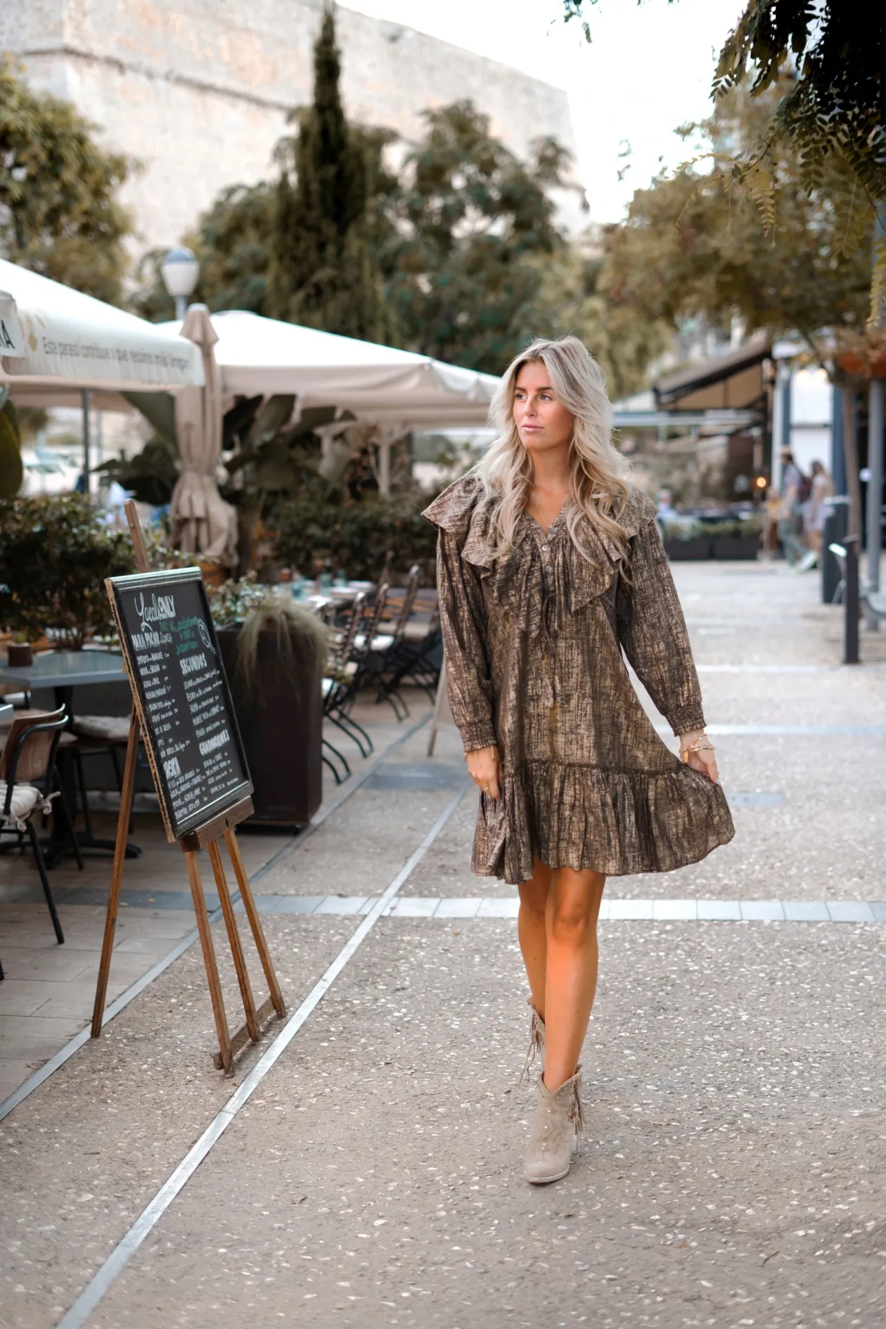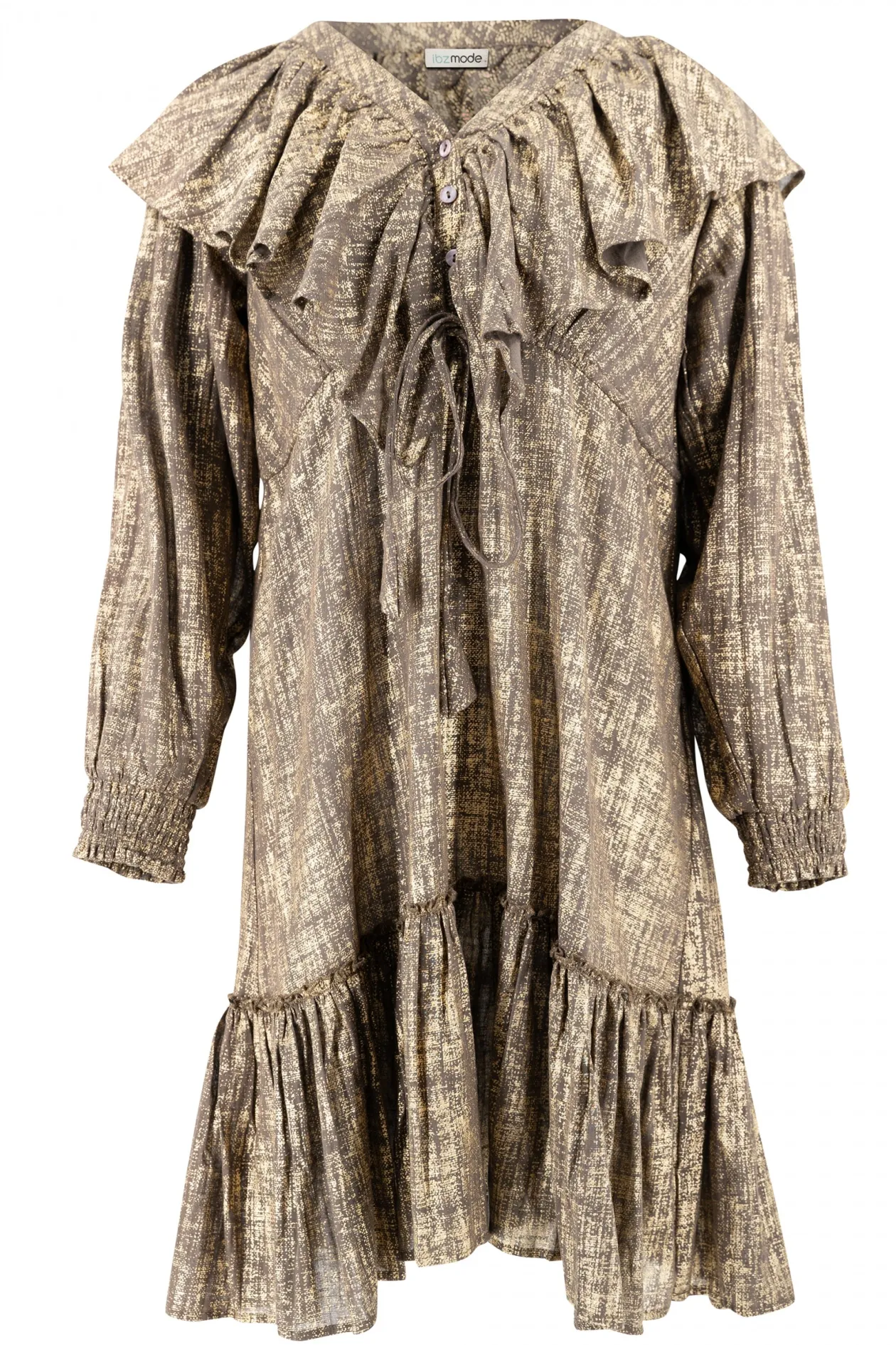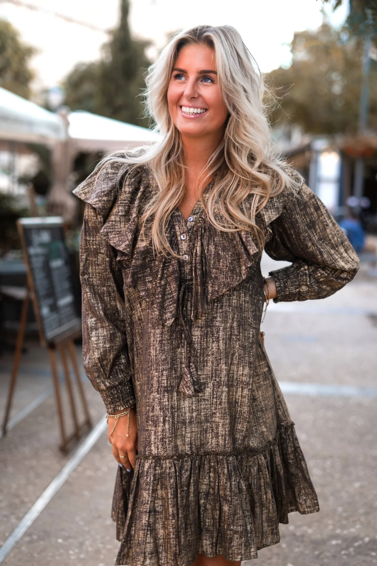 Entdecke das kurze Kleid Ruffle Sparkle Taupe Gold, ein funkelnder Blickfang für jeden Anlass. Die luftigen Rüschen und die verstellbare Taille sorgen für einen verspielten und doch eleganten Look. Kombiniere es mit Sandalen für einen Tag am Strand oder mit Stöckelschuhen für einen Abend im Freien. Fühle dich frei und unwiderstehlich!