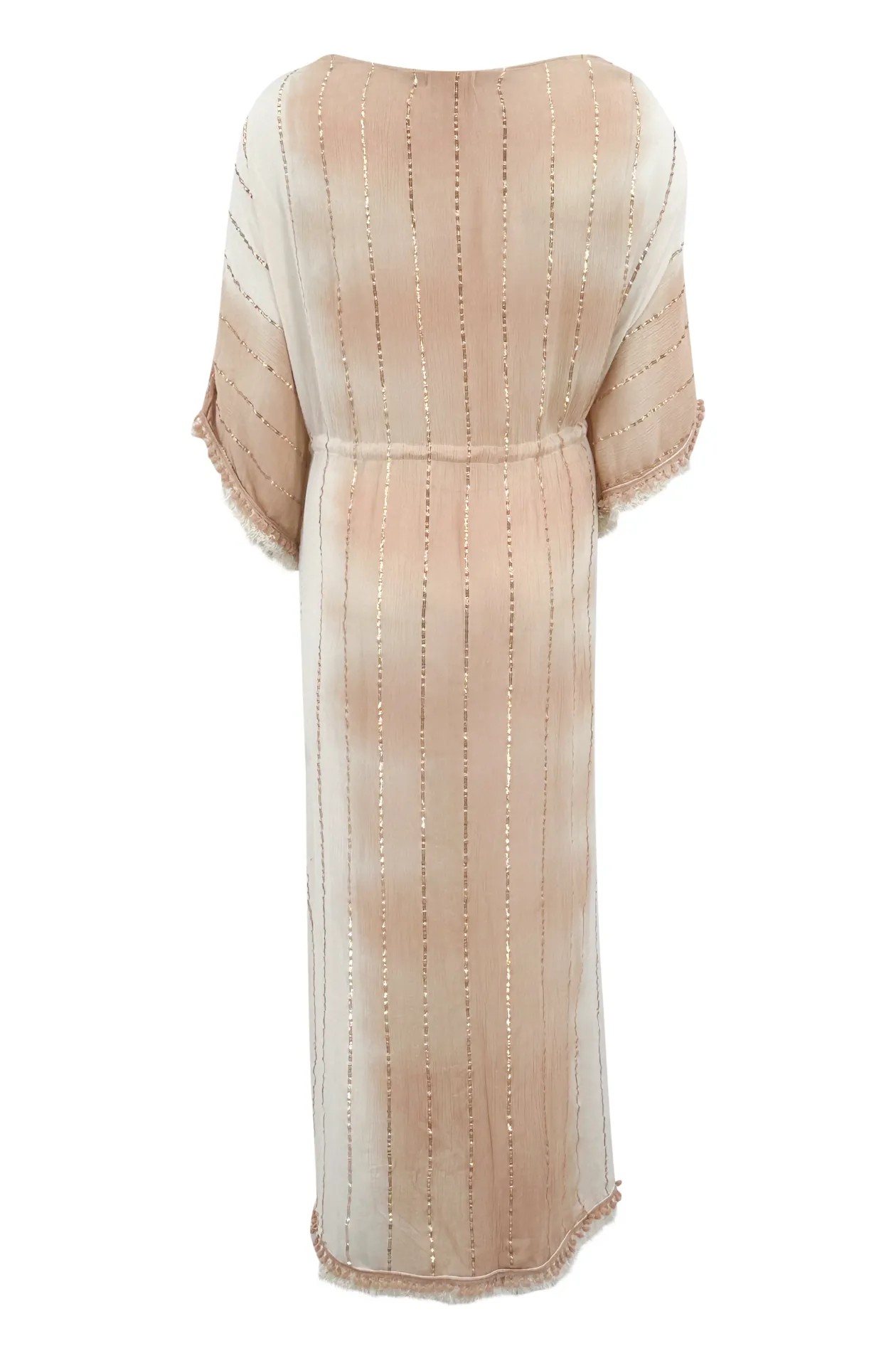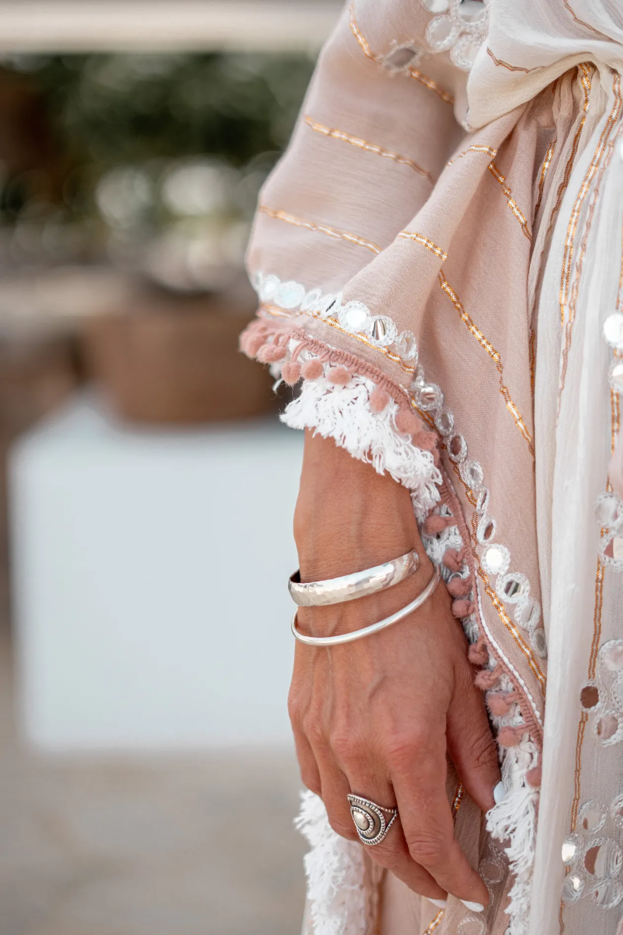 Der lange Kimono Aine Lurex White/Beige ist das ultimative Statement-Piece, das Luxus und Boho-Vibes vereint. Der Kimono ist mit dekorativen Spiegeln, Stickereien und Fransen verziert und strahlt pure Eleganz aus. Kombiniere ihn mit deinem Lieblingsbikini oder einem Sommerkleid für einen unvergesslichen Ibiza-Look. Fühle dich schick und frei!