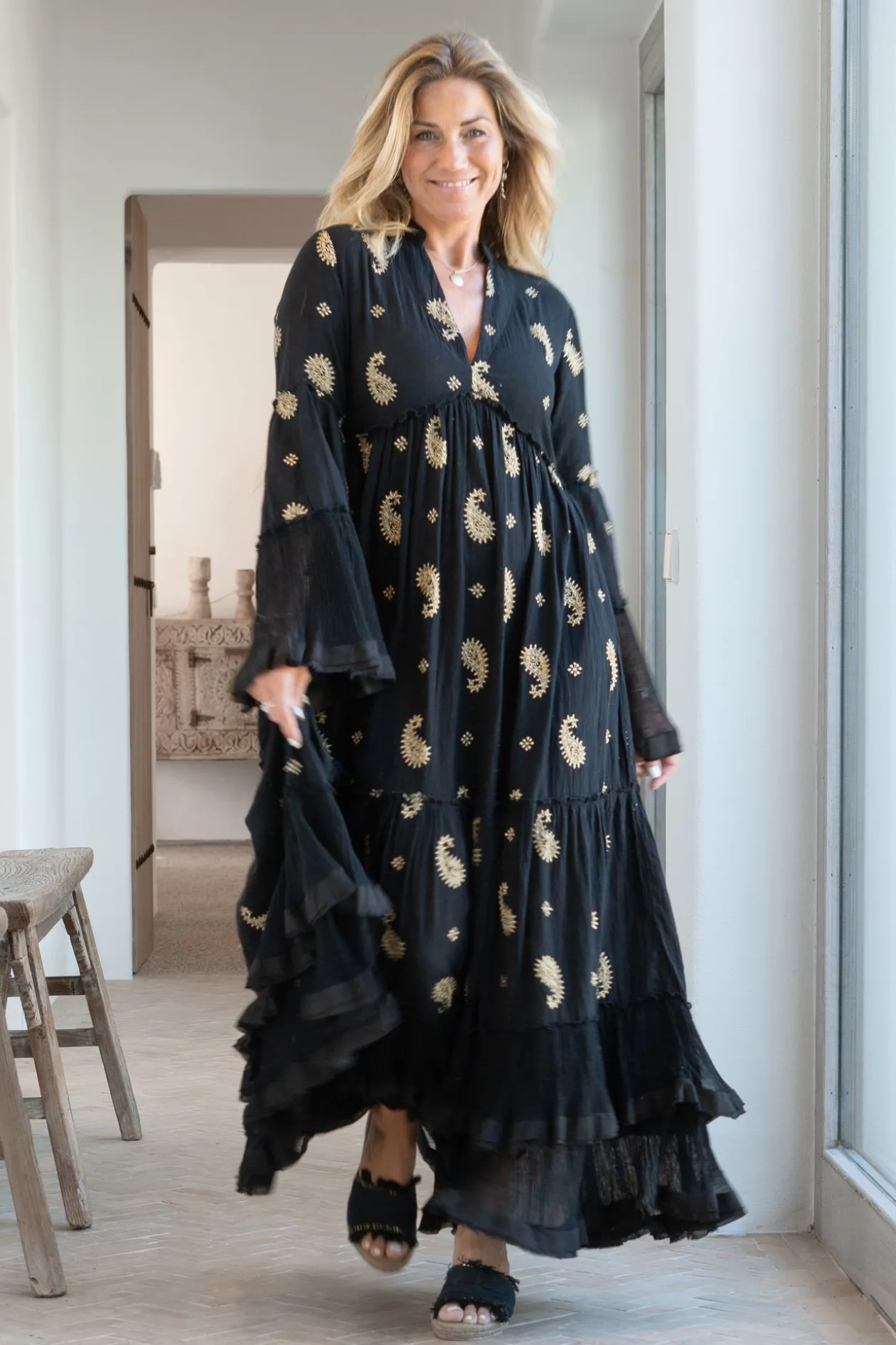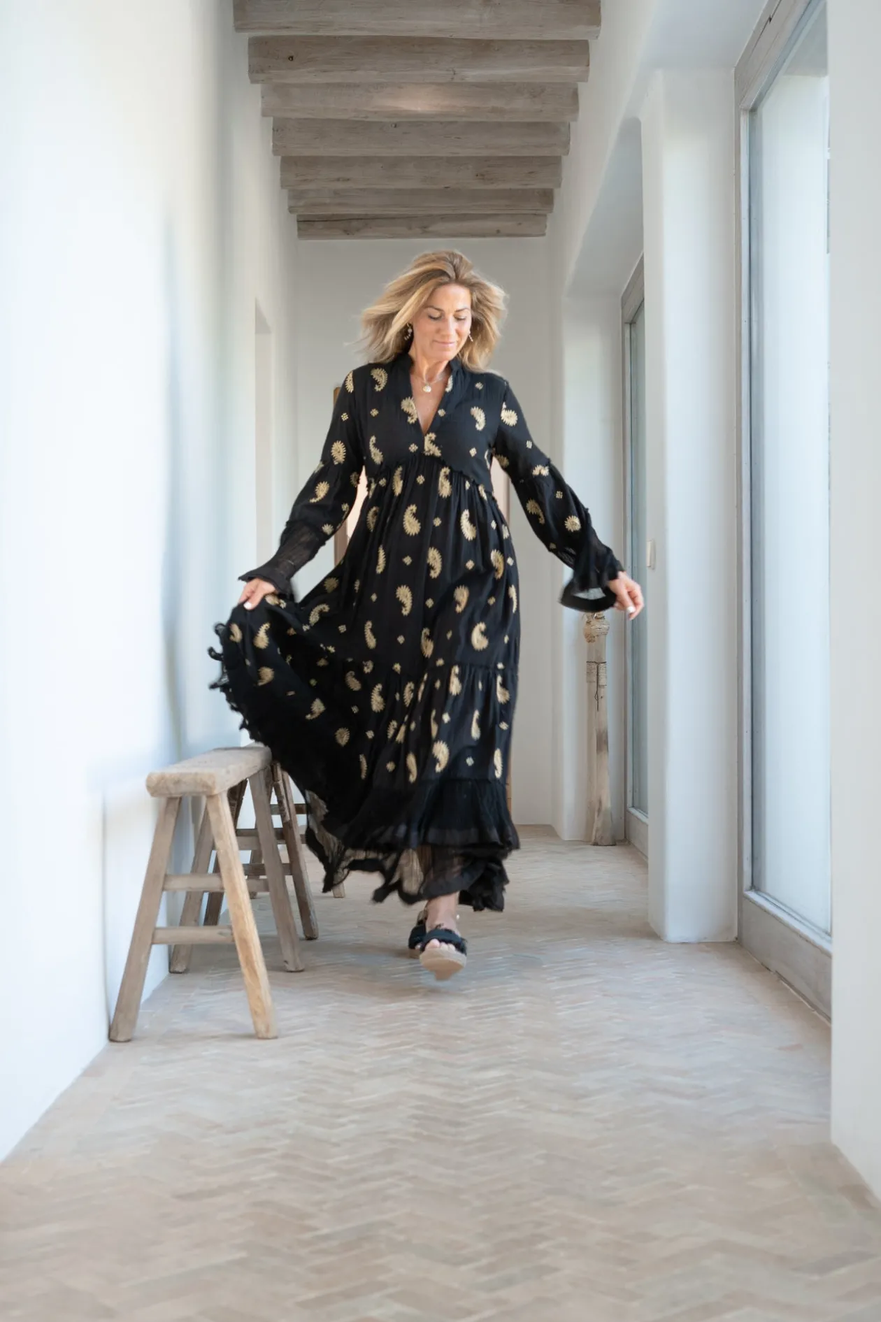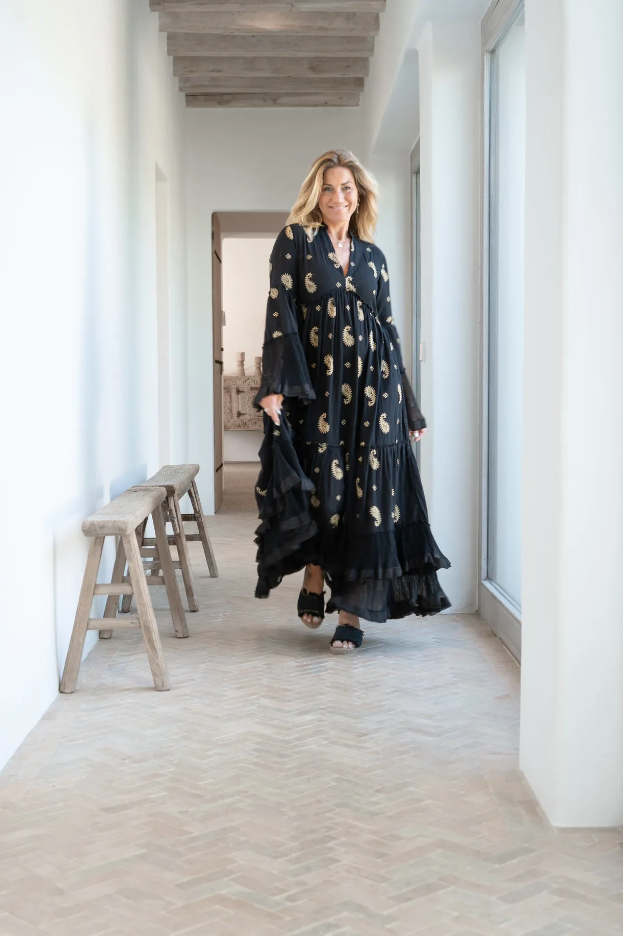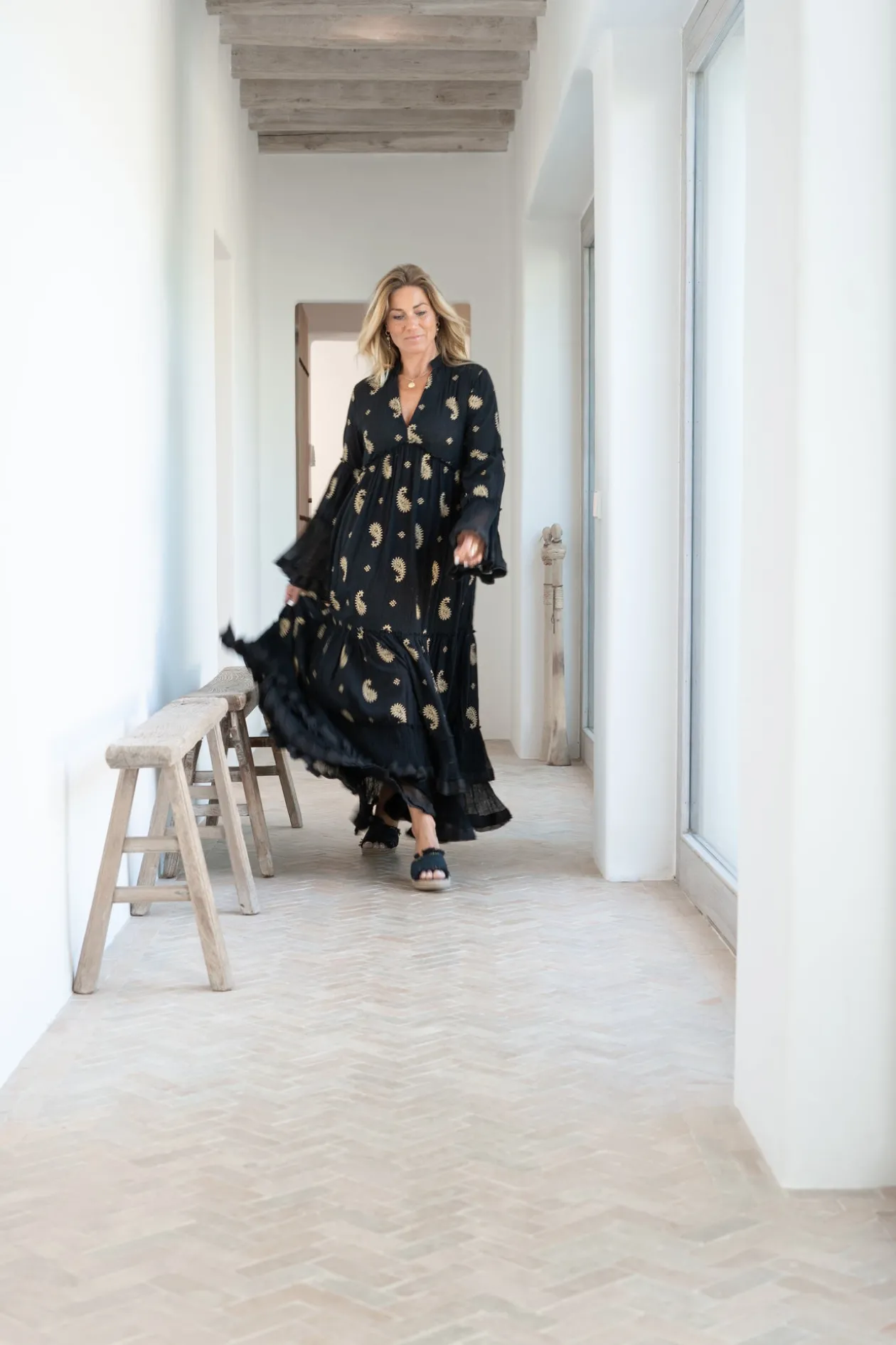 Entdecke das Maxikleid Dali Esencia Black, das ultimative Essential für den Ibiza-Style! Dieses Baumwollkleid mit V-Ausschnitt und Trompetenärmeln umschmeichelt deine Silhouette mit einem verspielten Drapierungseffekt. Perfekt für einen Abend im Freien oder einen Spaziergang am Strand. Kombiniere es mit Sandalen und einem Hut für einen unverwechselbaren Boho-Chic-Look!