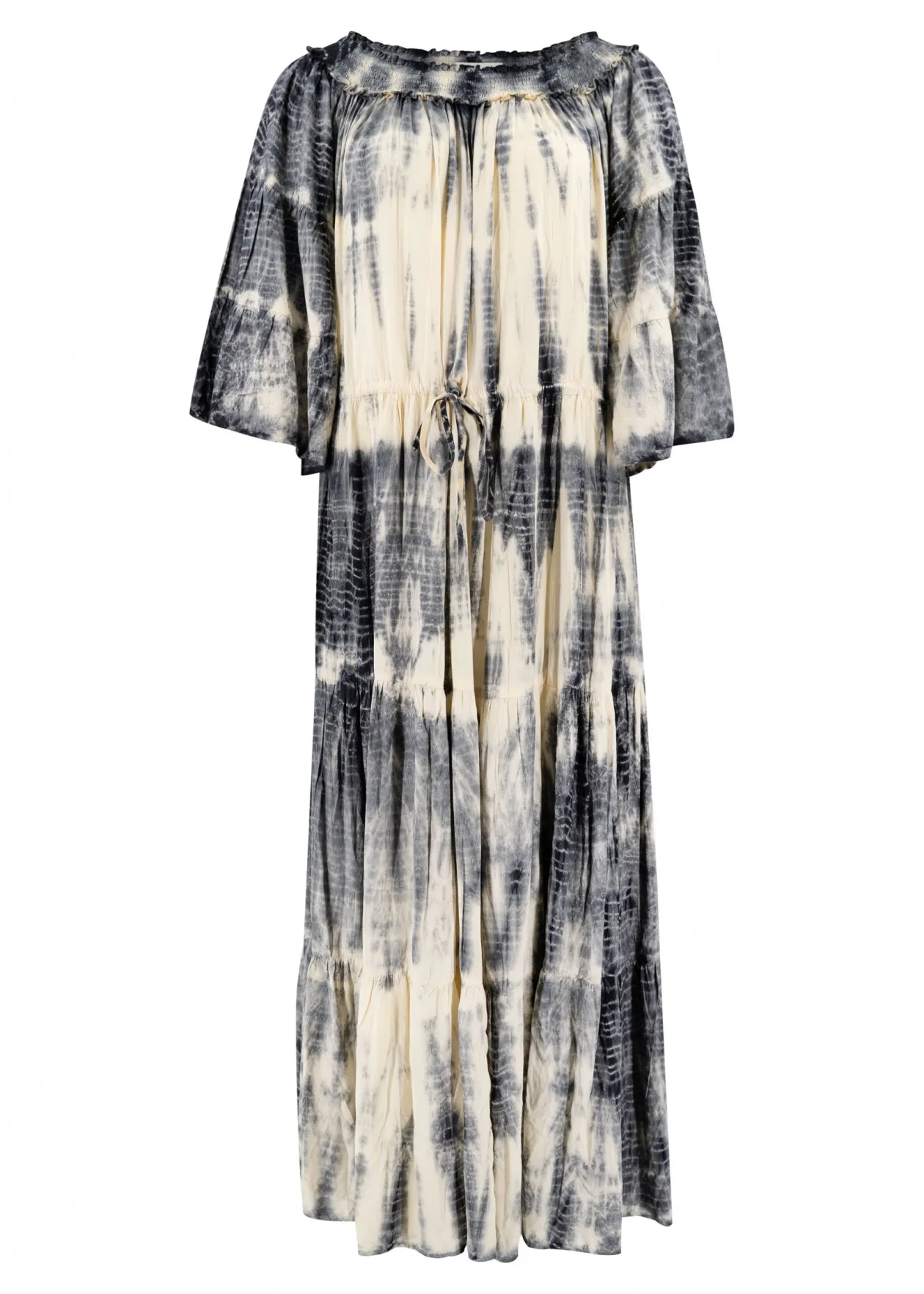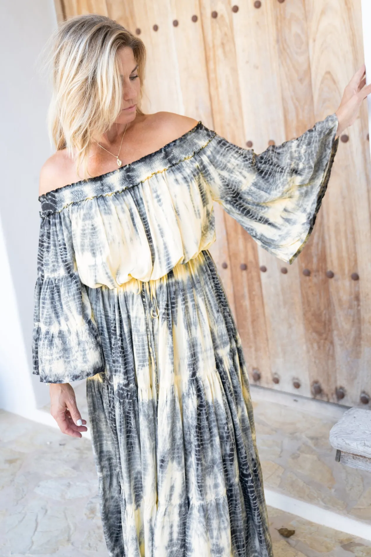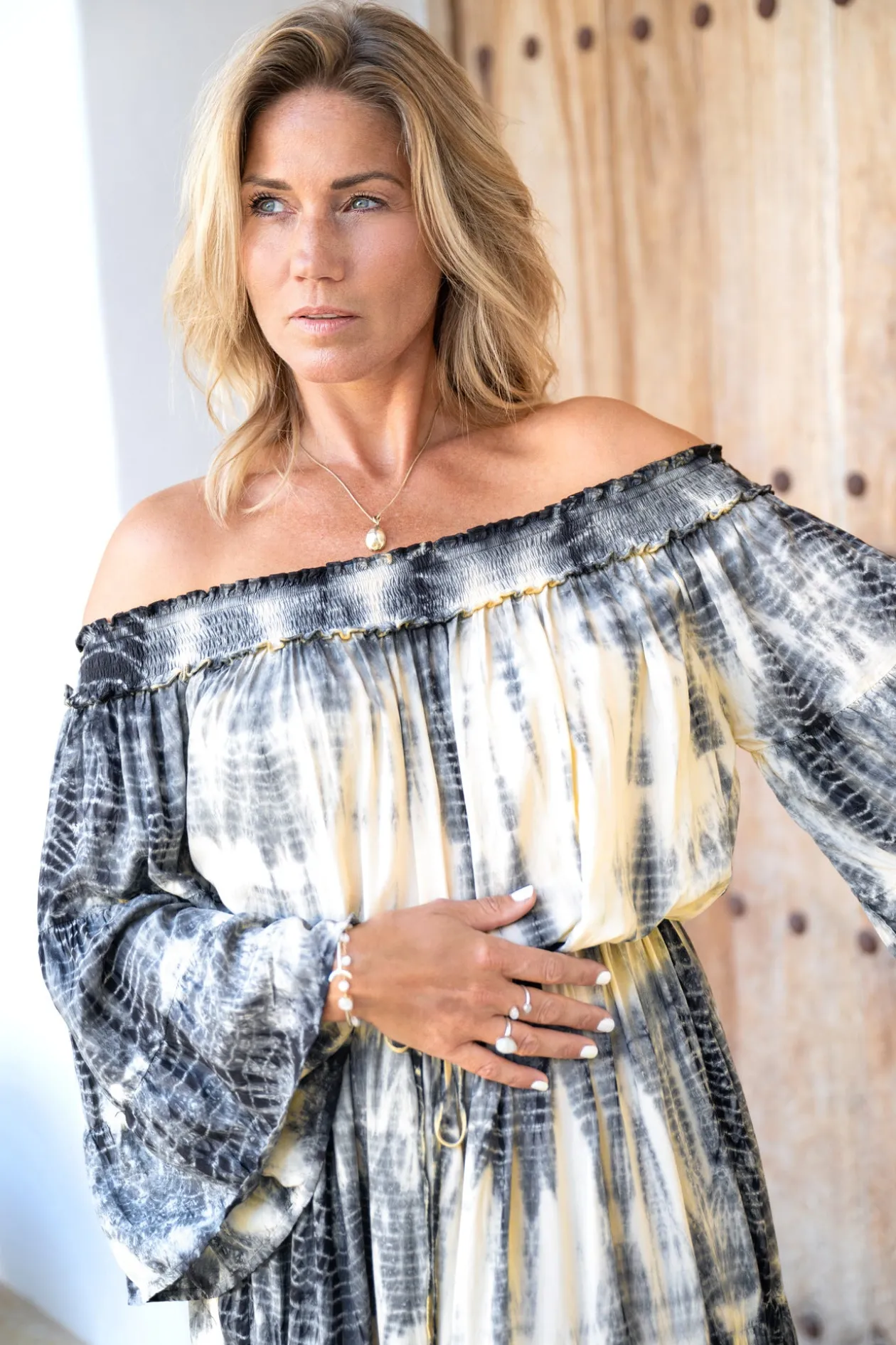 Entdecke das Maxikleid Jamee Boho Sand, ein ultimatives Ibiza-Must-have! Es ist aus weicher Viskose gefertigt und besticht durch einen einzigartigen Tie-Dye-Druck und charmante Schmetterlingsärmel. Trage es schulterfrei für einen Boho-Chic-Look und betone deine Taille mit dem elastischen Band. Perfekt für sonnige Tage und laue Abende. Strahlen Sie in Ihrem eigenen Stil!
