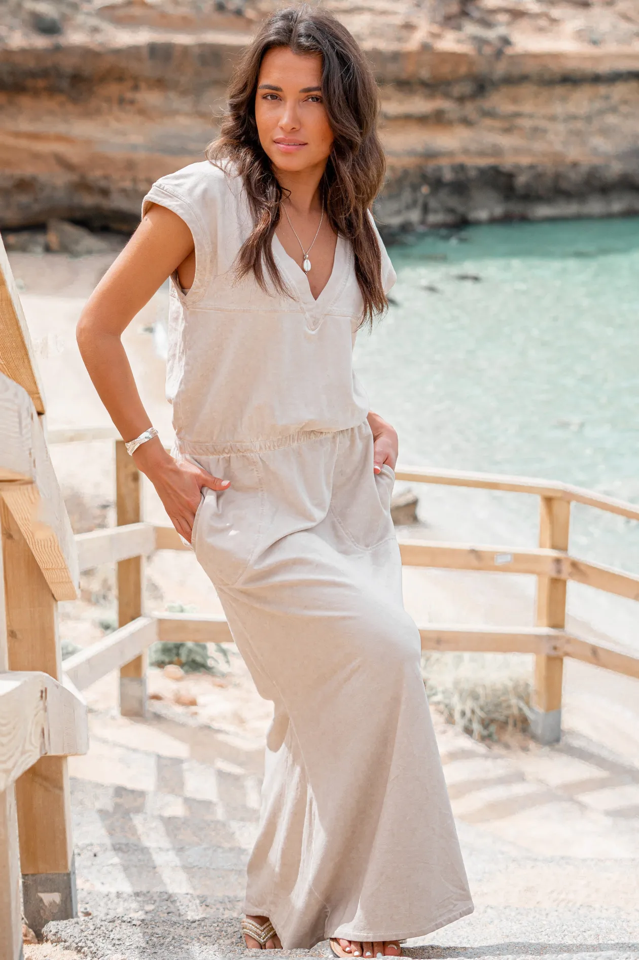 Entdecke den Charme des Maxikleids Lili Stone! Dieses Kleid aus Jersey-Stretchstoff mit Flügelärmeln und V-Ausschnitt bietet ultimativen Komfort und Stil. Der elastische Bund und die Seitentaschen machen es perfekt für jede Gelegenheit. Trage es mit Sandalen für einen entspannten Ibiza-Vibe. Fühle dich frei und modisch!