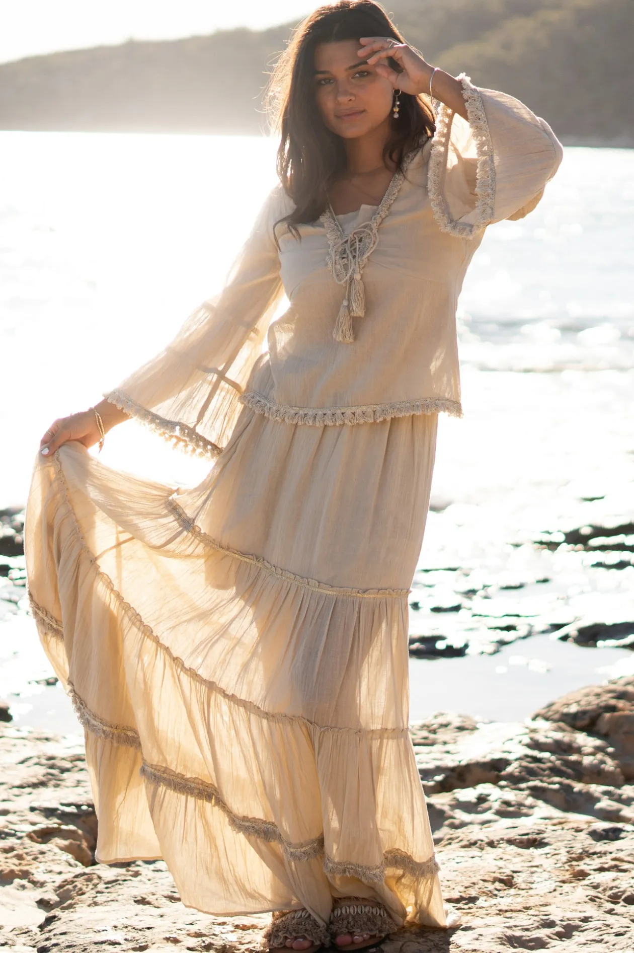Entfliehe in die Sonne mit dem Slipper Bohé Dream Sand, in dem Boho-Vibes und Ibiza-Flair zusammenkommen. Die goldenen Lurexdetails und Muscheln sorgen für einen verspielten Touch, während die Fransen dein Outfit zum Tanzen bringen. Perfekt zu einem luftigen Maxikleid für den ultimativen Strand-Look. Geh mit Stil aus dem Haus!