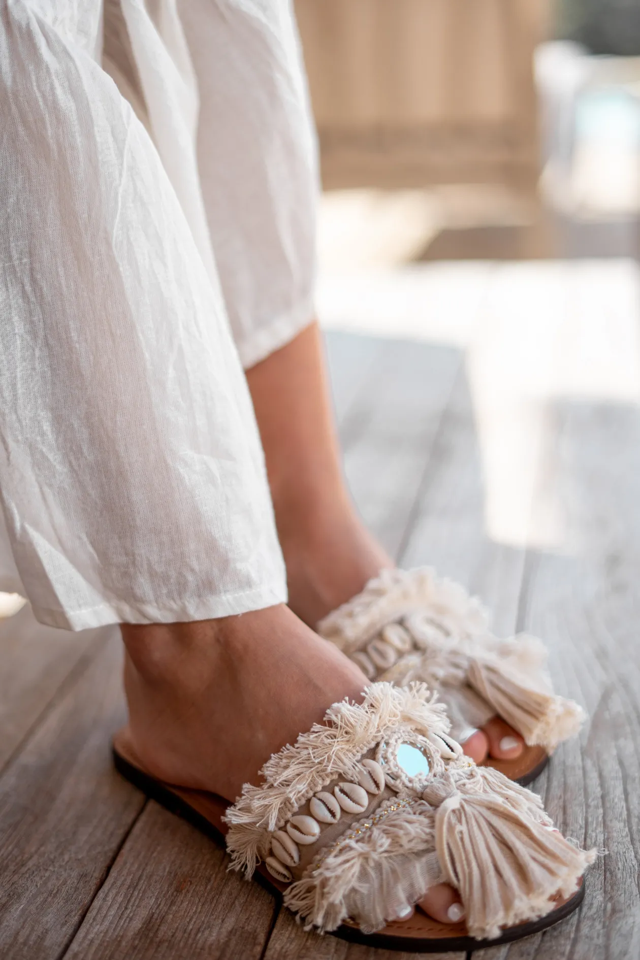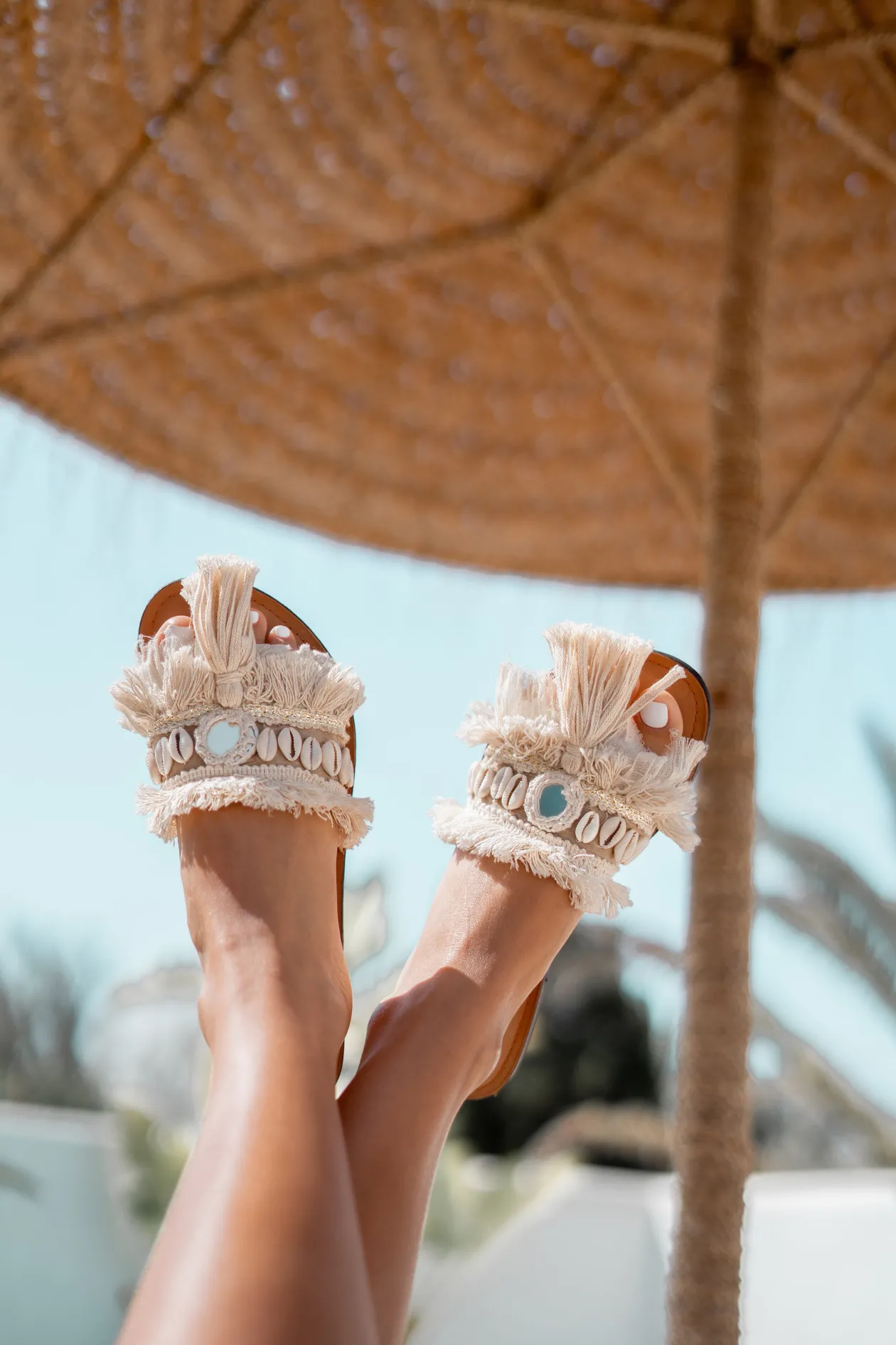 Entdecke die Bohé Natural Pantoffeln von IBZmode, wo Bohème-Chic auf ultimativen Komfort trifft. Mit einem breiten Riemen voller Rüschen, Muscheln und einem zierlichen Spiegel sind diese Slipper ein echter Hingucker. Perfekt zu einem luftigen Sommerkleid oder deinen Lieblingsjeans-Shorts für den unverwechselbaren Ibiza-Vibe!