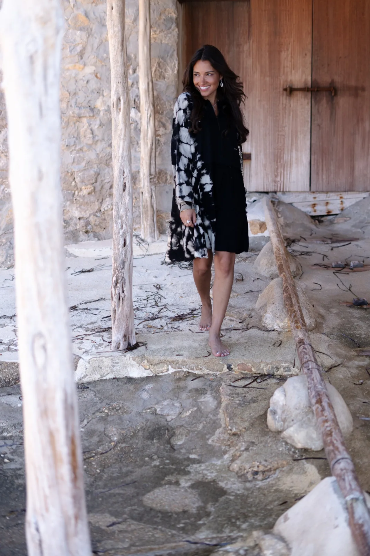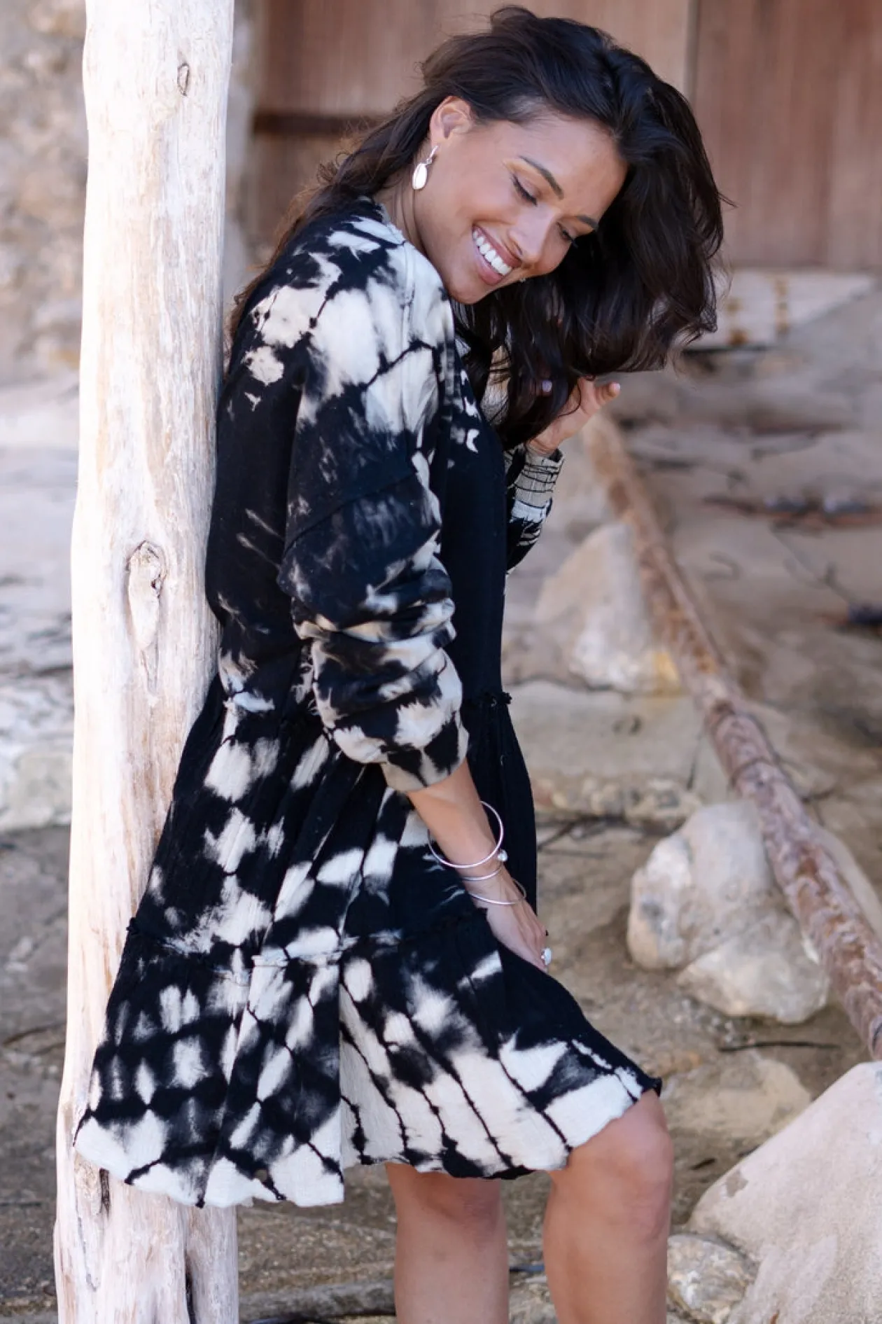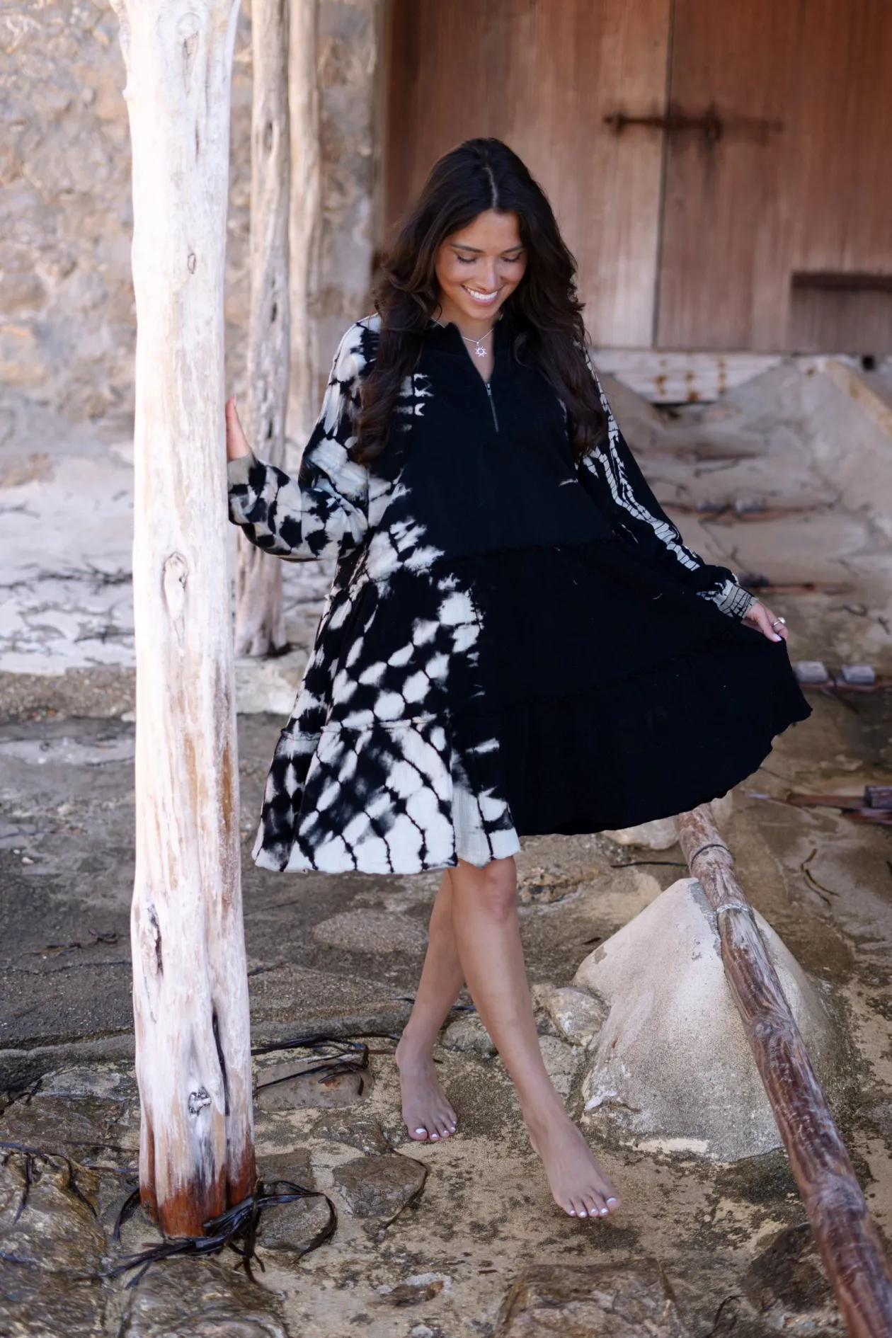 Das Sweater Dress Coleta Black Tye Dye ist dein neues Lieblingsteil für einen mühelosen, ausgefallenen Look. Das Kleid aus 100 % Baumwolle bietet ultimativen Komfort, während die verspielten Rüschennähte und der Reißverschluss am Ausschnitt für einen einzigartigen Twist sorgen. Kombiniere es mit klobigen Turnschuhen für einen urbanen Vibe. Trau dich zu glänzen!
