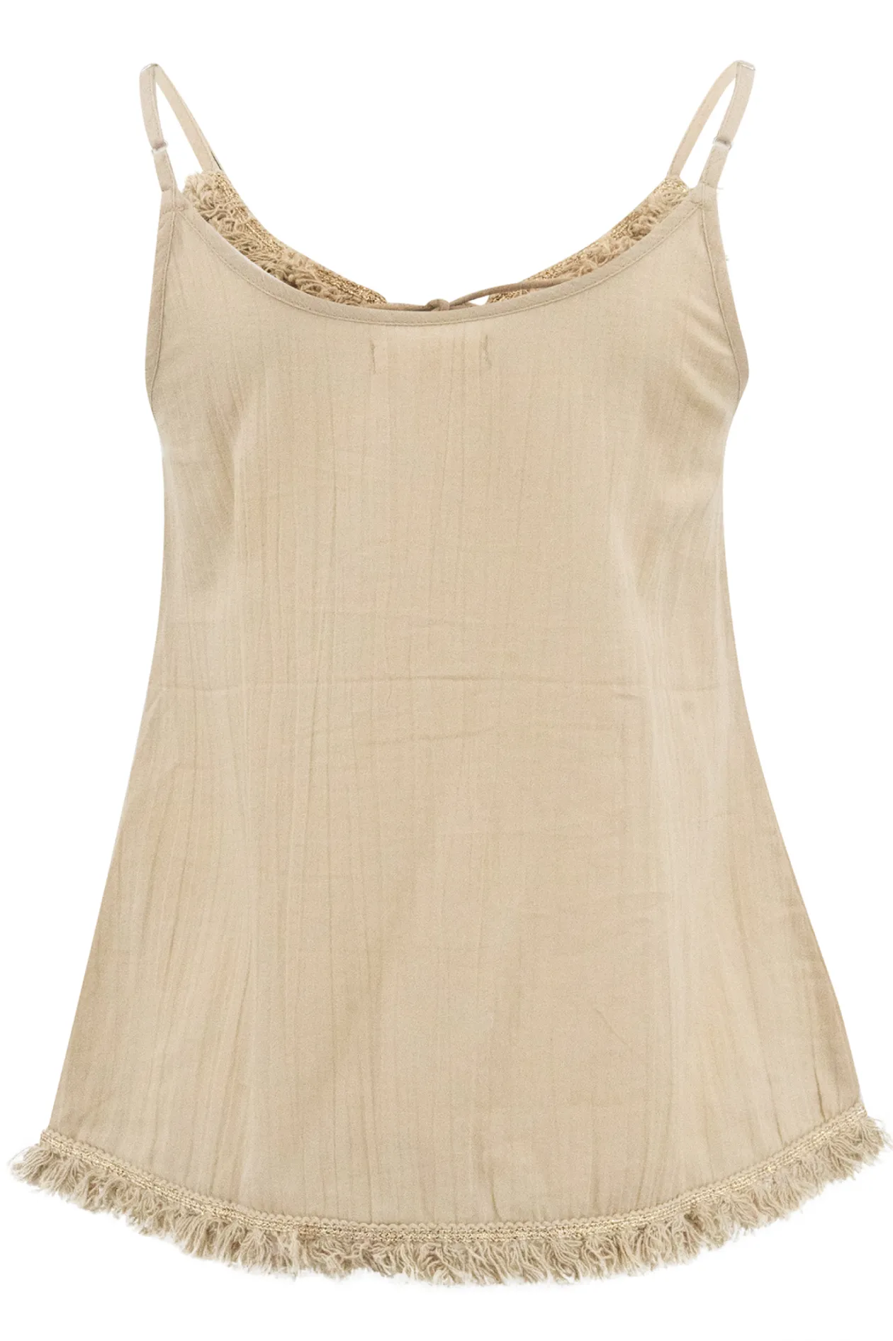 Entdecke das Strap Top Dalia Sand, dein neues Lieblingsstück für jede Gelegenheit. Dieses Top aus 100% Baumwolle bietet ultimativen Komfort mit verstellbaren Spaghettiträgern und raffinierten Häkeldetails mit goldenem Lurex. Kombiniere es mit einem hoch taillierten Rock oder einer Jeans für einen mühelosen, schicken Look. Fühle die Ibiza-Vibes!
