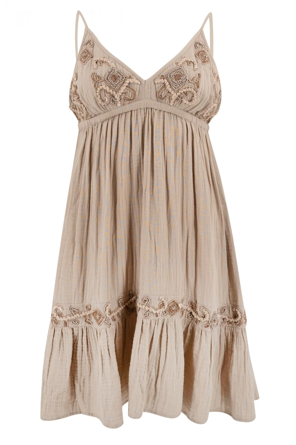 Entdecke das Trägerkleid Marfil Elegancia Light Taupe, die ultimative Mischung aus Eleganz und Ibiza-Flair. Mit seinen zarten Schulterträgern und den feinen Stickereien strahlt dieses Kleid mühelosen Luxus aus. Kombiniere es mit Sandalen für einen schicken Strandtag oder mit High Heels für einen Abend. Fühle dich unwiderstehlich!