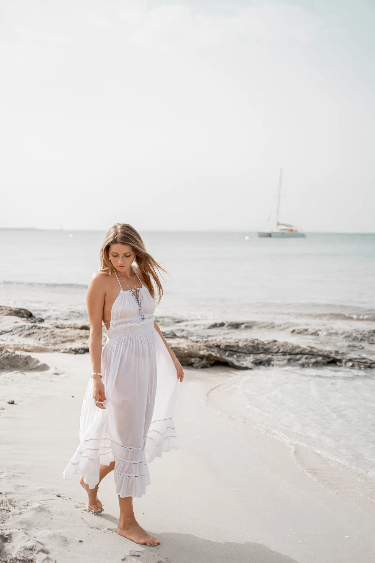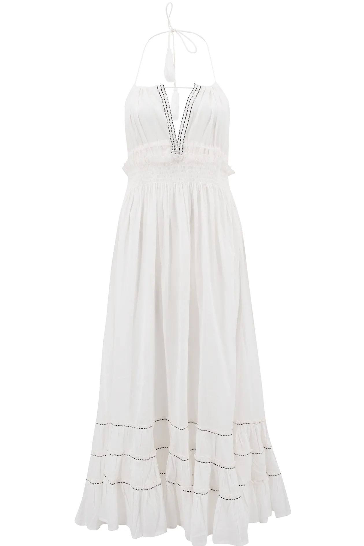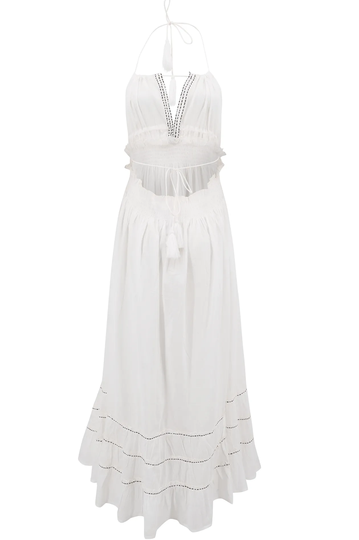 Das Halter Dress Mila White ist dein neues Sommer-Essential! Mit seinem luftigen Stoff aus 100 % Baumwolle und den eleganten Rüschen fühlst du dich sowohl bequem als auch stylisch. Der tiefe Rückenausschnitt und die Schleifen verleihen ihm einen verspielten Touch. Für einen schicken Ibiza-Look kannst du es perfekt mit Sandalen kombinieren. Umarme deinen einzigartigen Stil!