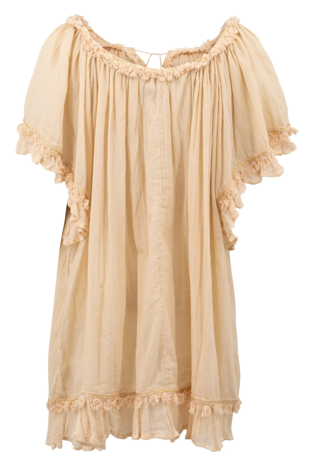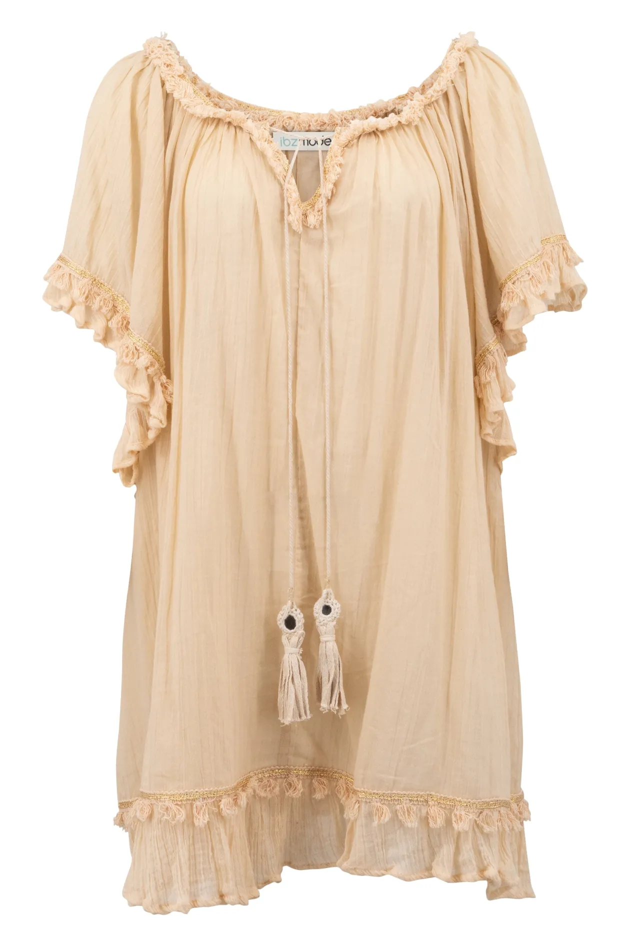 Entdecke den Zauber der Tunika Ana Peach, ein Meisterwerk im Boho-Chic, das mühelos Eleganz und Komfort vereint. Die Tunika aus 100 % Baumwolle mit goldenen Lurex-Details und verspielten Quasten ist perfekt für einen Tag am Strand oder einen lässigen Stadtbummel. Bringe einen Hauch von Ibiza in deinen Look und strahle selbstbewusst!