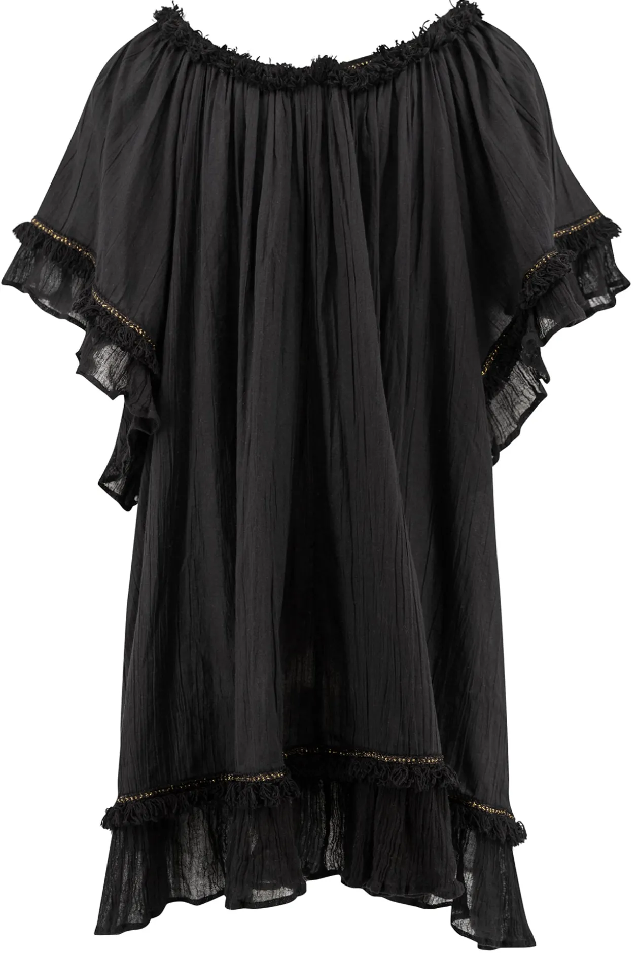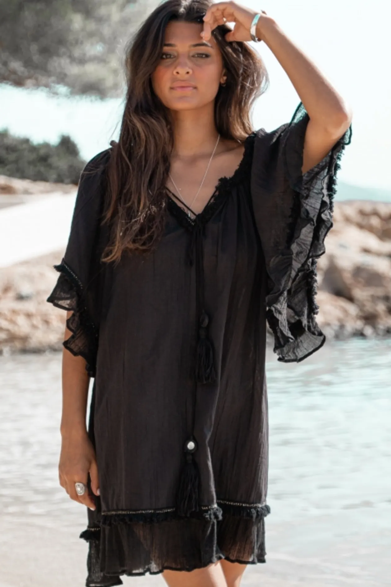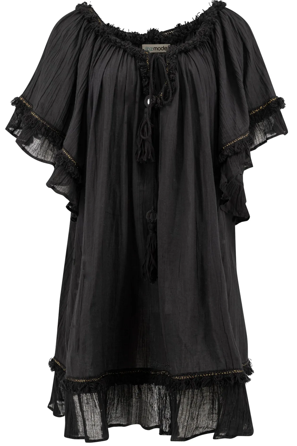 Entdecke den Zauber der Tunika Ana Black, eine perfekte Mischung aus Boho-Chic und Raffinesse. Aus 100% Baumwolle, mit Rüschen, goldenem Lurexgarn und verspielten Schnüren mit Quasten strahlt diese Tunika pure Eleganz aus. Kombiniere sie mit Sandalen für einen mühelosen Ibiza-Look und fühle dich unwiderstehlich!