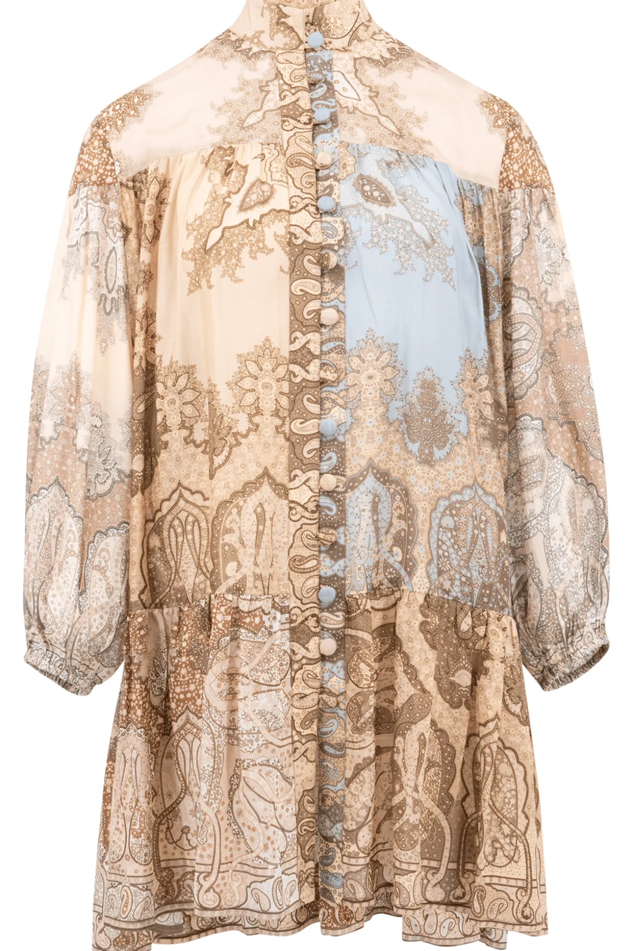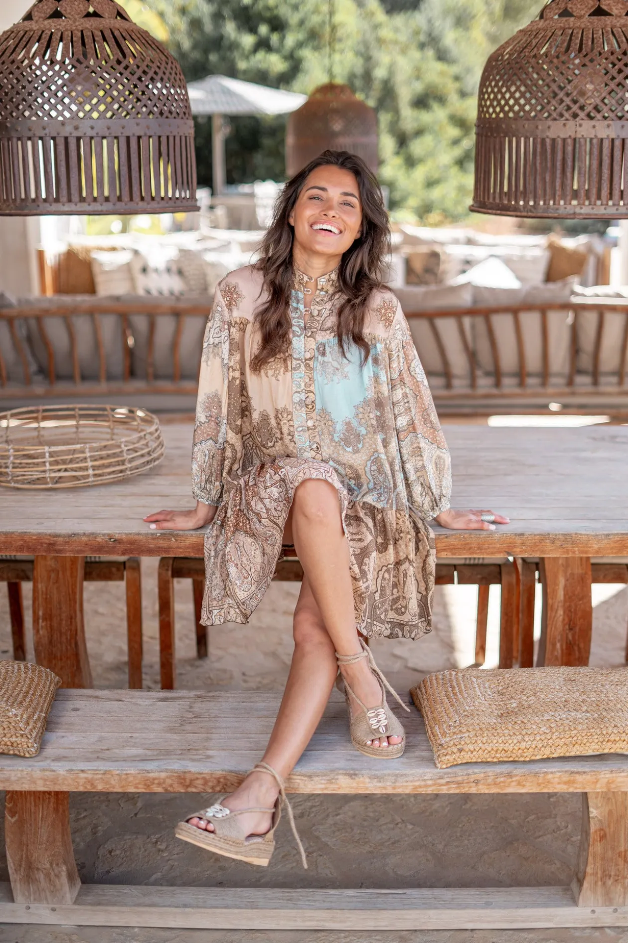 Entdecke die bezaubernde Tunika Bohé, eine perfekte Mischung aus Komfort und Stil. Sie ist aus glänzender 100%iger Viskose gefertigt, hat einen schönen Boho-Print und einen Stehkragen. Trage diese Tunika in Oversize-Passform mit Knöpfen vorne am Strand oder in der Stadt für einen mühelosen, schicken Look.