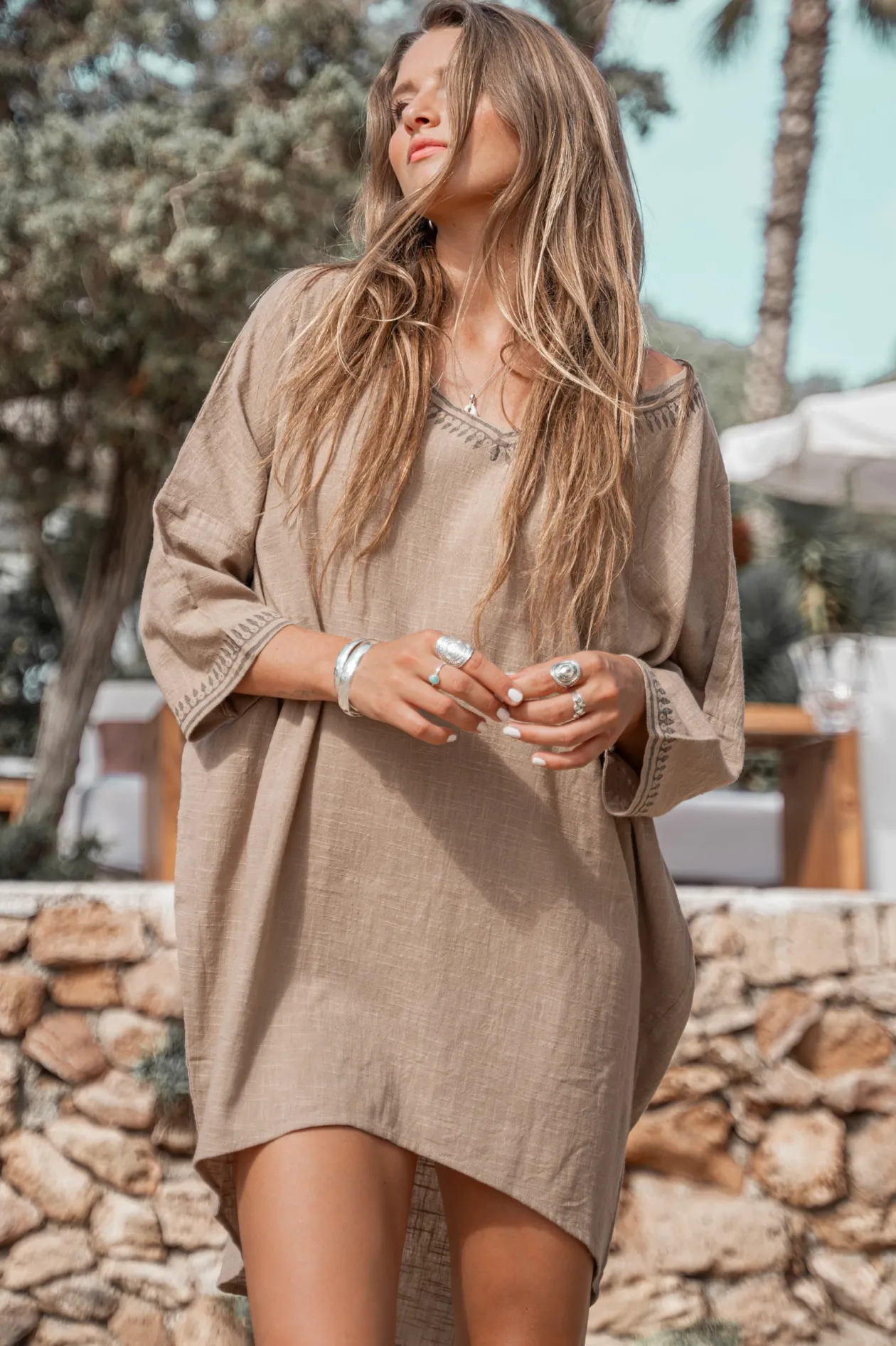 Entdecke den ultimativen Sommerstil mit der Tunika Emilia Resort Sand! Diese Tunika aus 100 % Baumwolle hat eine luftige Passform, einen verspielten V-Ausschnitt und halblange Ärmel. Sie eignet sich perfekt für einen Tag am Strand oder eine Nacht im Freien und versprüht mühelos Ibiza-Vibes. Trage es mit Sandalen für einen lässigen Look oder mit Absatzschuhen für einen eleganten Touch. Fühle dich frei und stilvoll in jeder Situation!