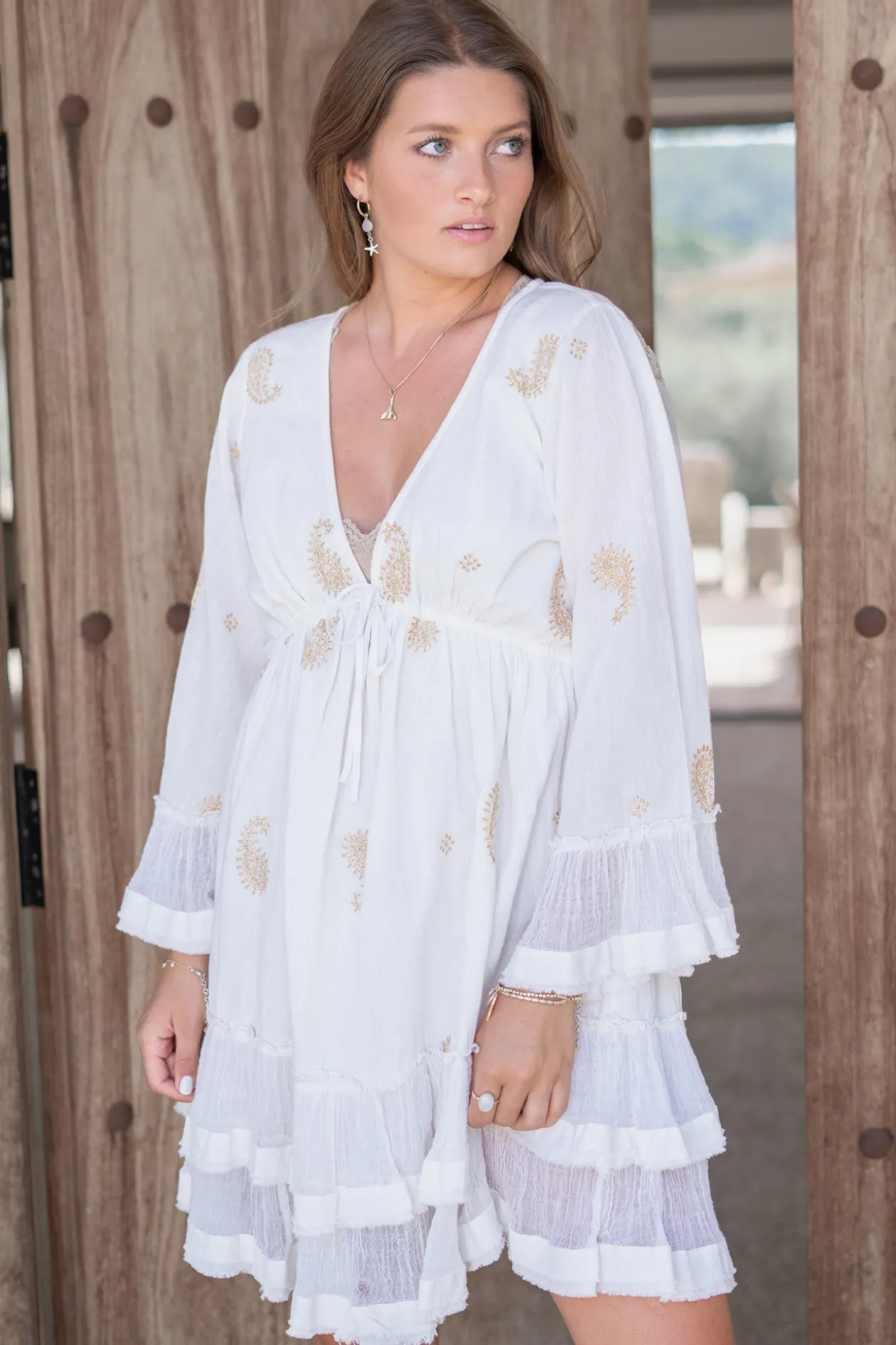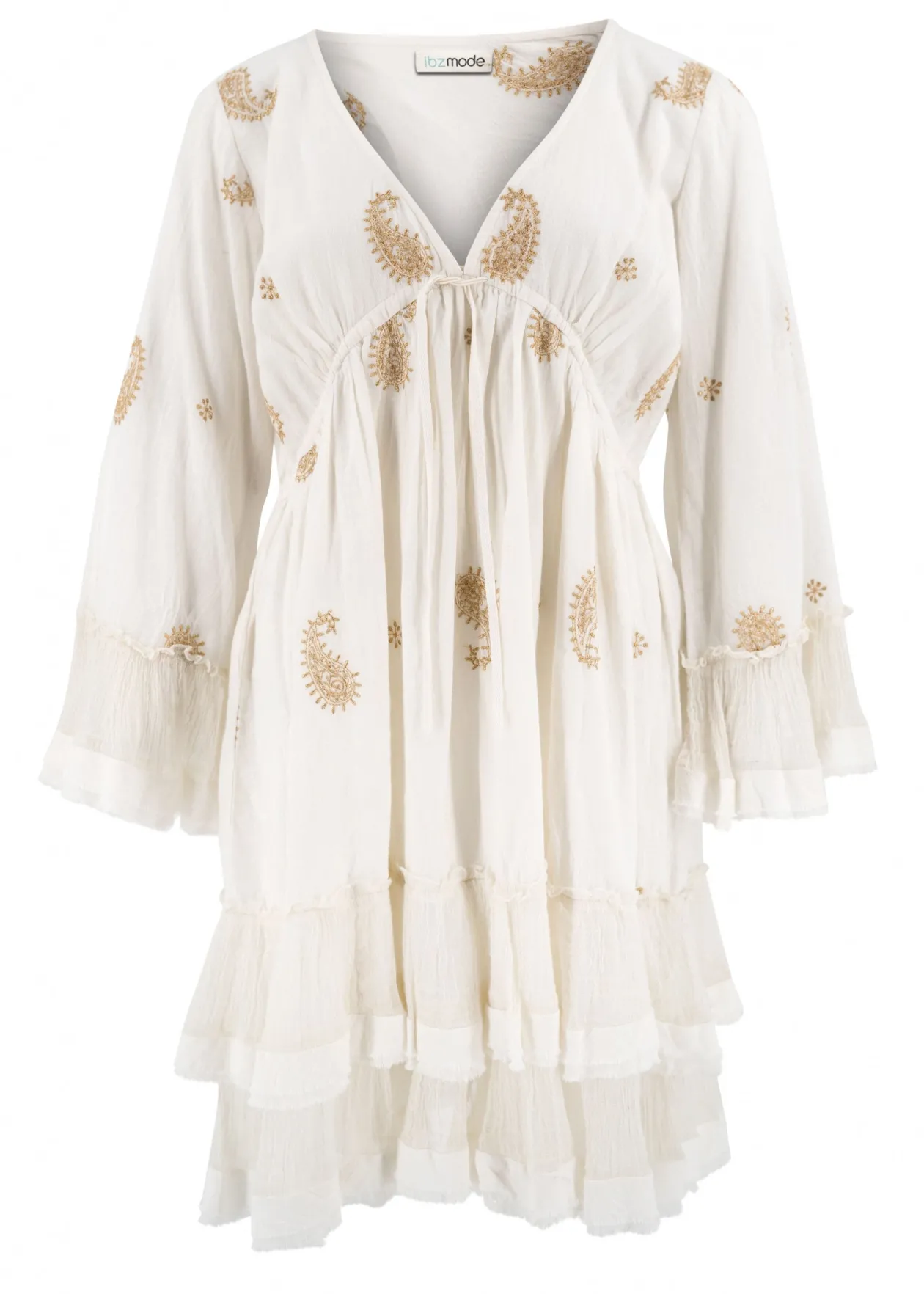 Tauche ein in die Welt der mühelosen Eleganz mit der Tunika Luna Esencia Ivory. Diese Baumwollschönheit mit goldbestickten Details und Trompetenärmeln umarmt dich mit einem Hauch von Luxus. Kombiniere sie mit Riemchensandalen für den ultimativen Ibiza-Style. Lass deinen Stil erstrahlen und fühle dich unwiderstehlich!